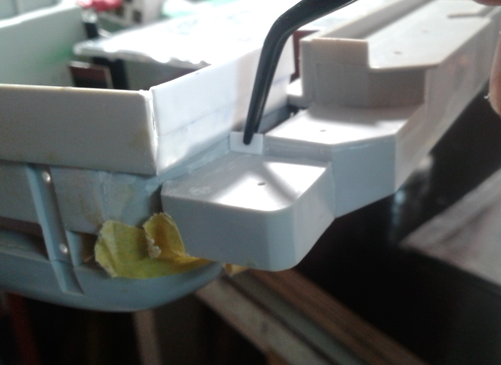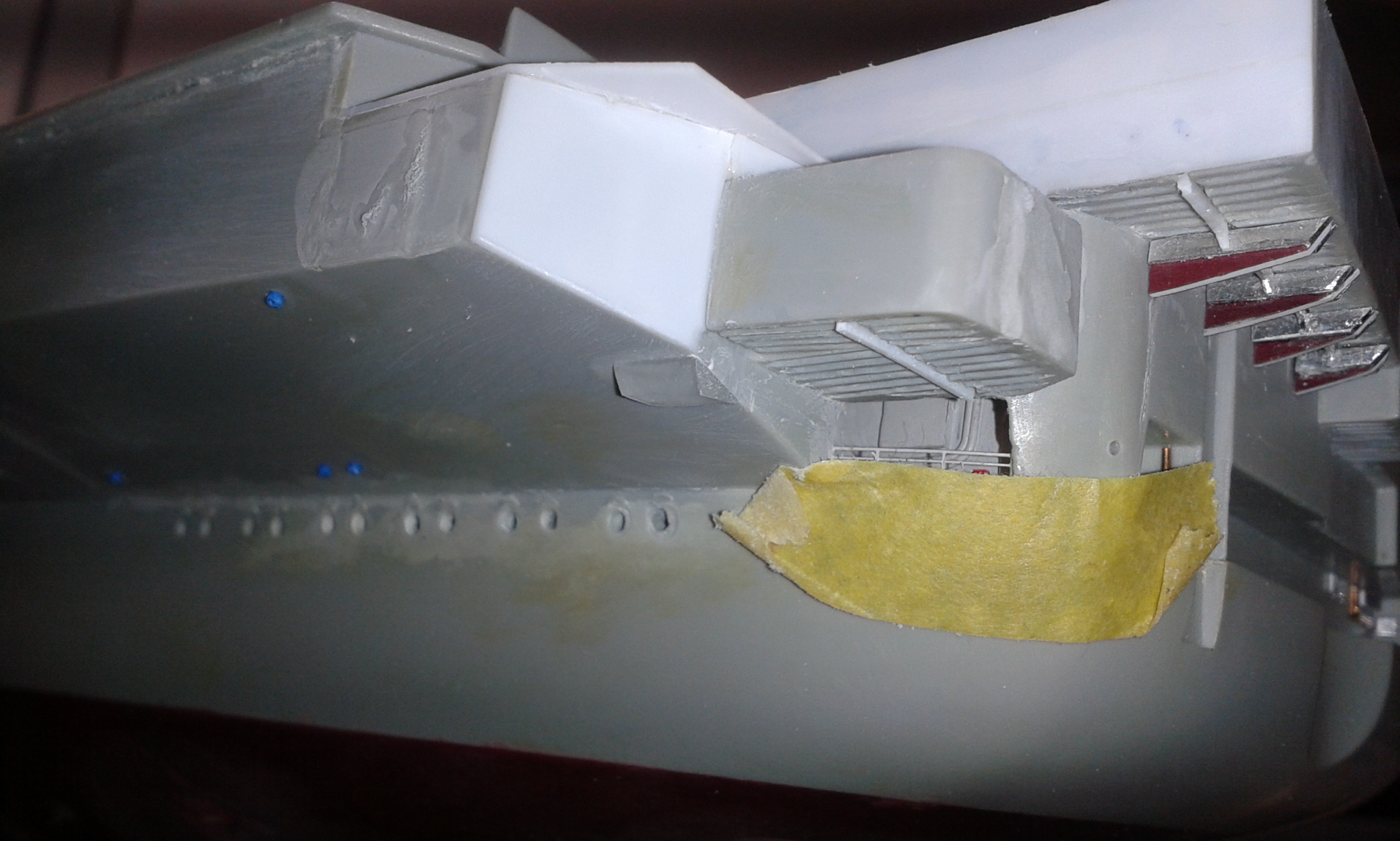 Пришлось отдирать детали от палубы (на палубе образовалось жирное пятно), зачищать палубу и выкидывать детали, изготавливая и устанавливая на штатное место уже новые детали без следов клея от скотча....