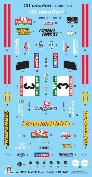 У меня есть такой же, только от Тамии в 20-м масштабе. Кстати, так же как и Тамия, Итал даёт неверную модификацию 131-го под эту ливрею (OLIO FIAT), облицовка радиатора должна быть с четырьмя одинаковыми по размеру фарами. Но в отличие от Тамии, Италовские декали полностью комплектны, я имею ввиду лого "Cinzano" к Тамии пришлось отдельно покупать...
