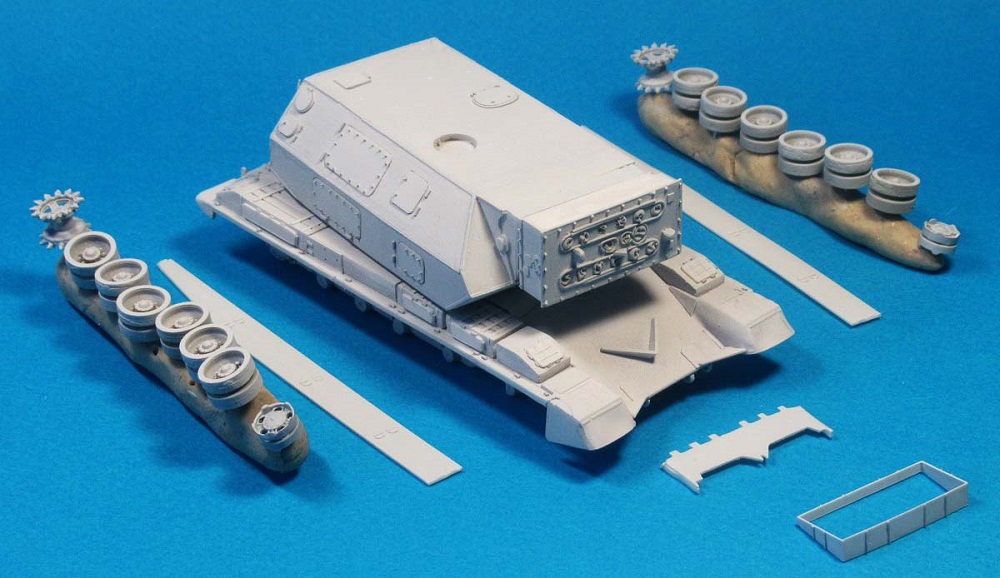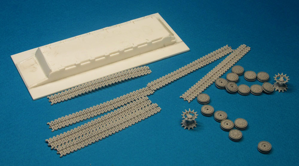 Опорные и ведущие катки - смоляные. Направляющие катки - пластиковые. Траки - смесь резиновых и пластиковых. Фальшборта - самодельные пластиковые.