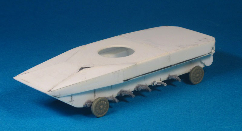 Отработал днище модели. С помощью роллтонпласта имитировал лючки, тянутым литником и тем же роллтонпластом обозначил защитные решётки водомётных каналов.