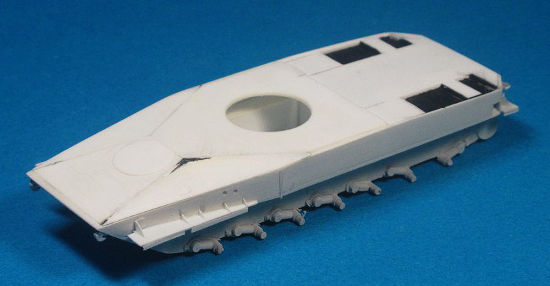 Поработал с деталировкой верхних листов и загрунтовал корпус. Выявил косячки и зашпатлевал эти участки. Уделил внимание и башне:  заполнил пустоты эпоксилином.