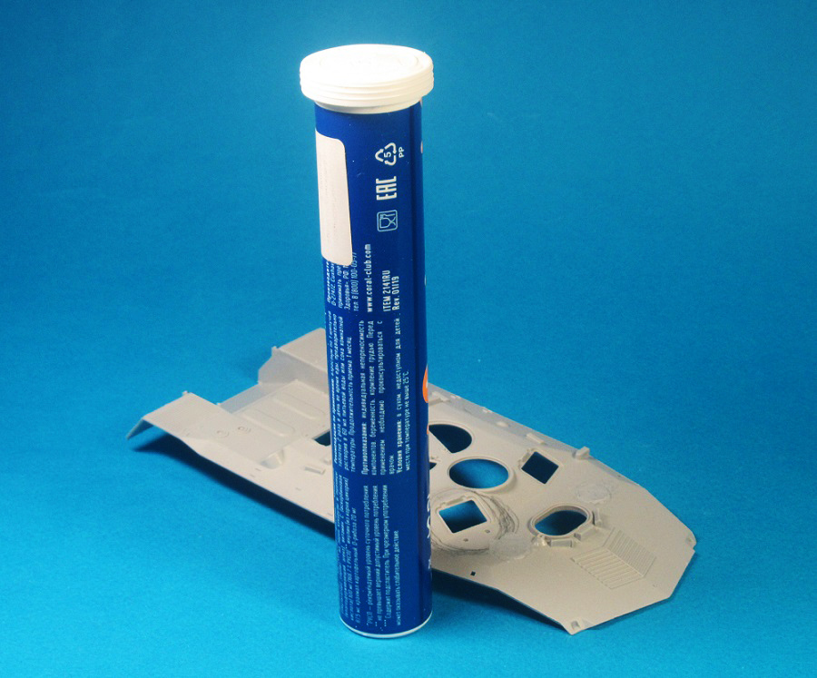 Чтобы при монтаже крышка корпуса не проваливалась, приклею кусочки пластика по периметру. У кормы уже приклеил. Также нашёл основу для "бочки".