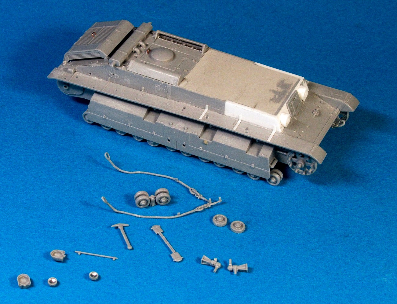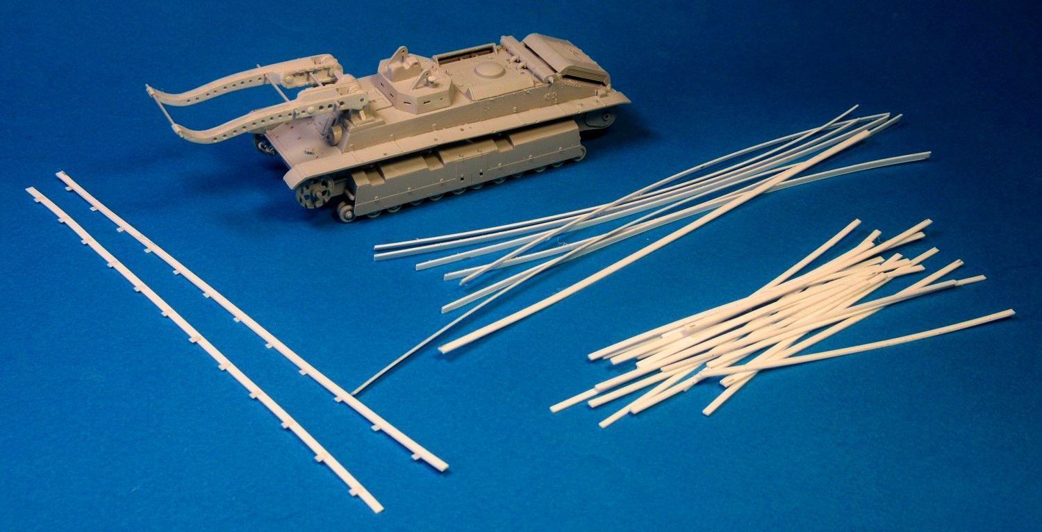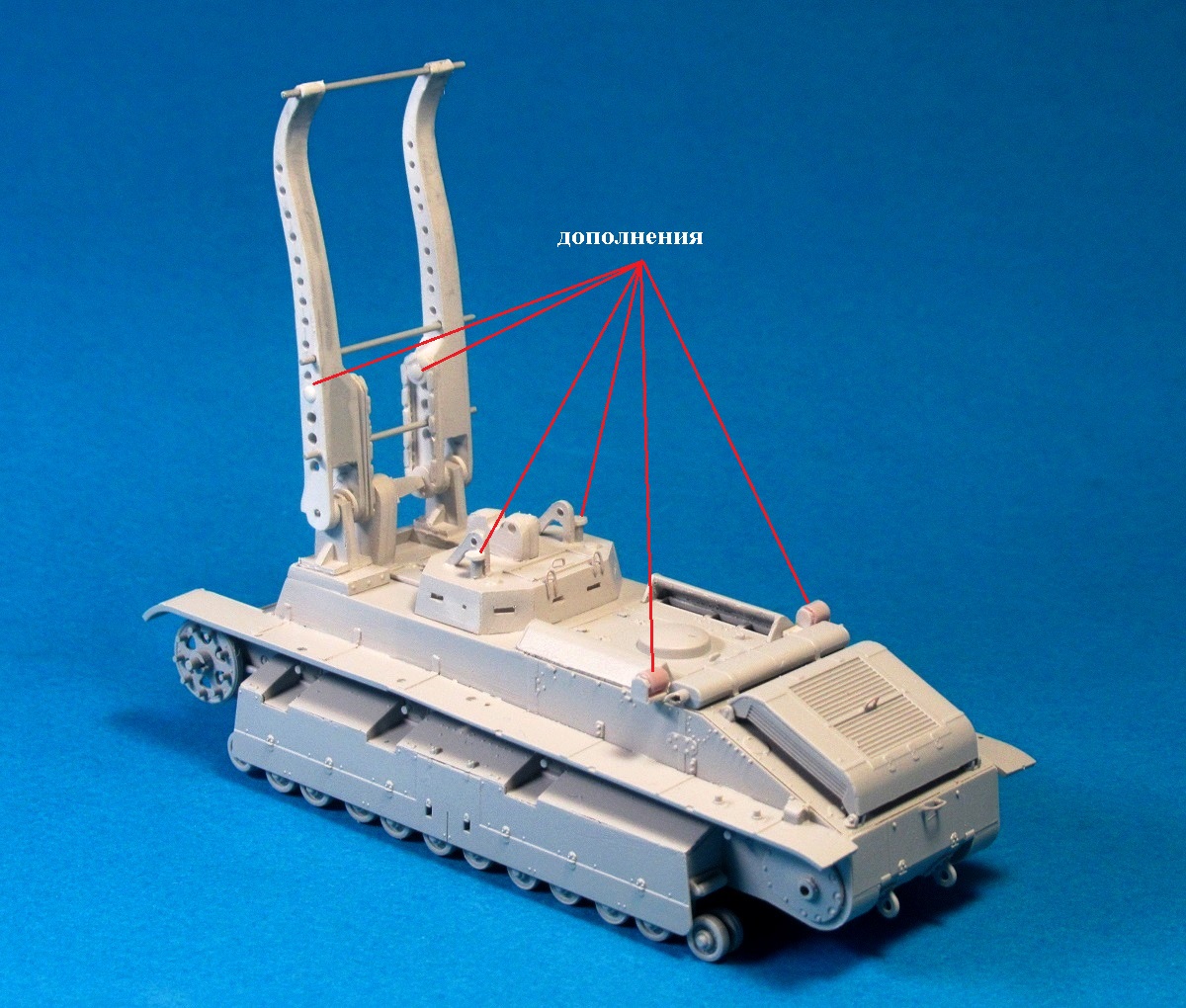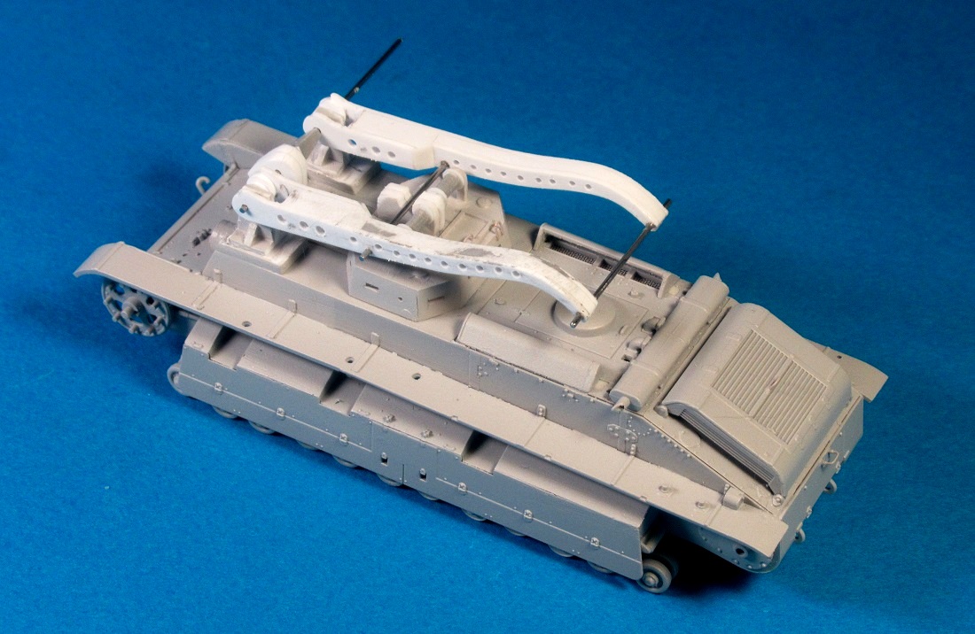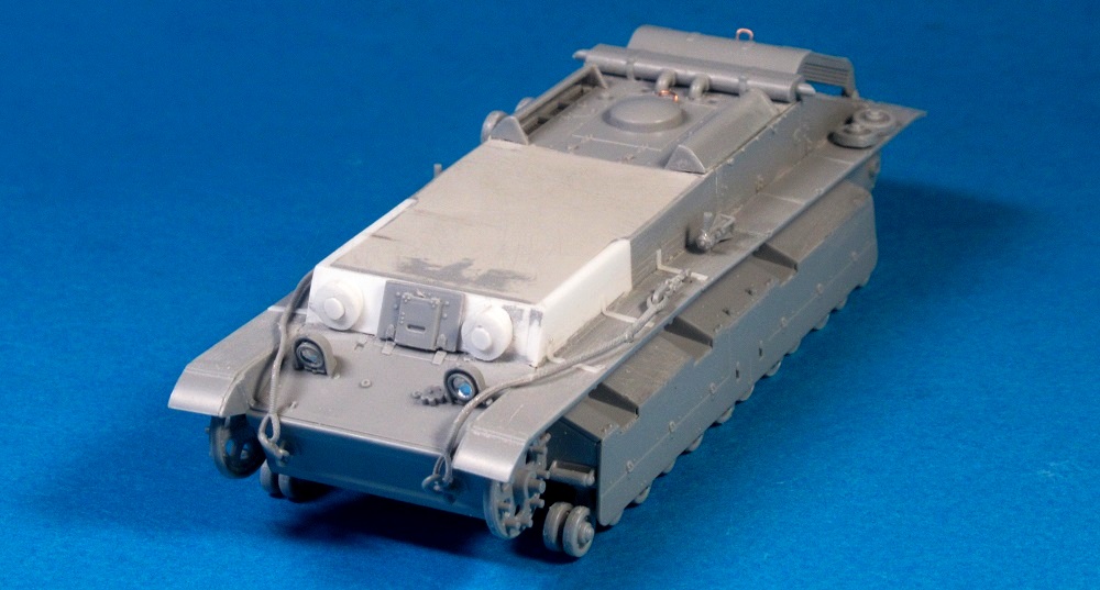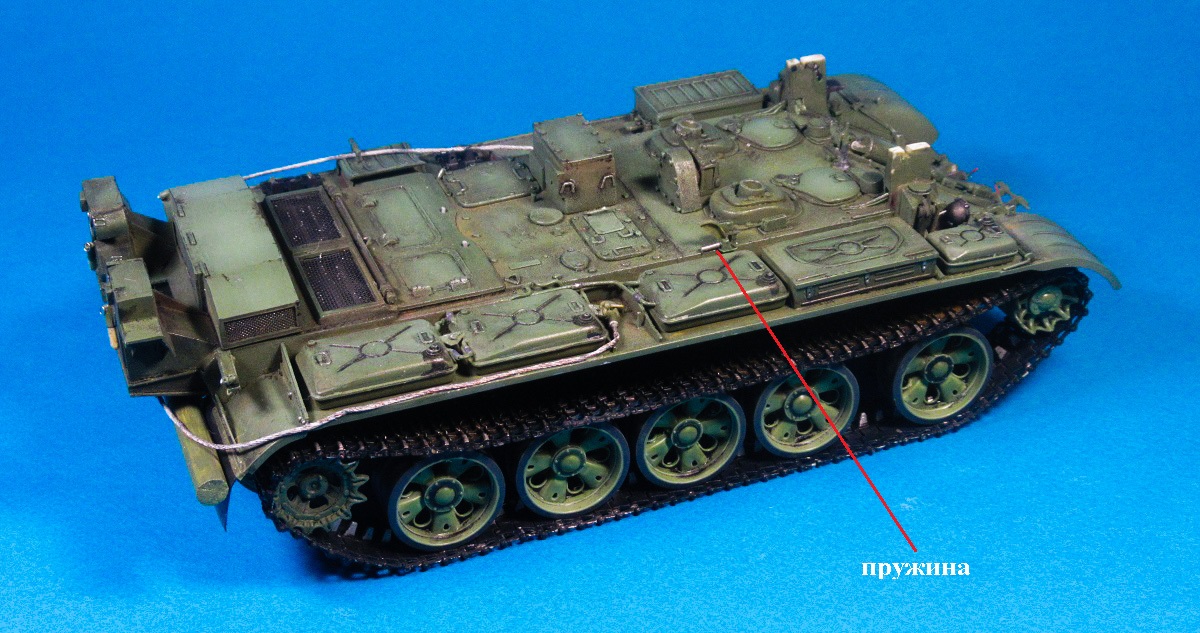 Полосками из роллтонпласта имитировал крепление запасных траков, "протянул" проводку из тянутого литника защитного цвета к кормовым "огням", из резины китайской шапочки для плавания вырезал брызговики, после чего закрепил левый трос.
