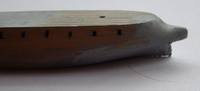Шпатлёвки у меня не было и вместо неё использовал вусмерть загустевший мебельный лак, тёмные пятна в носовой и кормовой оконечностях.