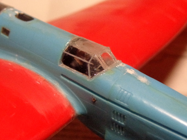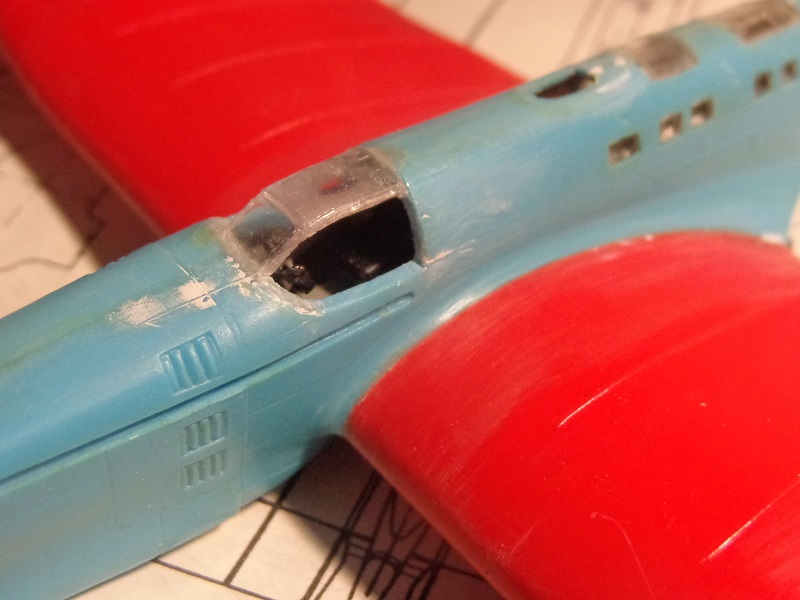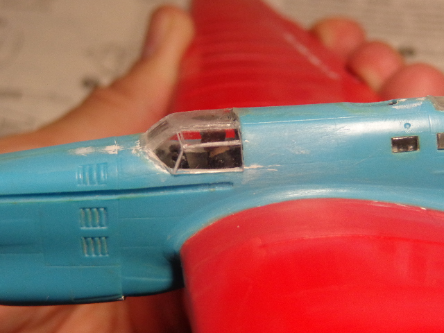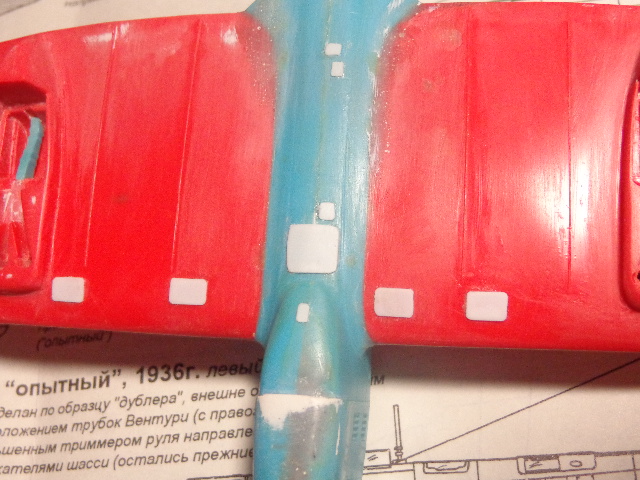 Итак. Ещё раз всё просмотрел. Впечатления ужасные. Отчасти беды "растут" с того момента, когда еще двадцать лет назад, я просто склеил модель, как она есть, без особой подготовки-подгонки деталей. В результате половинки фюзеляжа не симметричны друг другу. Уже не поправимо. Задние кромки крыльев получились невероятной толщины. Как-то немного сейчас их сточил. Придется демонстрировать модель только с передних ракурсов.   Крылья разной толщины. Левое на 1-1,5 мм толще правого.  При этом если на правом есть характерный излом крыла в районе стойки шасси, то на правом крыле "излом" происходит на расстоянии сантиметров двух от стойки.   Кроме того правая консоль у меня немножко загибалась вниз. Сейчас "разодрал" эту консоль и склеил заново. Вроде консоль "ушла" вверх. Отодрал также элероны, привел в надлежащий вид и снова вклеил, а то смотрелись скверно. Заодно прошпаклевал все углубления на крыльях.