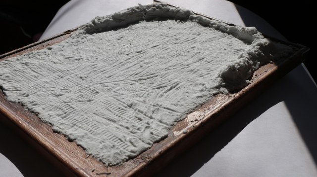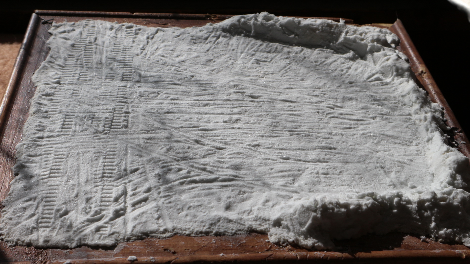 Выглядит как сравнительно свежий но утоптанный и наезжанный снег. Совсем плотную и гладкую поверхность сделать не получилось потому-что соды немного переложил. К тому-же она по помолу оказалась крупнее (брал 2-й сорт).