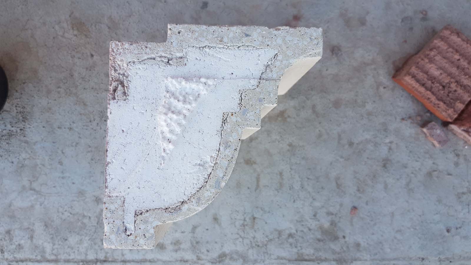 Вот так выглядят декоры в разрезе. Корка из бетона 10-12 мм. Этот образец пролежал под дождями и снегом открытым краем наружу с осени прошлого года. Изменений не претерпел