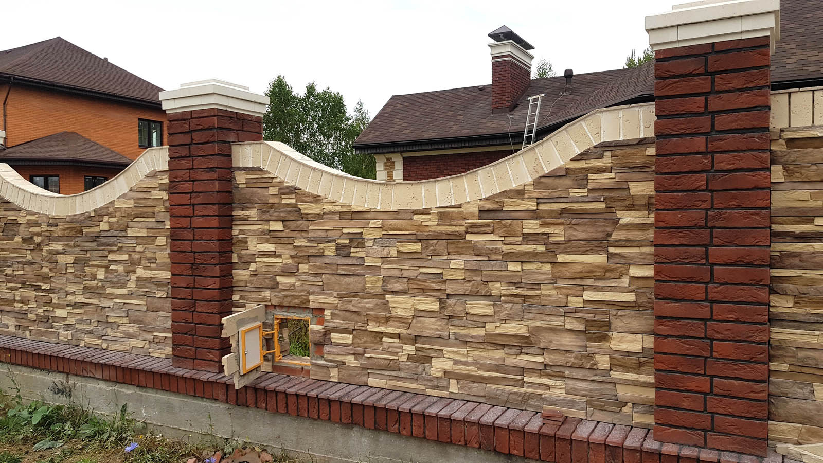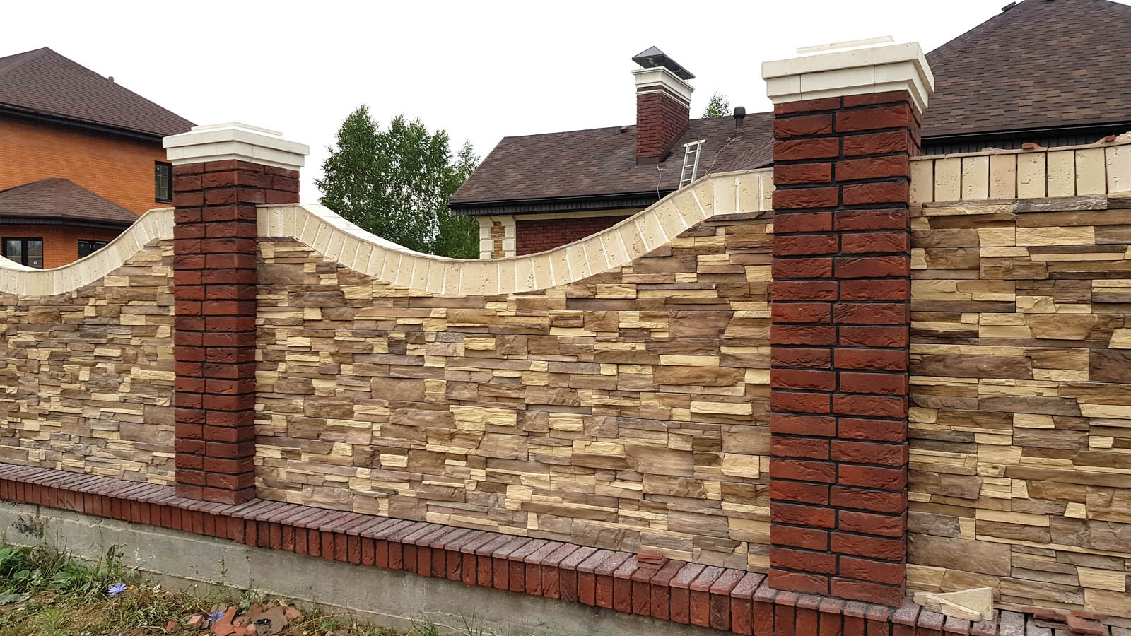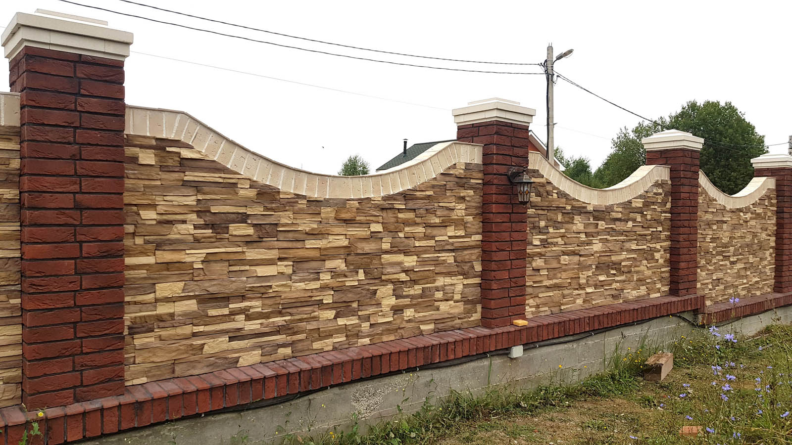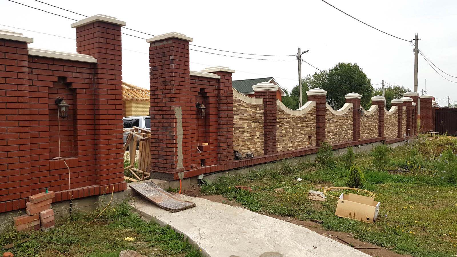 Забор подходит к концу. С поправкой на просто космическое количество не дешевого клея можно сказать, что по деньгам (строить все из облицовочного кирпича или из рабочего с облицовкой камнем) выходит тож на тож, но выигрыш в красоте все-равно конский. Так что я не жалею о принятом решении