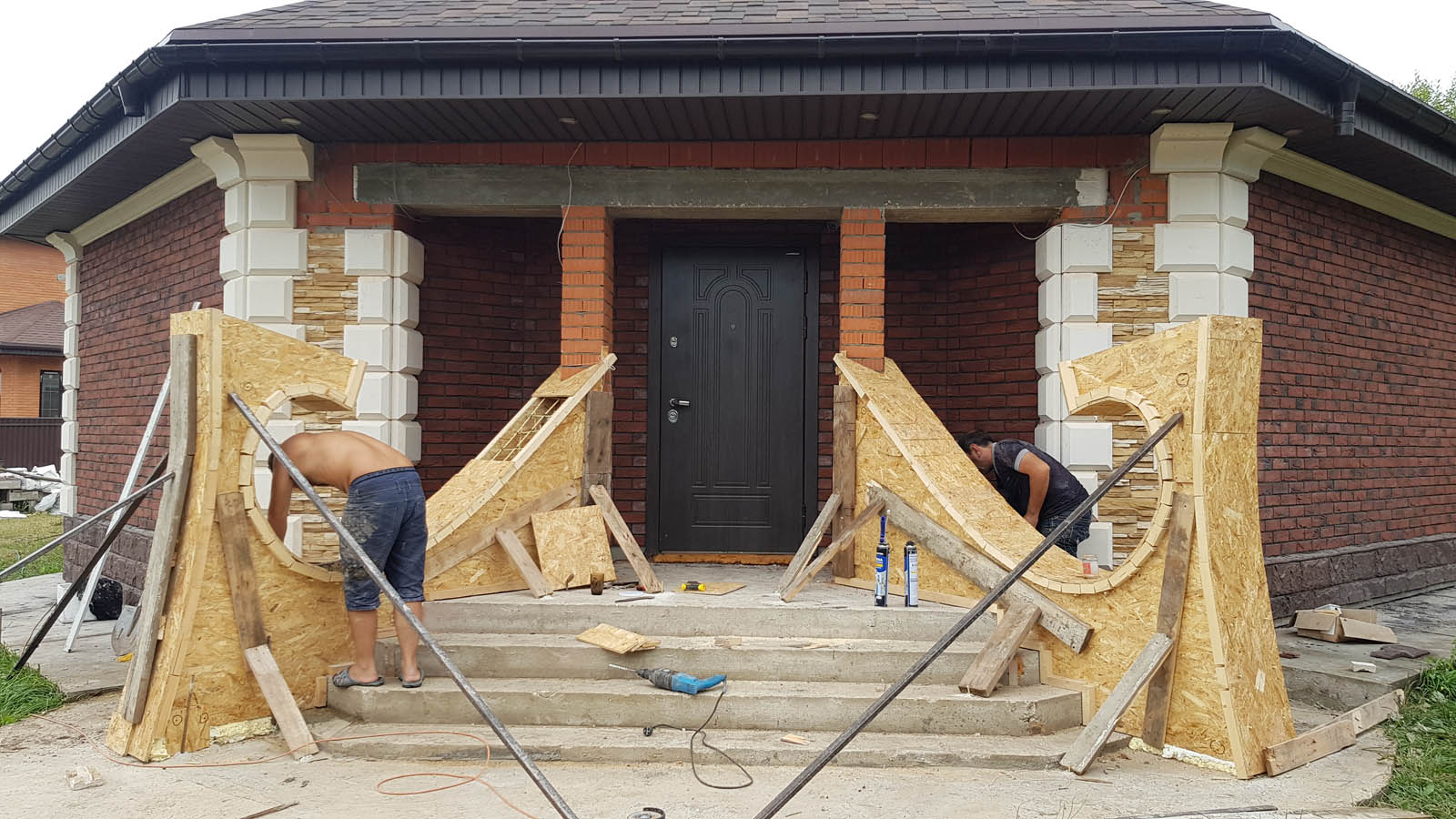 Параллельно занялся входной группой. Опалубку пилонов построил сам - такую сложную форму не решился кому-то доверить. Применено ОСП 12 мм с усилением брусом 40*50 мм. Армирую стеклопластиковой арматурой 10 мм