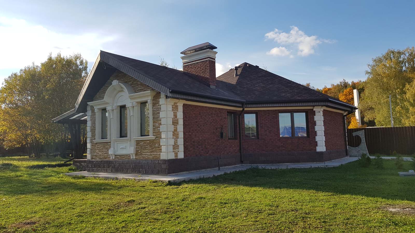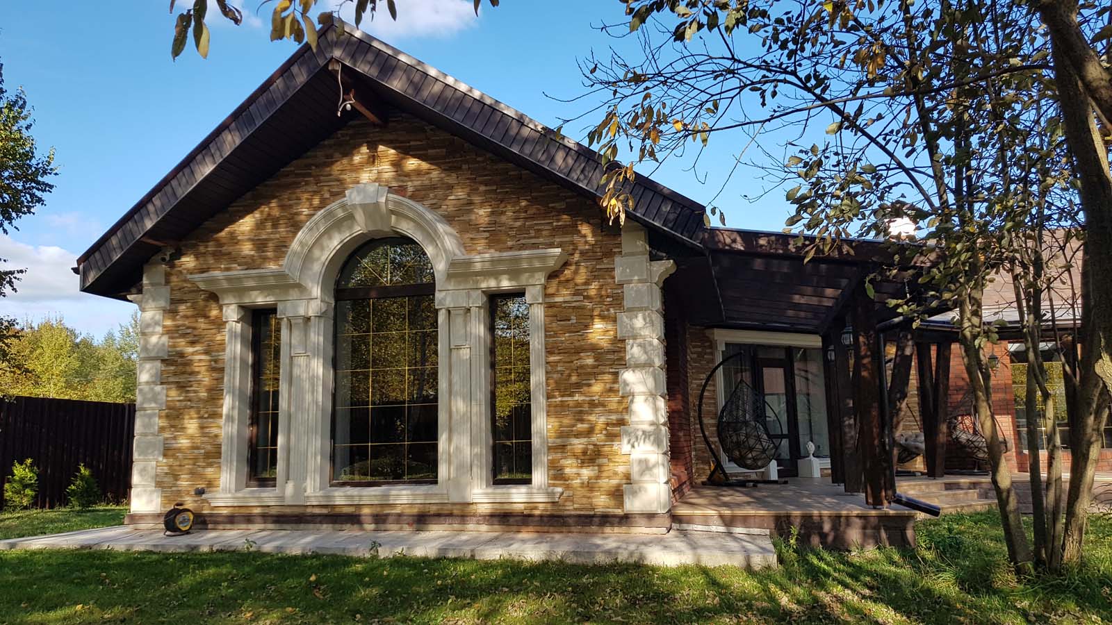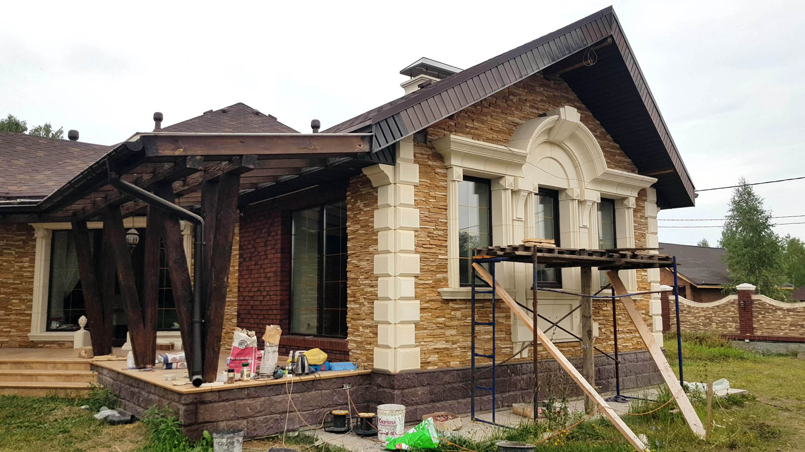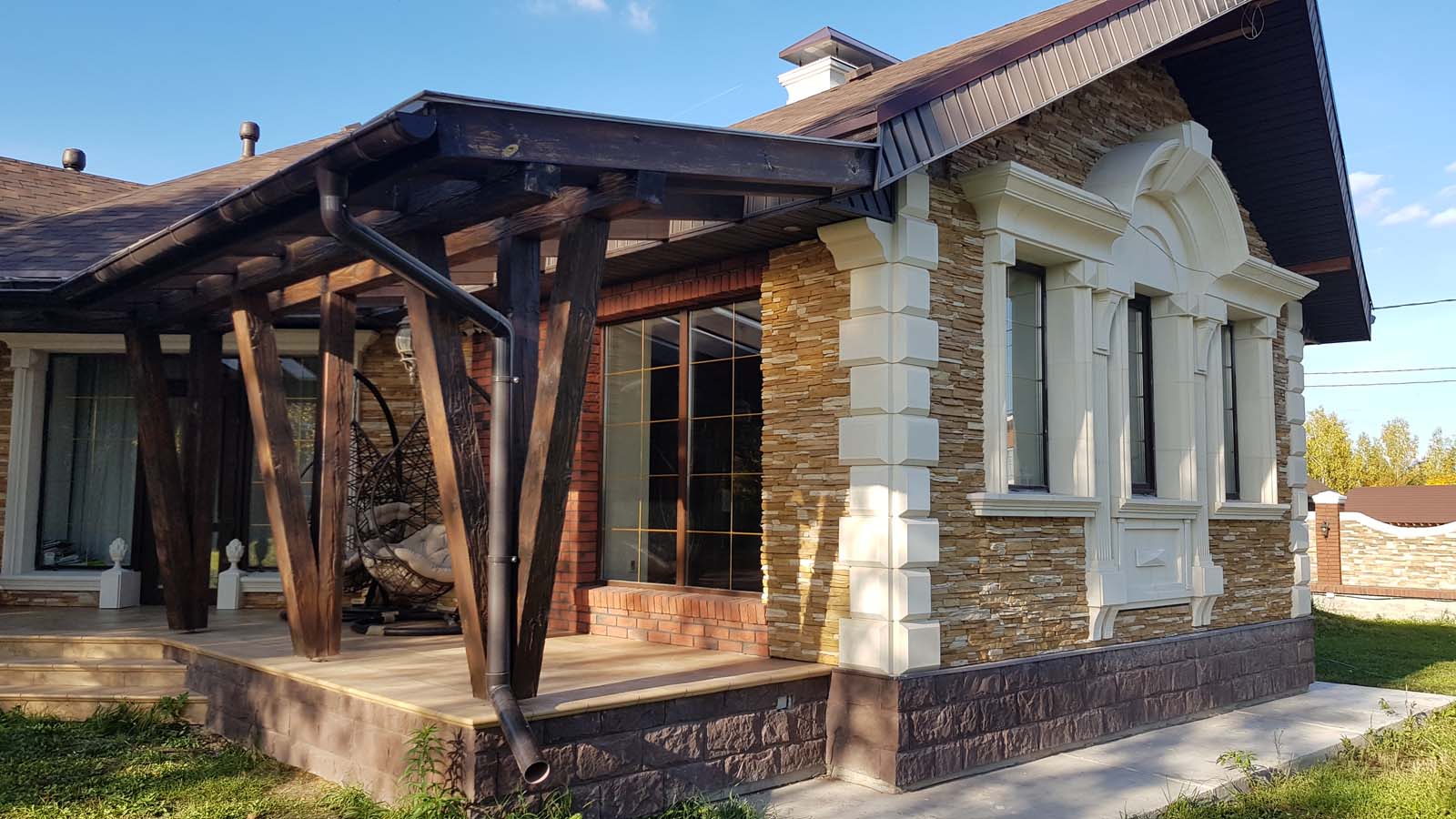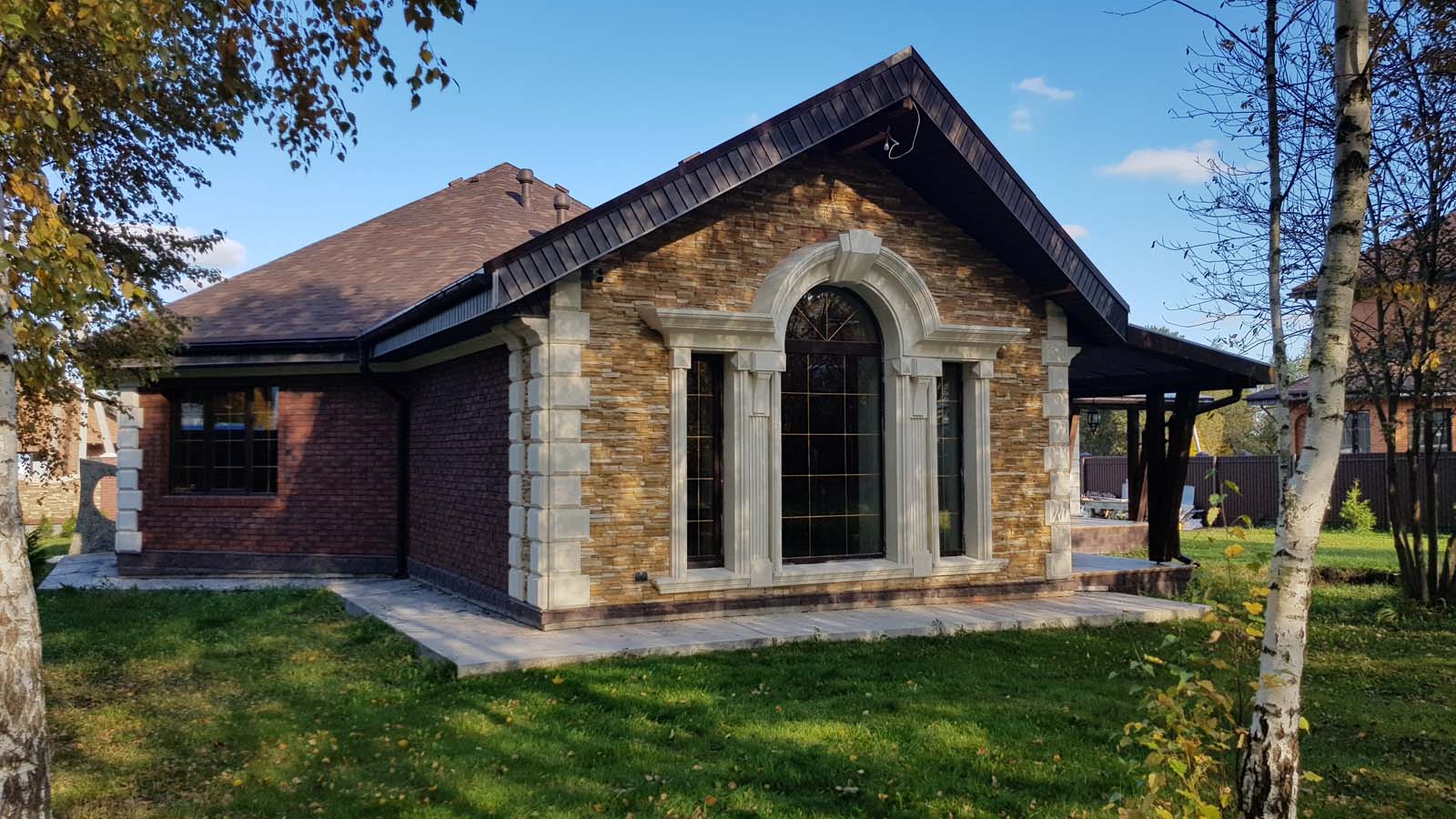 Ну все, наконец-то снял леса, вывез 5 м3 мусора и можно полюбоваться на результат. Не успел в этом году сделать гидрофобизацию всего фасада, т.к. начались дожди. Также, надо придумать как облицевать верхнюю часть (над проемом) входа в дом, ну и, соответственно, накопить на облицовку этих бивней...