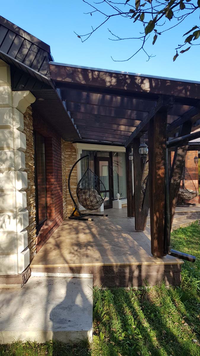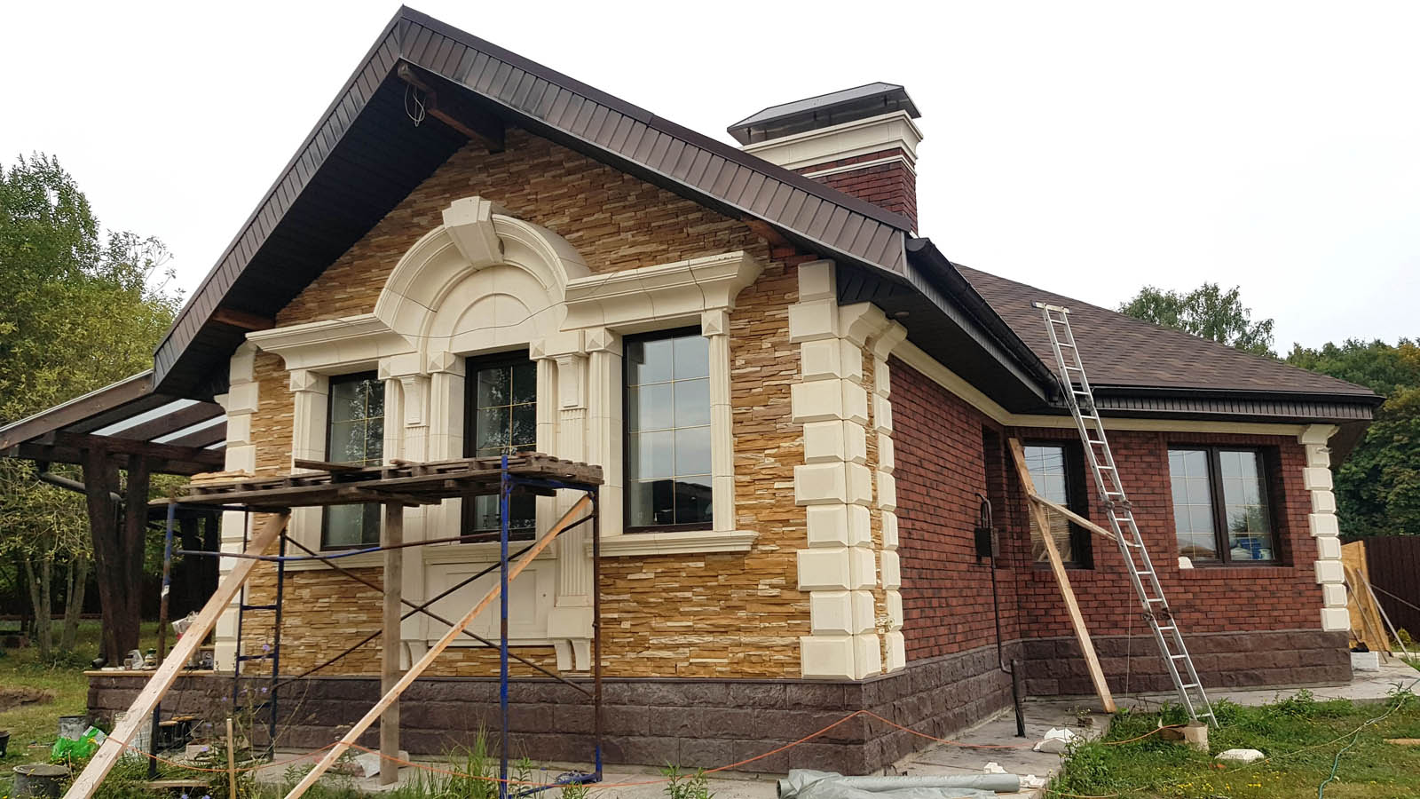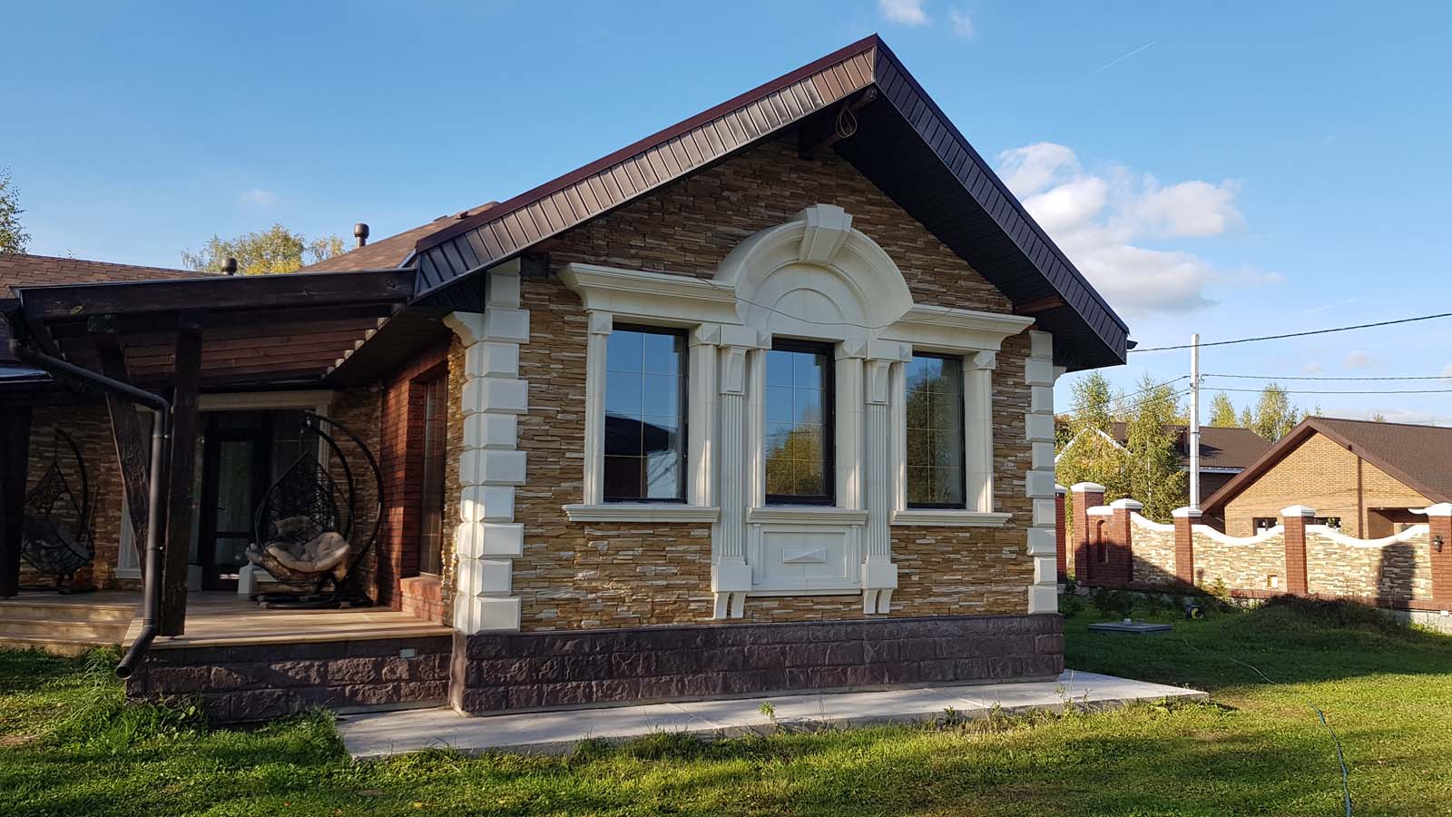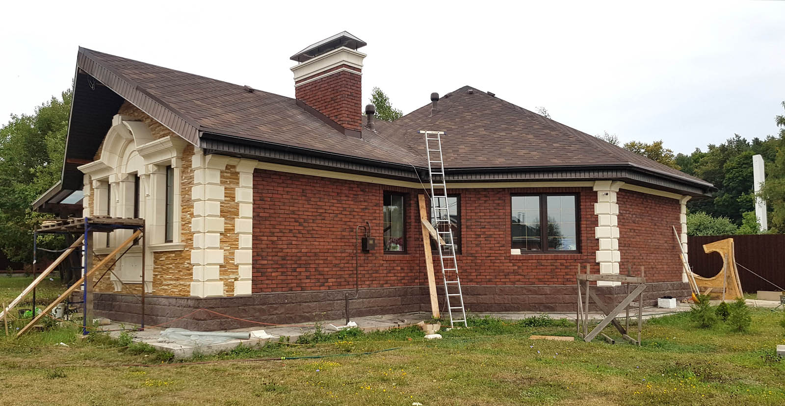 Ну все, наконец-то снял леса, вывез 5 м3 мусора и можно полюбоваться на результат. Не успел в этом году сделать гидрофобизацию всего фасада, т.к. начались дожди. Также, надо придумать как облицевать верхнюю часть (над проемом) входа в дом, ну и, соответственно, накопить на облицовку этих бивней...