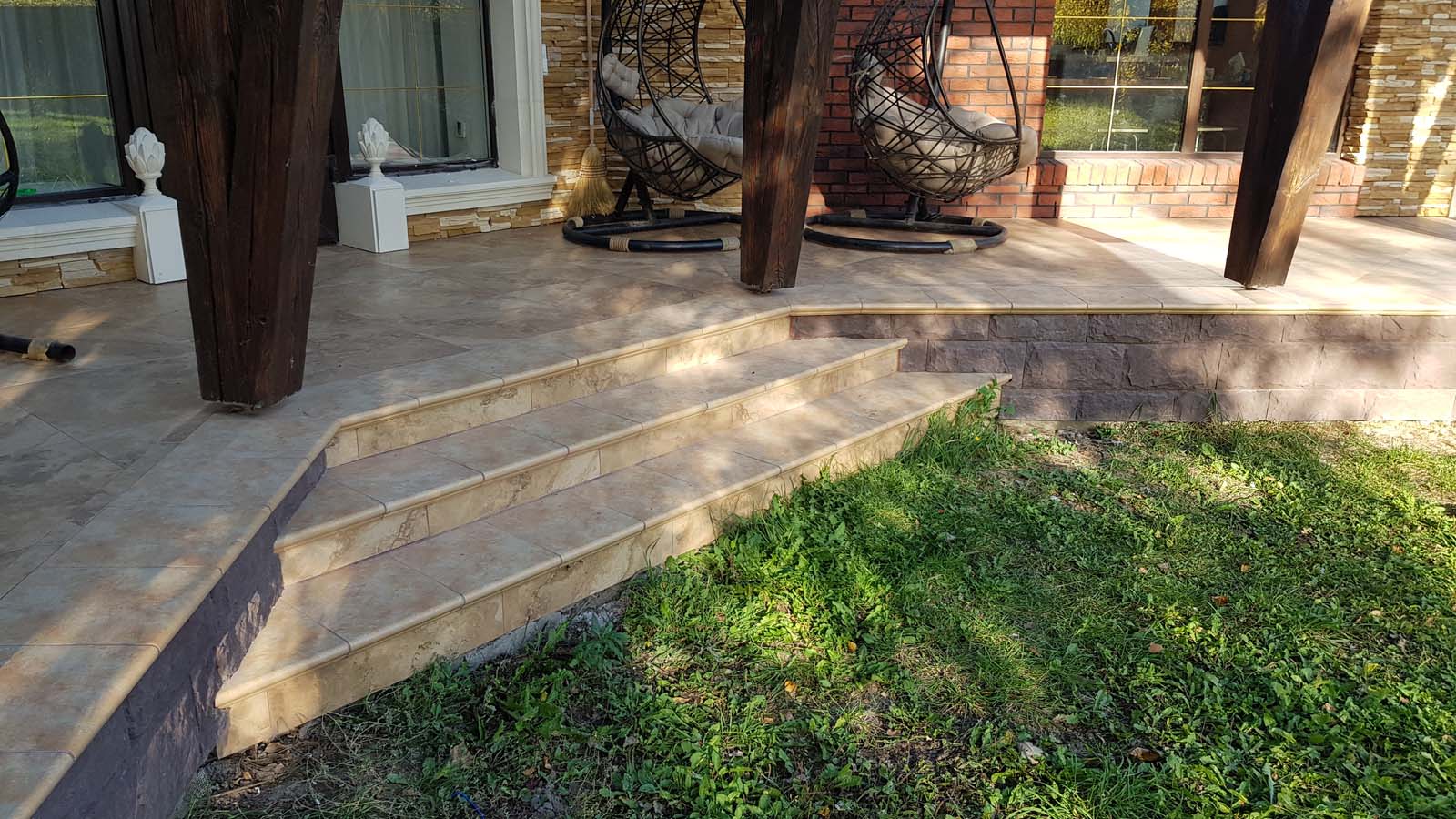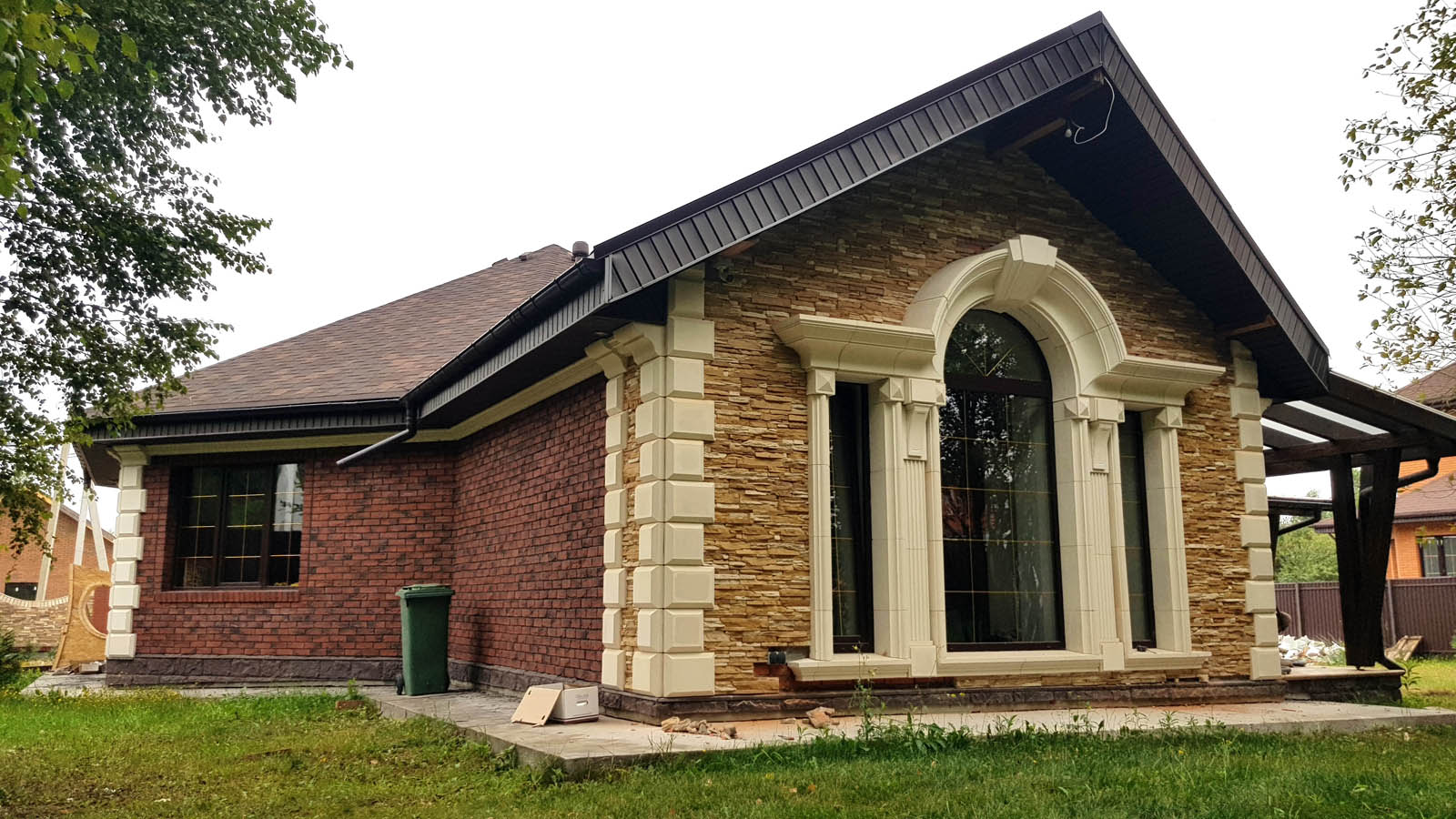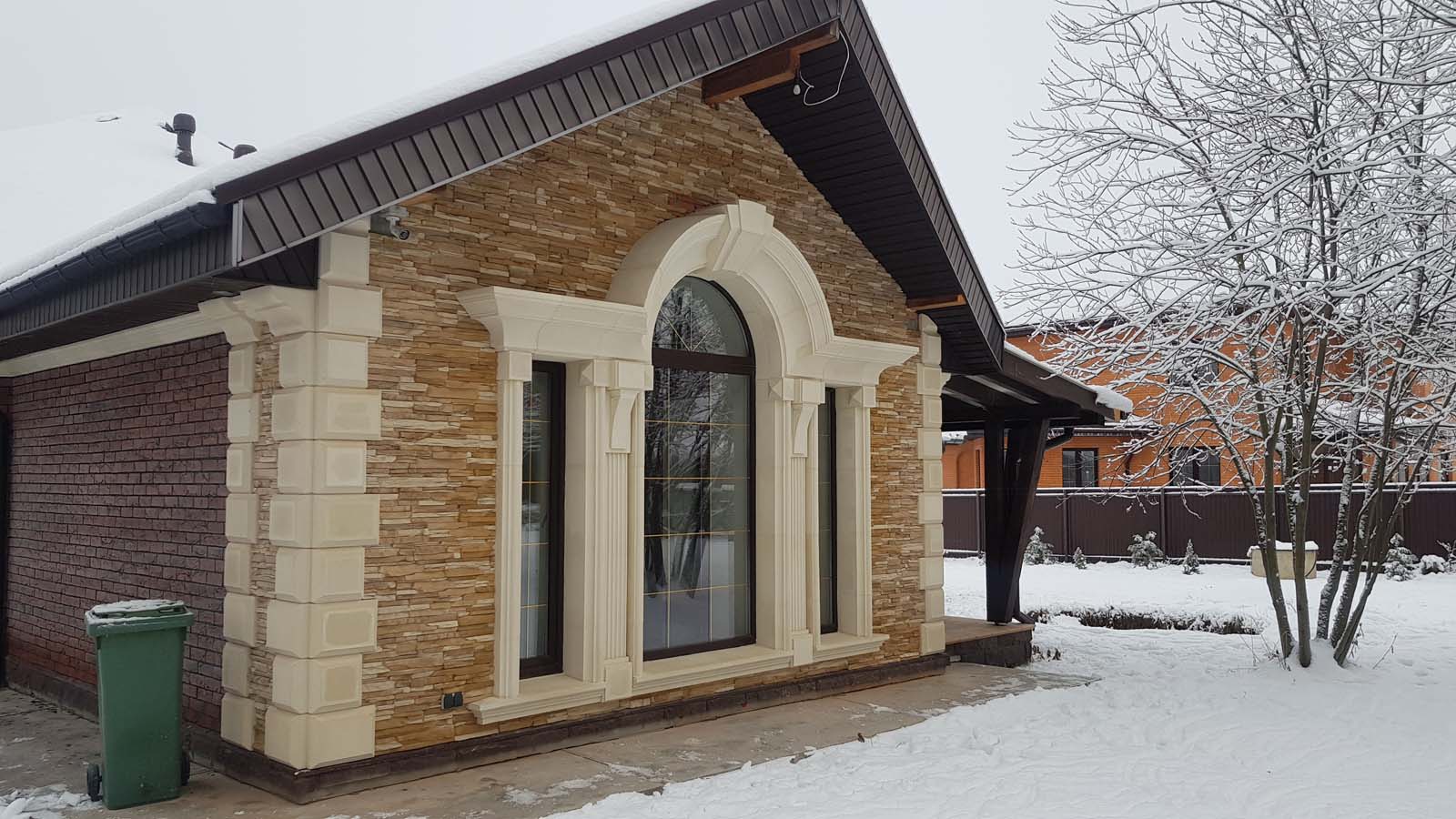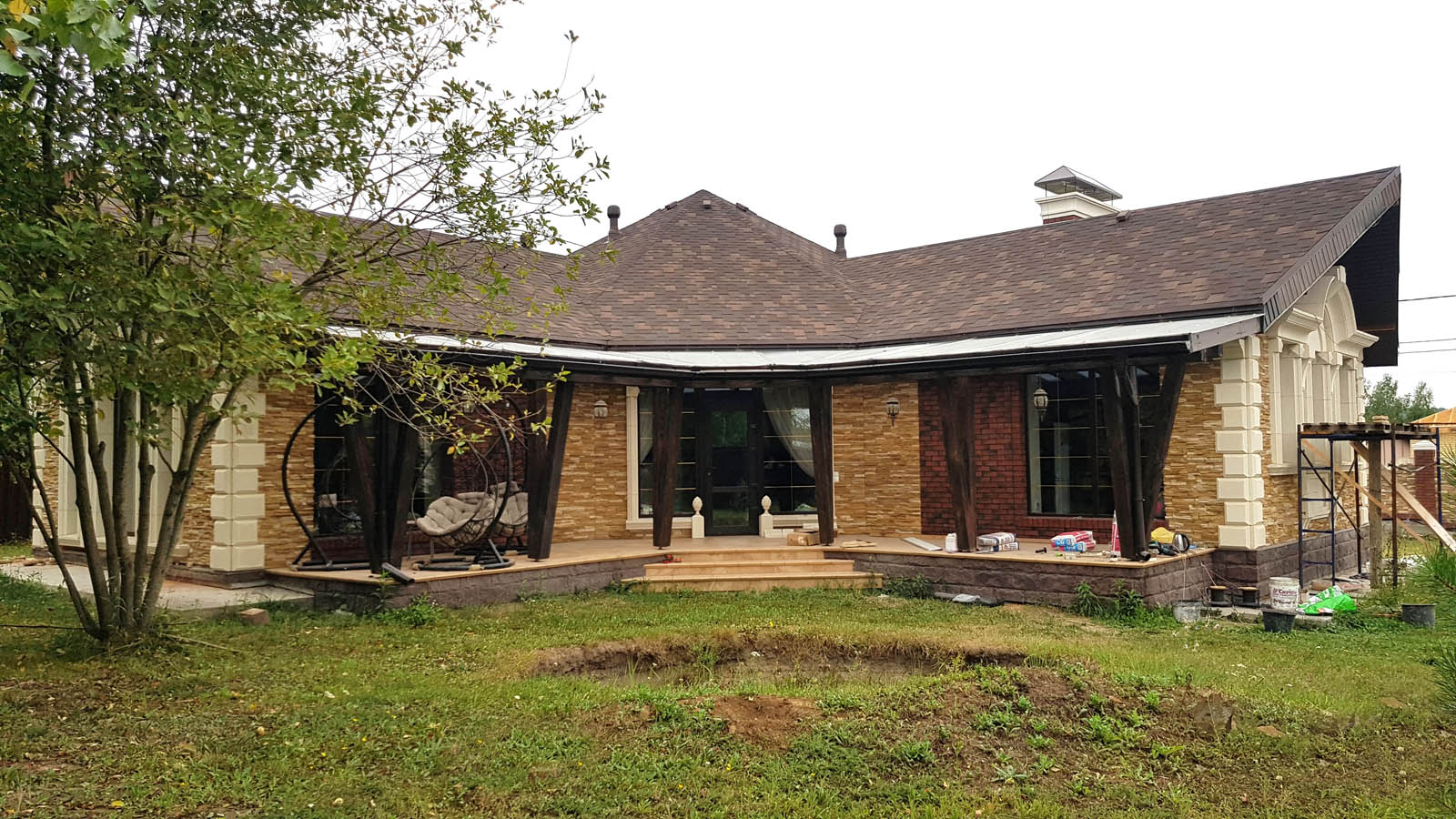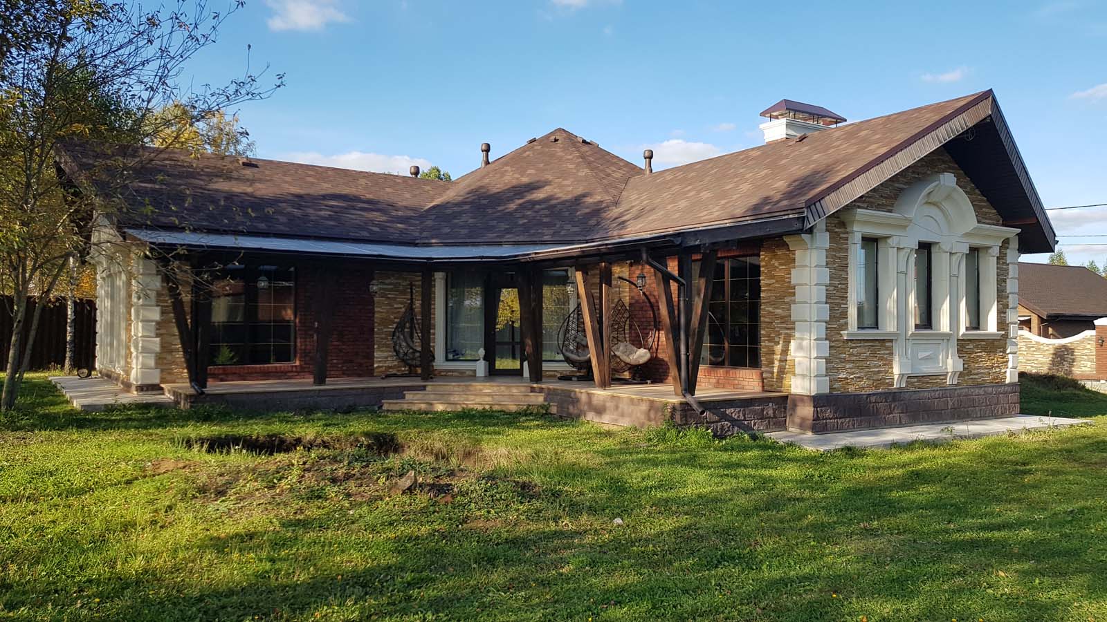 Ну все, наконец-то снял леса, вывез 5 м3 мусора и можно полюбоваться на результат. Не успел в этом году сделать гидрофобизацию всего фасада, т.к. начались дожди. Также, надо придумать как облицевать верхнюю часть (над проемом) входа в дом, ну и, соответственно, накопить на облицовку этих бивней...