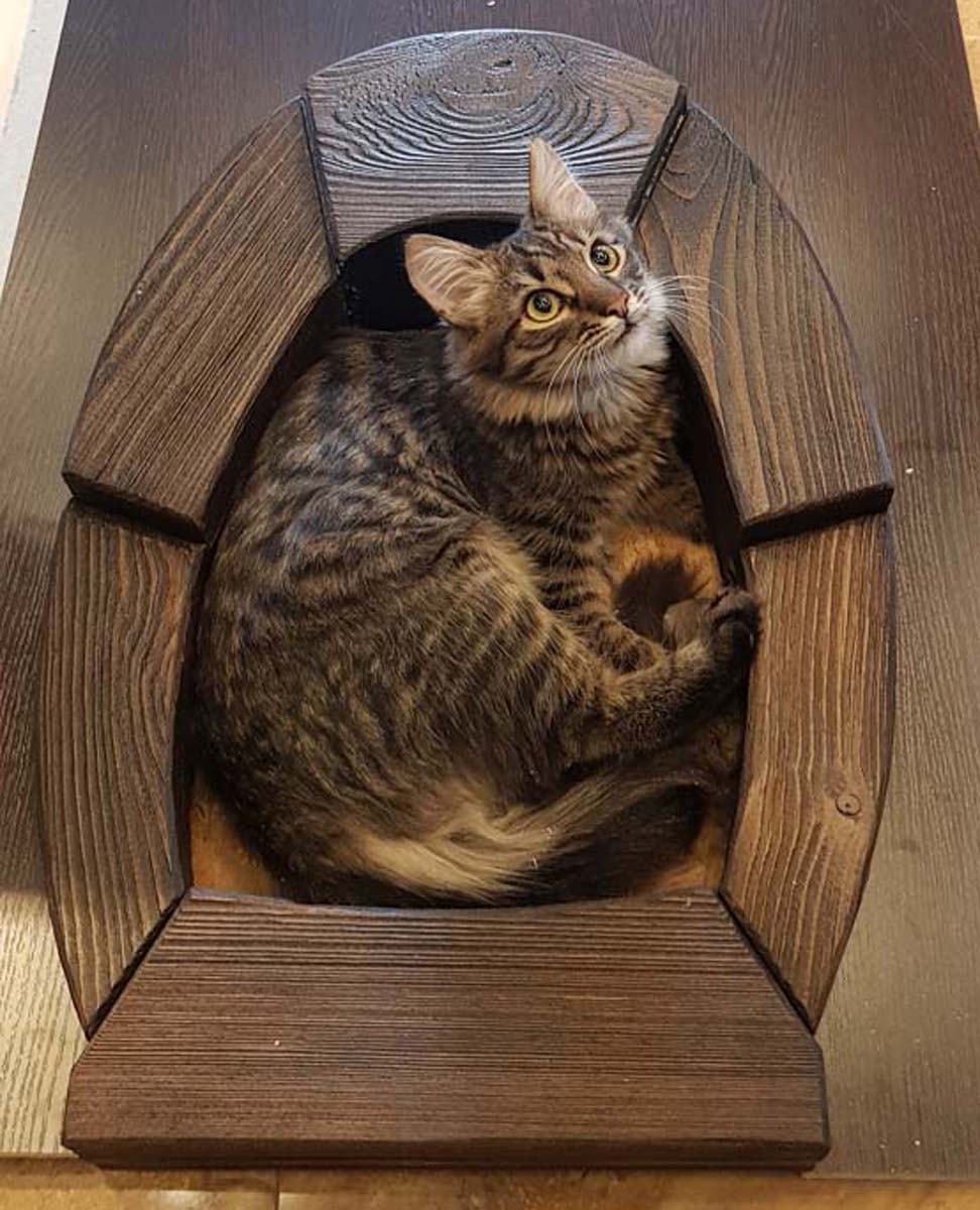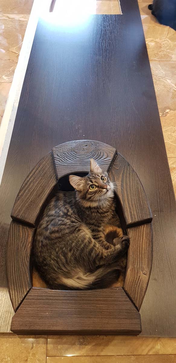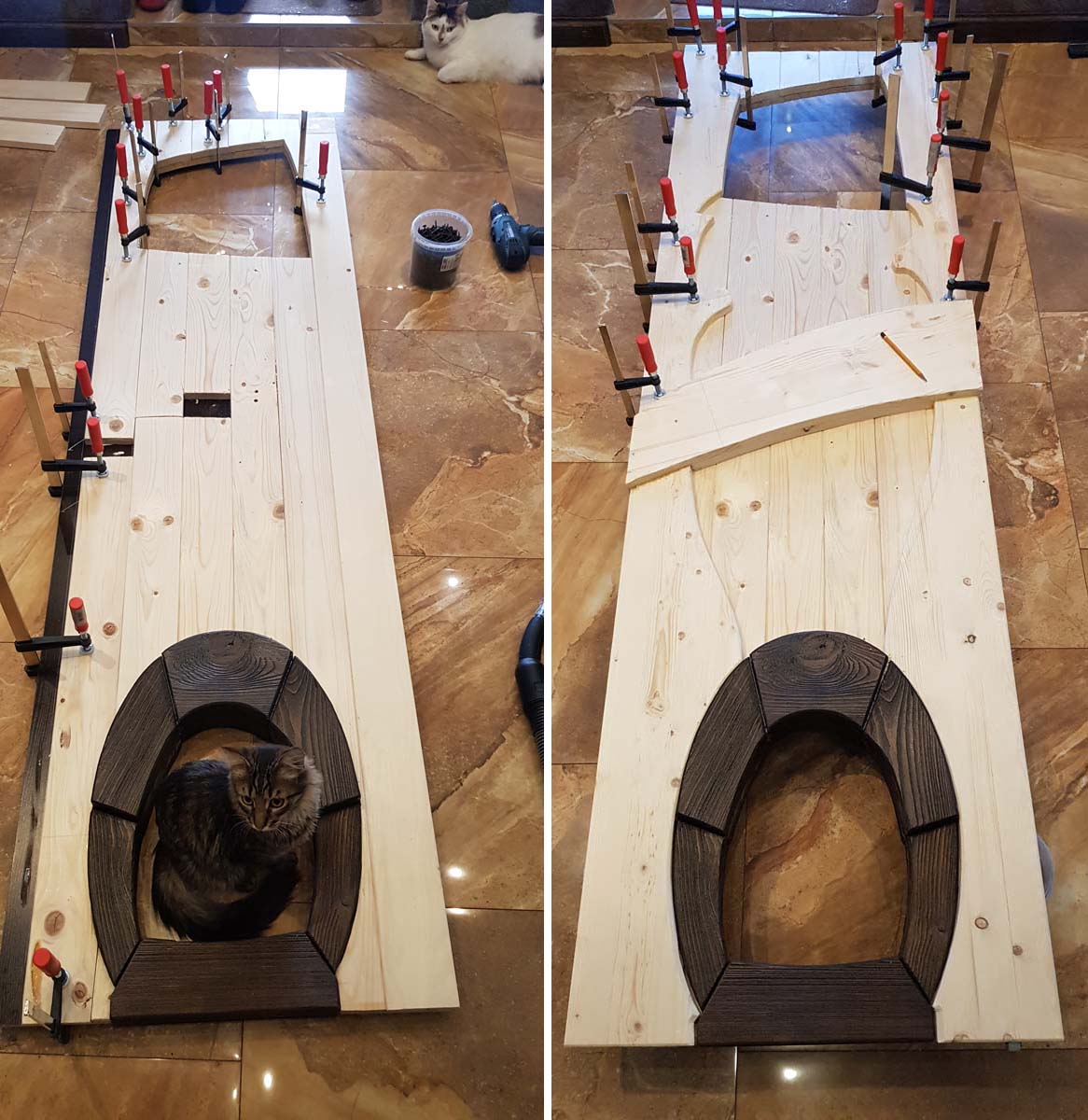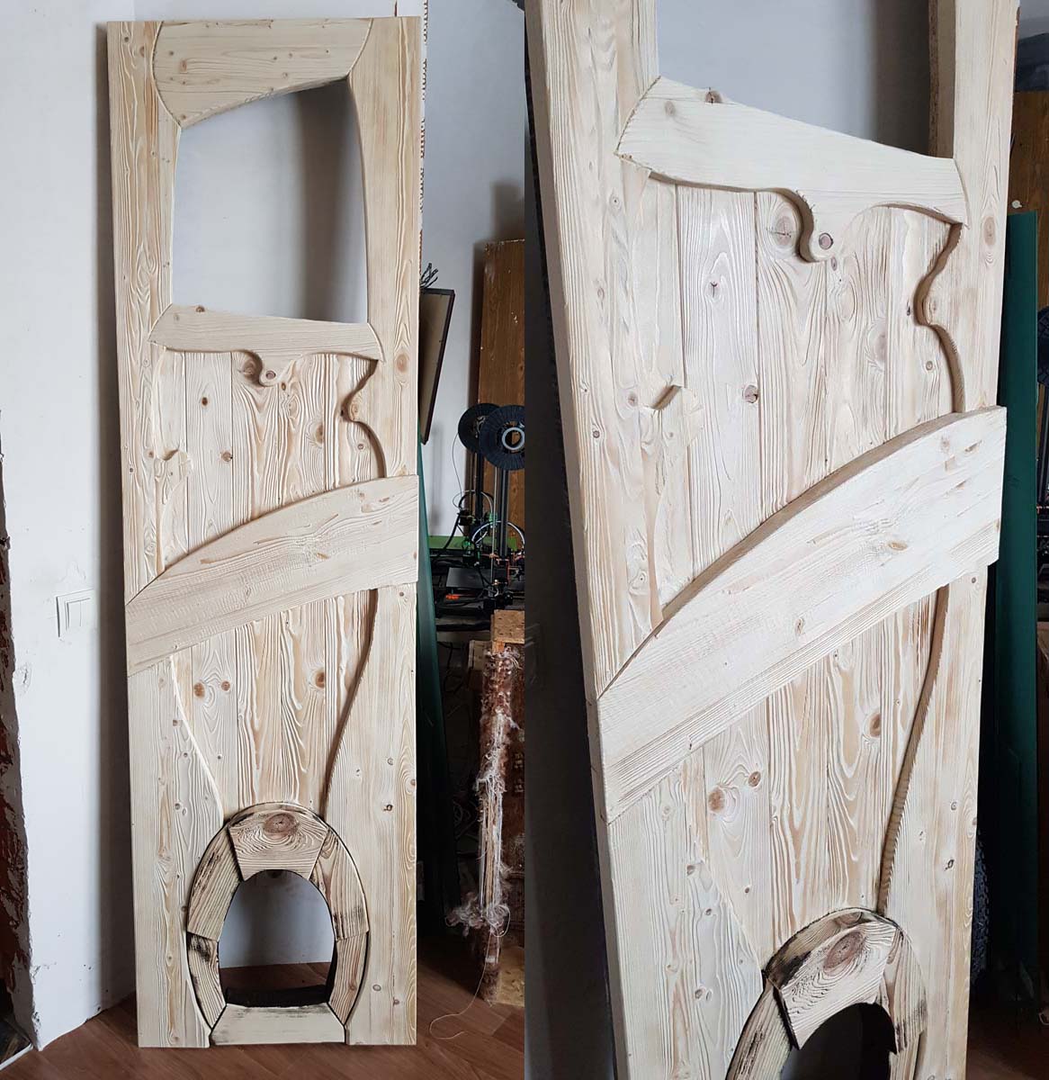 Поехали с полотном. Так как в кладовке у меня размещается еще и туалет для 4 котов, то лаз для ник оставить все-таки надо. Технадзор принимает работу. Это "ярмо" набрано из досок по 20-30 мм толщиной и в области замкового блока имеет толщину 90 мм, а в самом нижнем сегменте 70 мм. Большая и тяжелая штука. Делать ее пришлось единым куском, а не обшивать дсп, т.к. торец дсп был бы виден