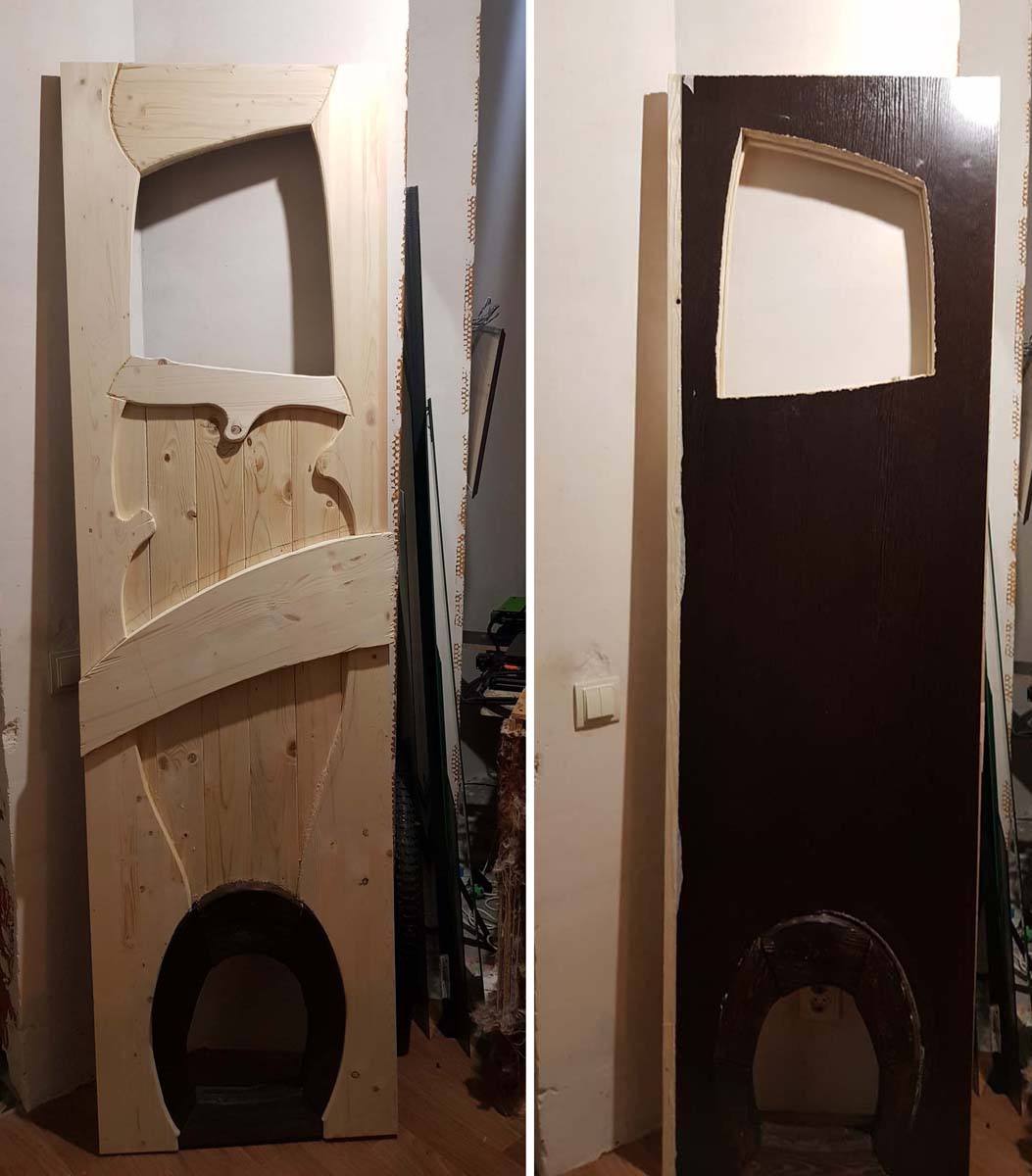 Лицевая и изнаночная части полотна. На данном этапе вес полотна 28 кг. Чтобы весь вес не приходился только на петли, в самом низу я установил резиновый ролик, благодаря которому дверь легко и бесшумно катится по полу. Ролик утоплен в тело полотна (благо толщина его уже 56 мм, а будет 76 мм)