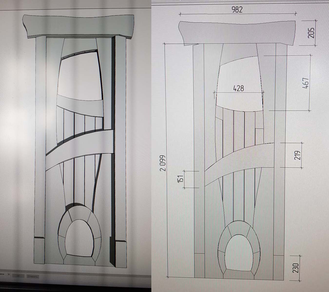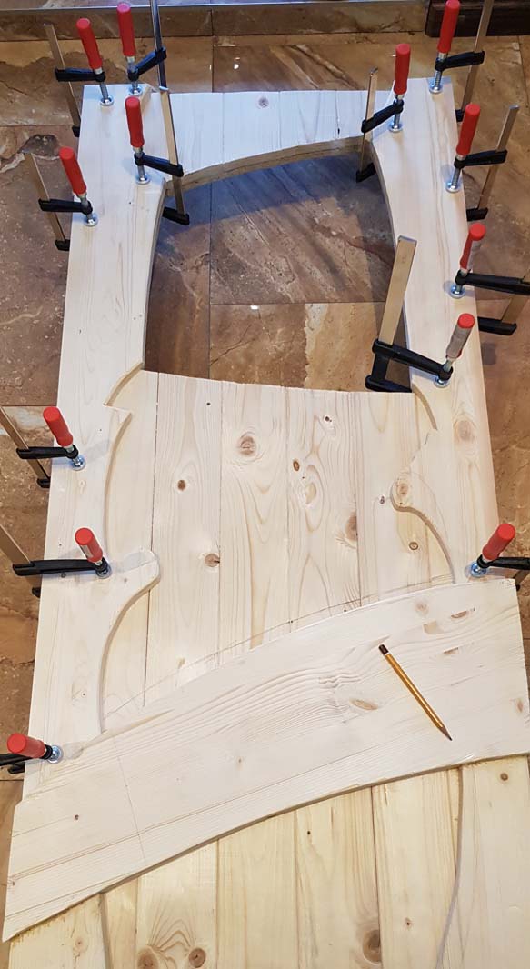 Вот так выглядит завершенный набор лицевой части. Сначала дсп был обшит вертикальными досками по всей площади, затем сверху на них приклеены боковые филенки (стоевые) и фигурные поперечины (царги). Изогнутая доска по центру полотна нужна и для красоты и для прятания мест сшивки досок по высоте, т.к. доски у меня 2 м, а дверь выше