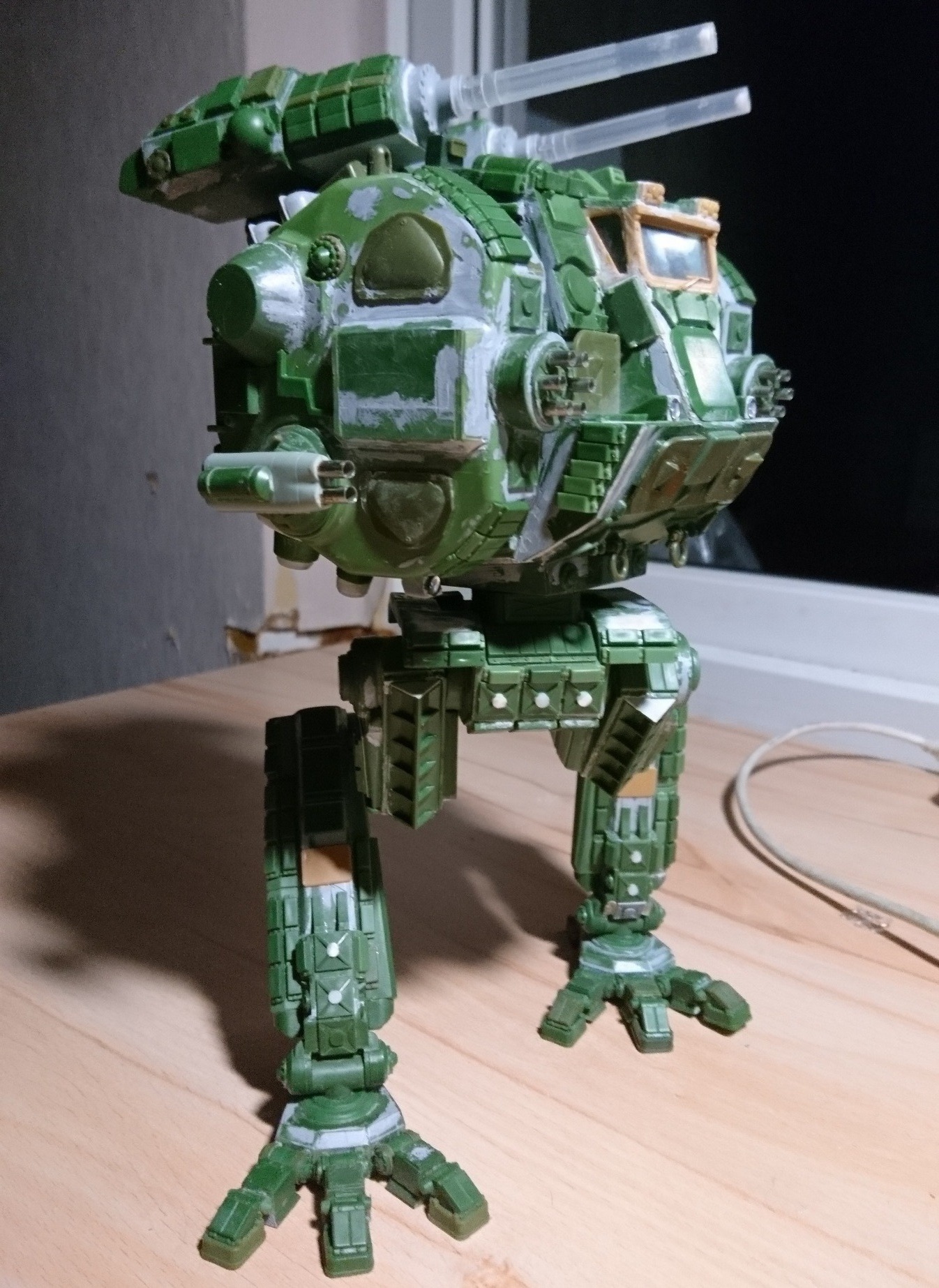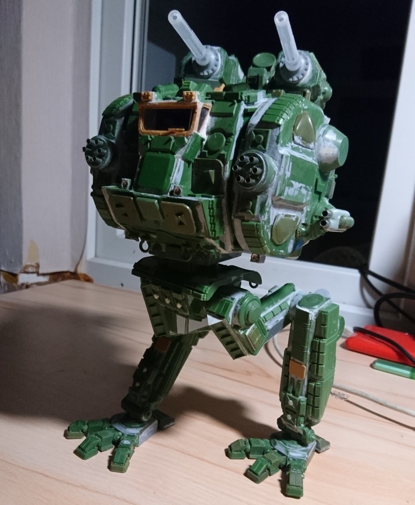 Много переделал, убрал (точнее они сами отвалились) ракетные установки с верхов боковых башен, а то Мех получался перегружен вооружением.Налепил дополнительной брони на башни, кабину сделал из хаммеровских стекол, установил фары (Эльф) в бронекорпусы. На основных пушках переделал ствольные основания, также с тыльной стороны изменил детали, забронировал кабину, ну и мелочевки добавил от разных танчиков