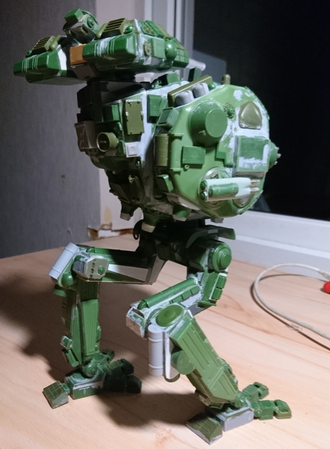 На очереди закрепление пальцев на ступнях шарнирами, установка на башнях РБД-3, разработка основного орудия, установка 4х прыжковых ускорителей на торсе и башнях и остекление кабины и установка кокпита от Апача 1:48.