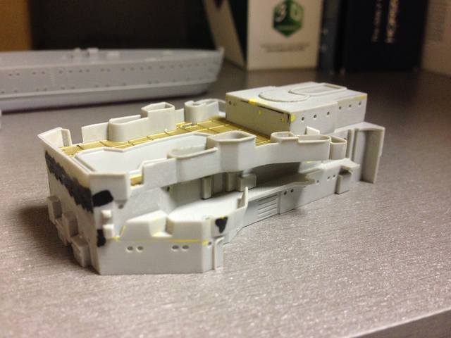 Стройка потихоньку продолжается, но показывать толком пока нечего. Сейчас занят подгонкой ярусов носовой надстройки. Задача кропотливая и не очень приятная ввиду того, что стыкуемость так себе. Так же надо срезать достаточно много пластиковых элементов для последующей установки фототравления.