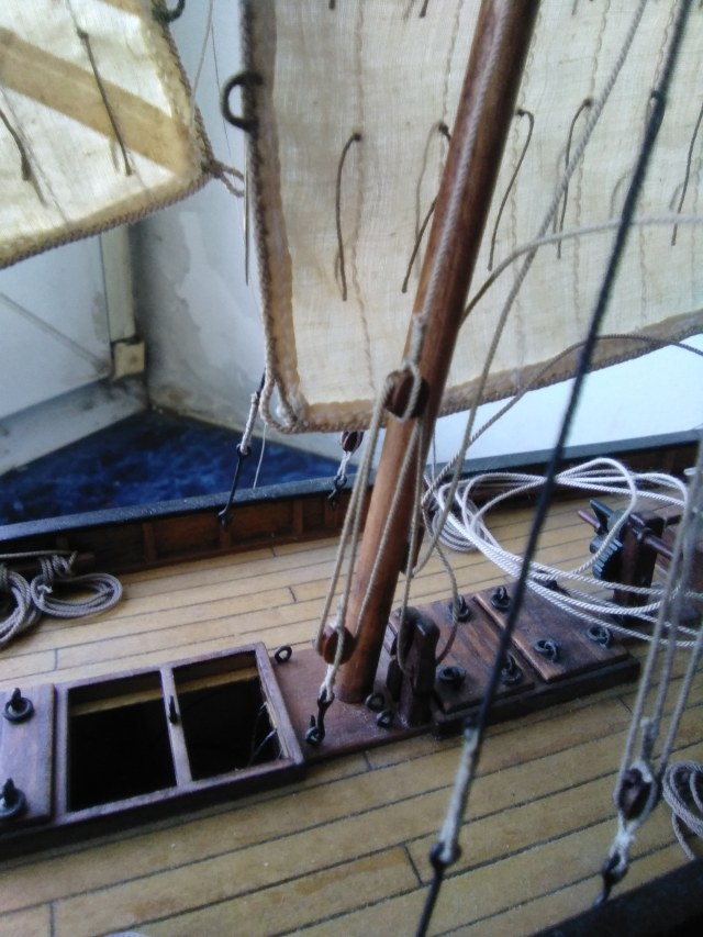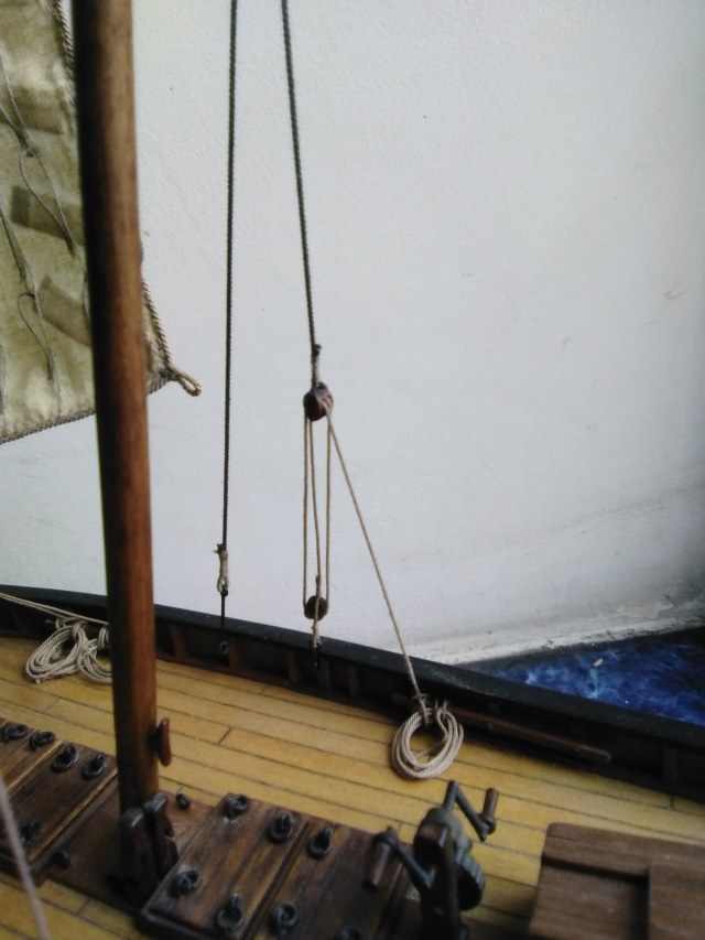 Дошли руки до грот мачты. Стоячий такелаж простейший - две ванты с талями, штаг отсутствует как класс...