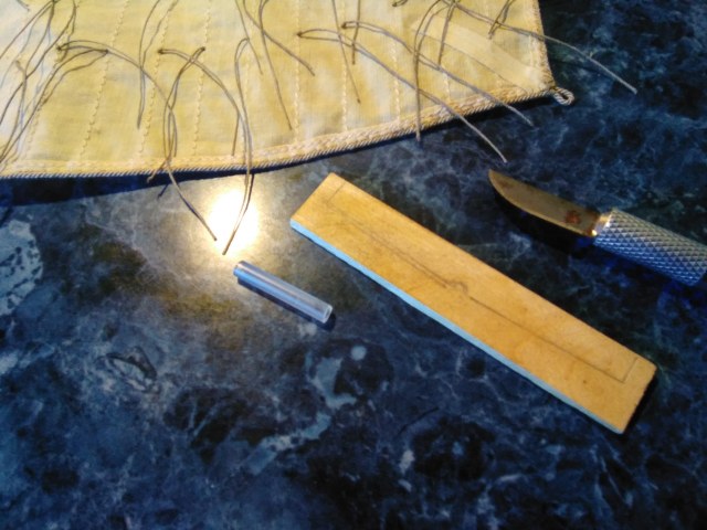 После обшивки паруса ликтросом крепим риф-сезни. Дабы они были одинаковые, подрезаю их по шаблону из трубочки. Кончики подклеиваю к парусу ПВА.