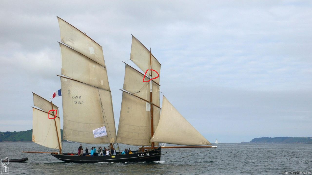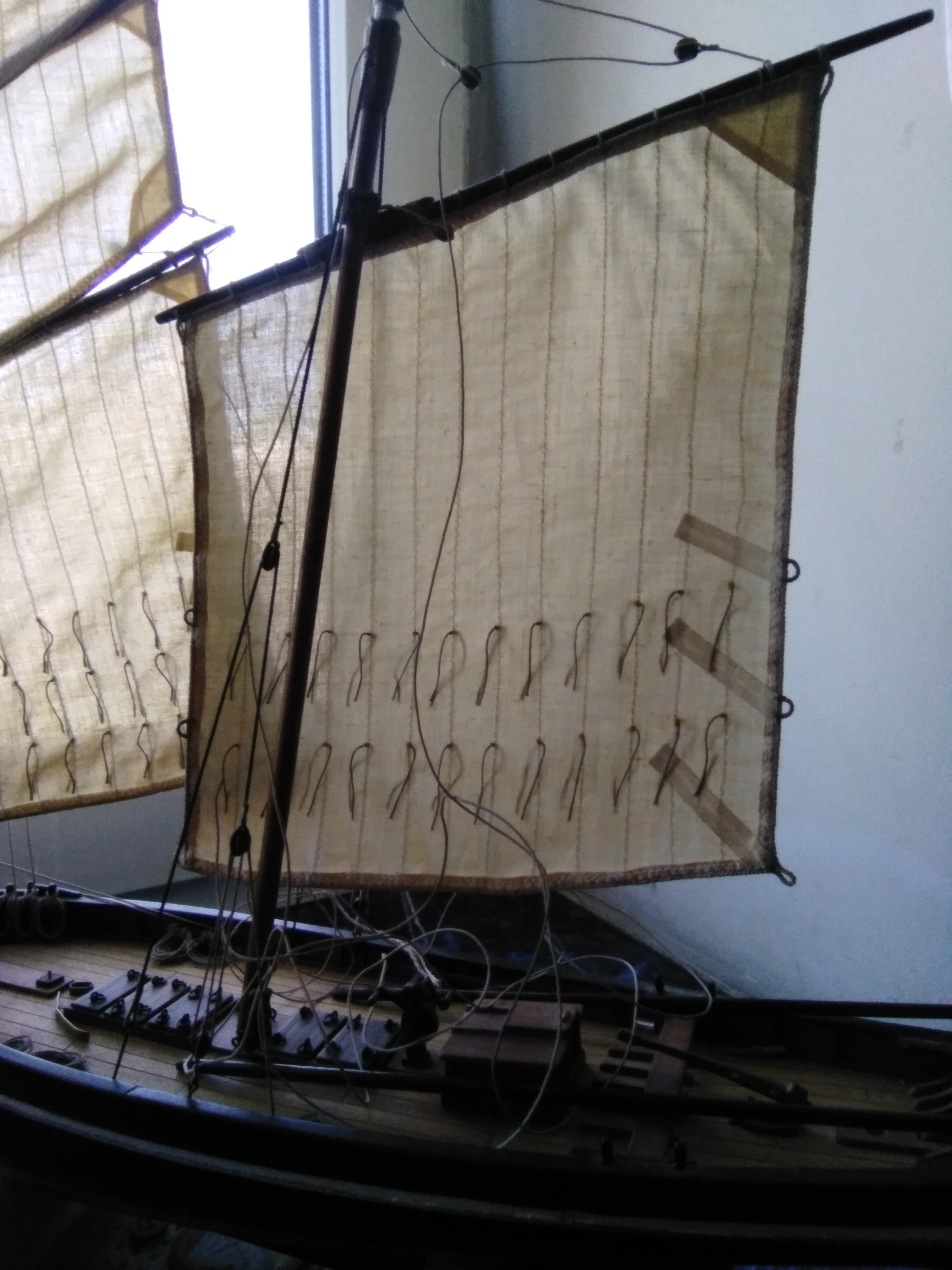 Пришнуровываем парус к рею и поднимаем грот. Обращаю внимание, что если паруса фок мачты расположены слева от мачты, то паруса грот-мачты - справа.
