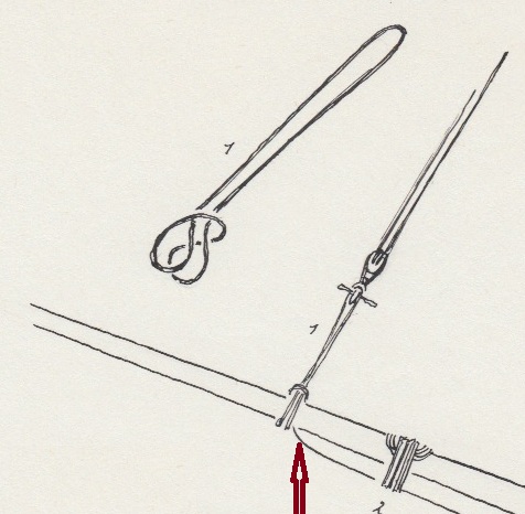 думаю что он использовал что-то наподобие узлов для крепления Шкентеля типа "талрепного" узла. Но талрепный узел не держится без нагрузки, развязывается при переменной. Выбеленочный держится лучше, но при боковой нагрузке вдоль оси обмотки вокруг рангоута тоже вытягивается и развязывается.