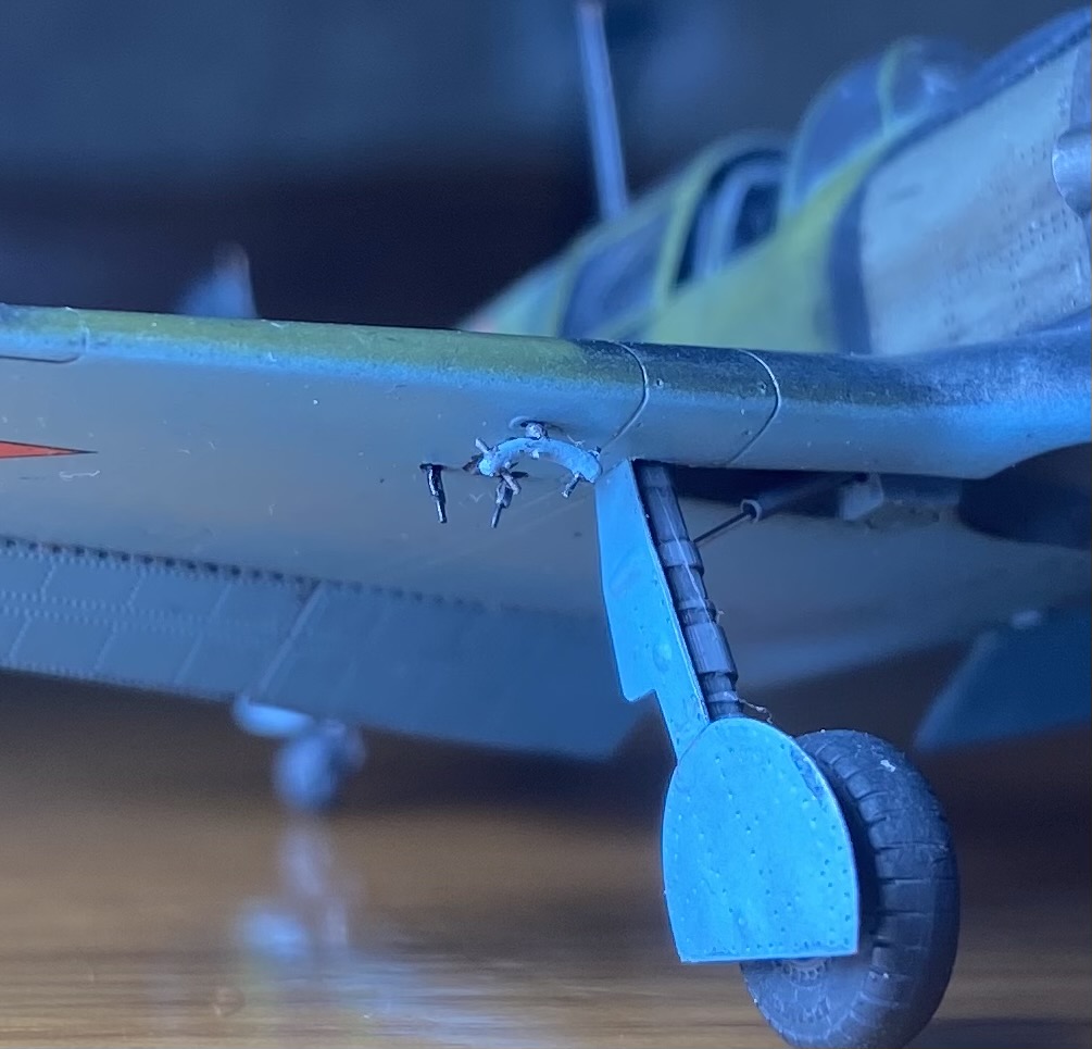 Финал .Выполнено,что помню : подточил посадочное место козырька фонаря, сделал новую сдвижную часть, самодельные бомбодержатели и упоры для бомб, доработал узел крепления винта, пвд из трубки латунной, стекло фары из скотча, мачты антенны из меди,доработал маслорадиатор. Из допов травленые щитки, прицел, выхлоп, фара от Эльф, смоляные колёса.