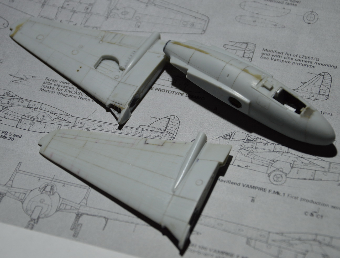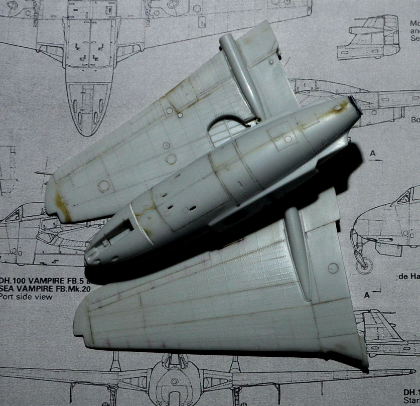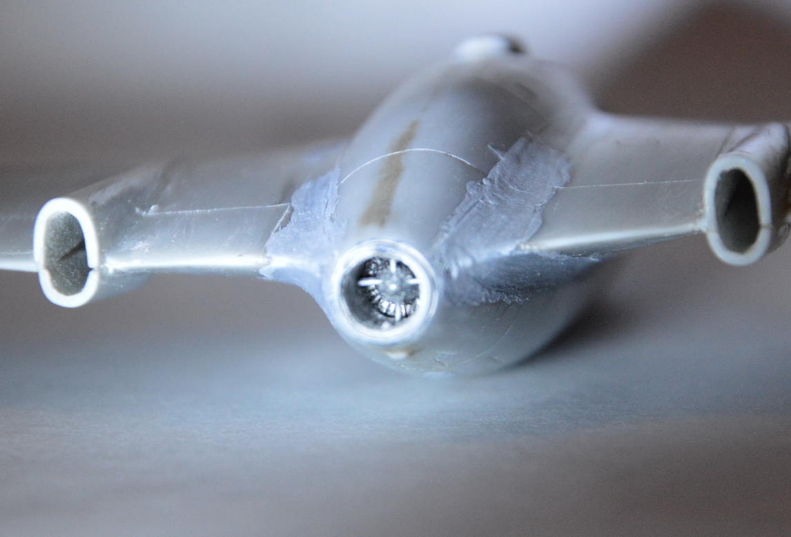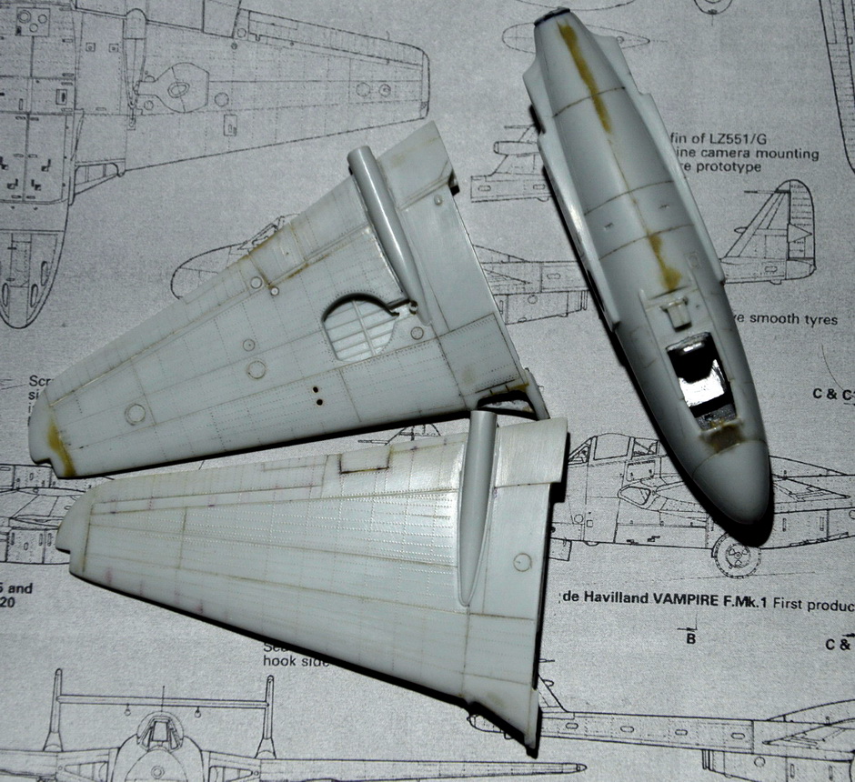 Вот один из таких дерьмовых наборов за немалые деньги. Купил по дурости,как появился в продаже на волне ностальгии по нововскому Вампиру. Предлагается болванка для резьбы по пластику,да ещё с кривой геометрией и отвратительной сходимостью деталей.. Править широкие консоли не стал. Расшивка и клёпка - всё сам. То,что внутри сопла - самодельное,кроме конуса. Очень много пришдось повозиться с воздухозаборниками. Сделал отверстия в фюзеляже для доступа воздуха к двигателю. Изначально там всё глухо.