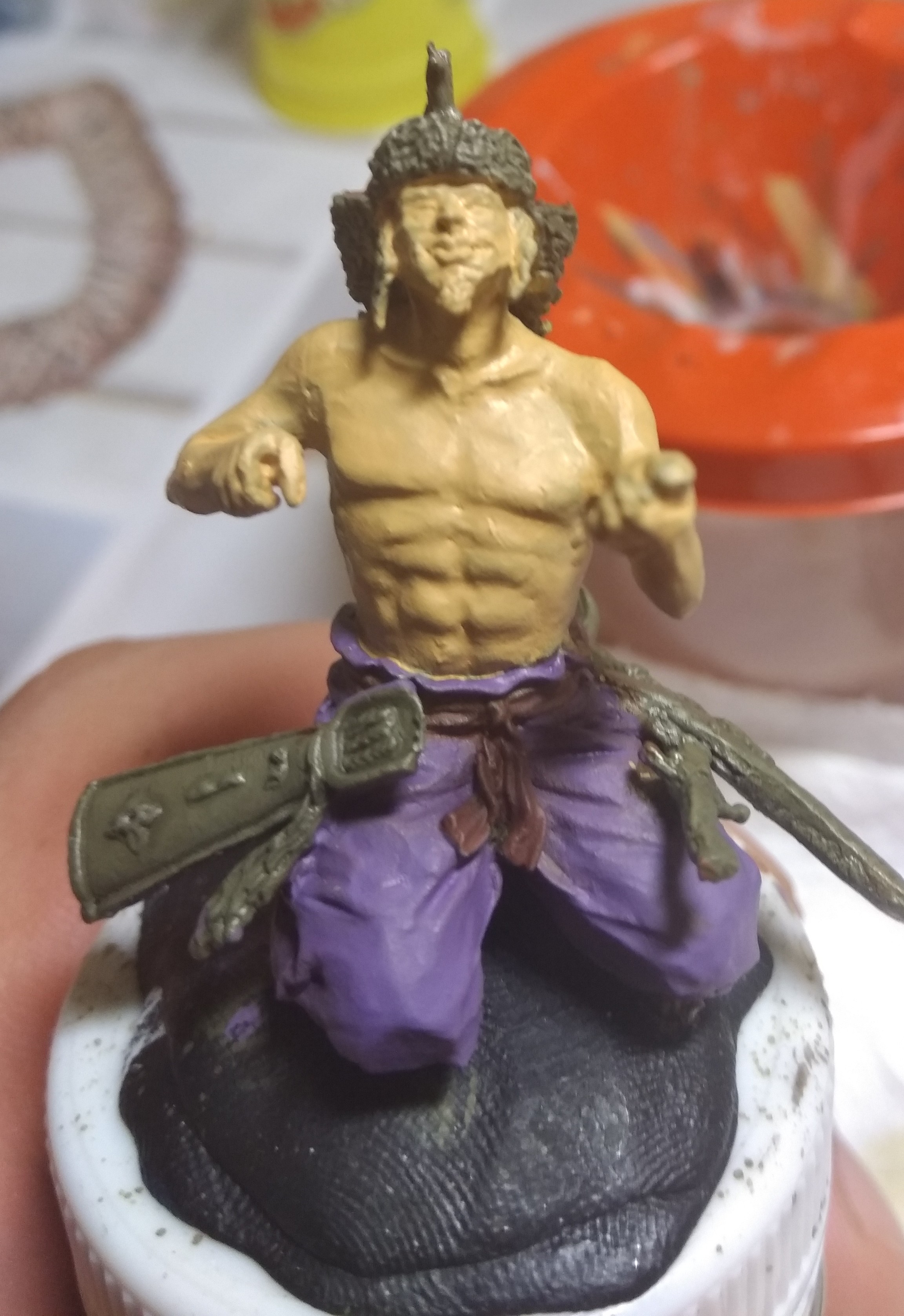 из того что сделал вчера, нанес немного высветлений на лицо, и одежду, наметил глаза, светлым телесным по черной подложке, теперь думаю как зрачок рисовать, глаза на скульптуре смазаны сильно, ещё никак не разберусь с консистенцией краски, собирается каплями, я думал должен быть ровный прозрачный слой, и ещё акрил сохнет очень быстро, и границы все равно видны хоть водичкой мажь, хоть жирным слоем, может это оттого что я акрил разводу простой водой?