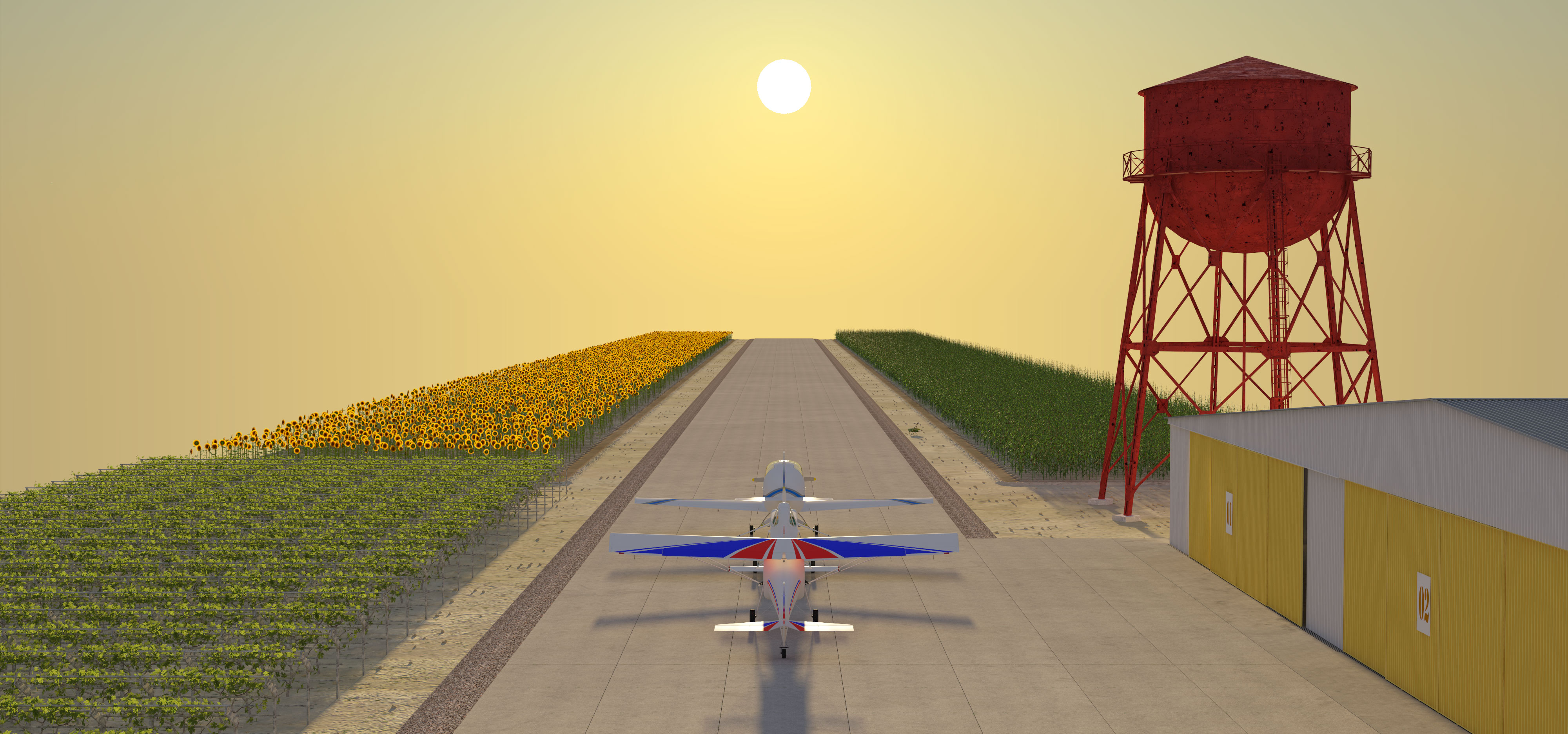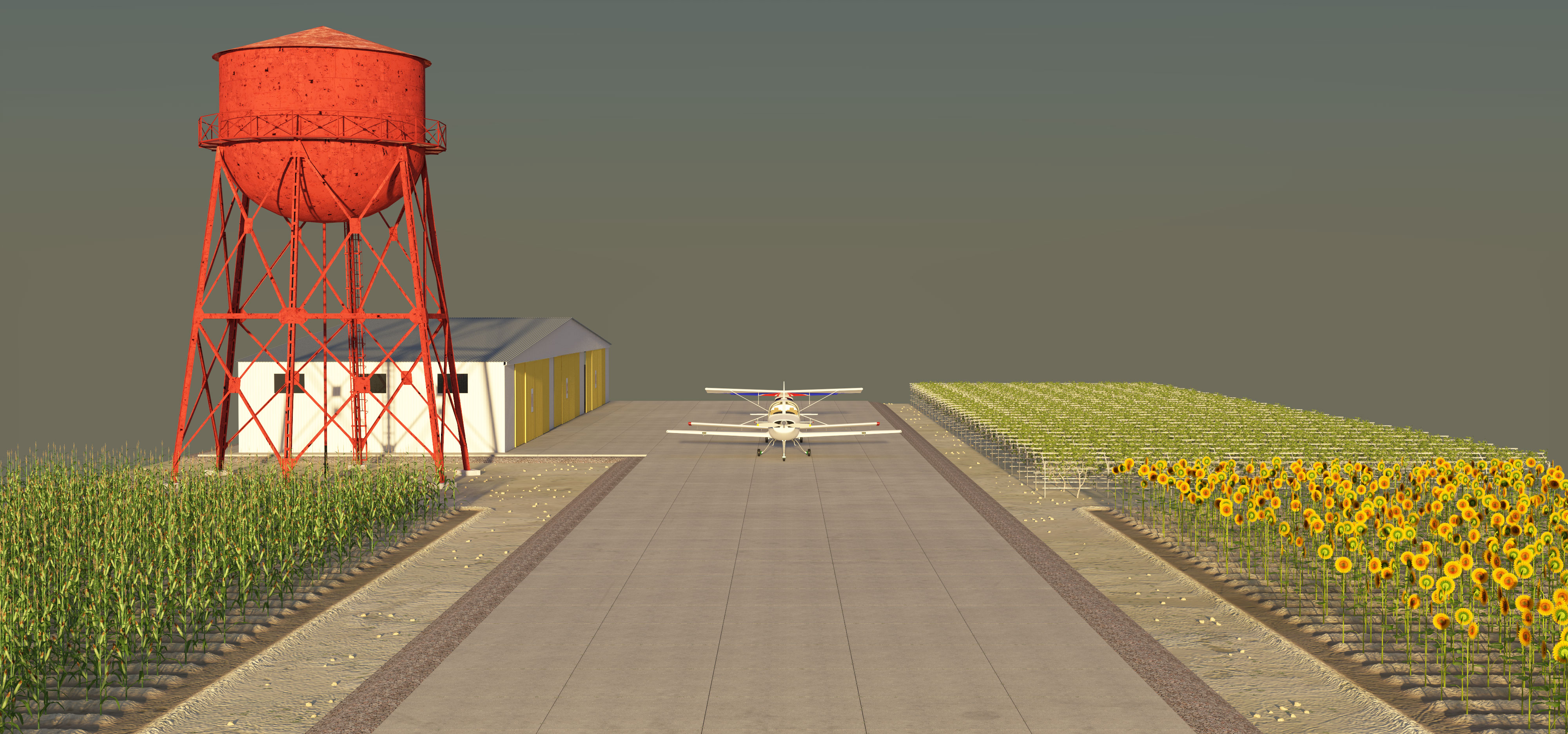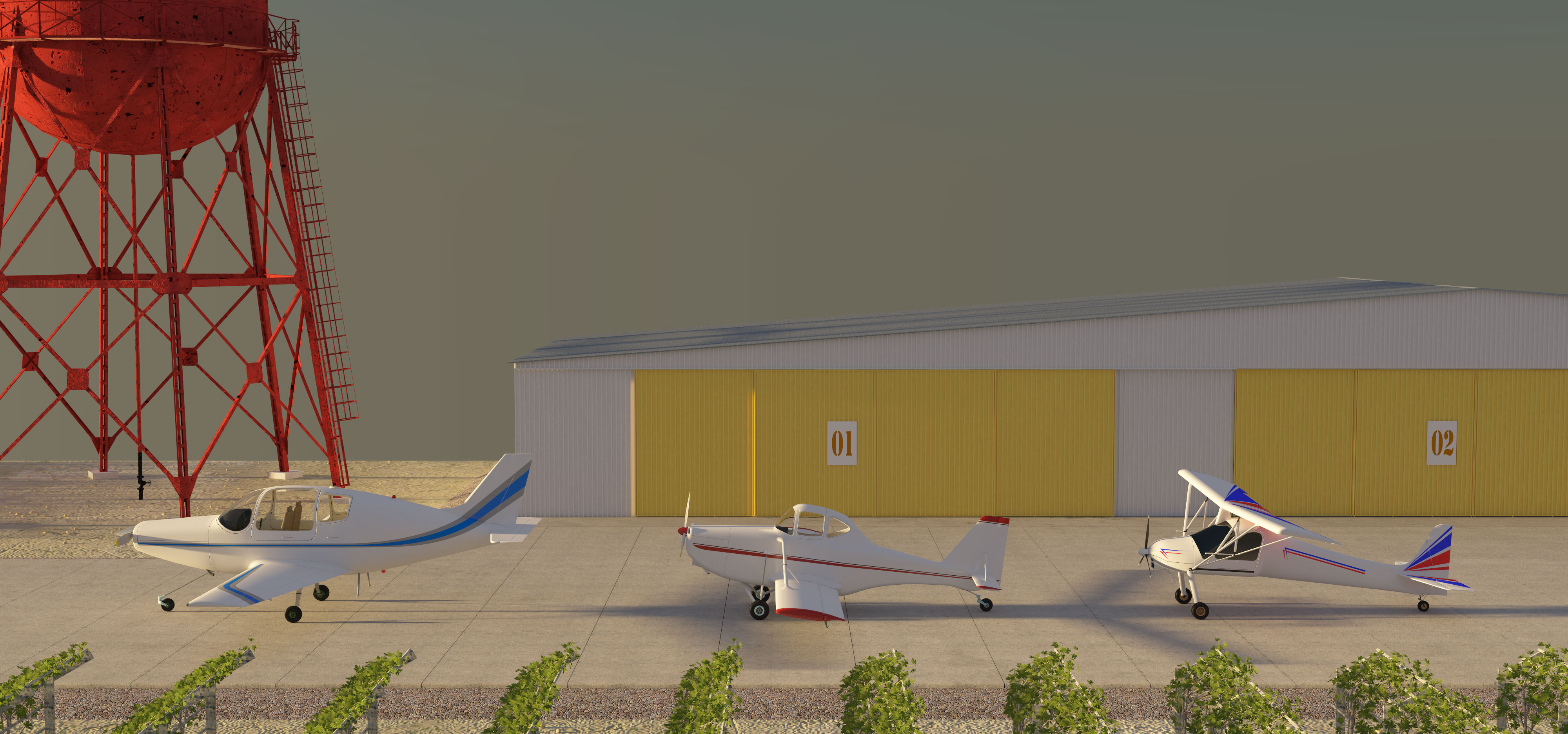 . Получилась диорама из трех самолетов с небольшим кусочком окружения. На рендерах присутствуют впп, ангар, водонапорная башня,кукурузное и подсолнечные поля, виноградник, и, конечно, самолеты. Прототипами самолетов послужили российские самолеты ИЛ-103, МАИ-223 и Фермер-2.
