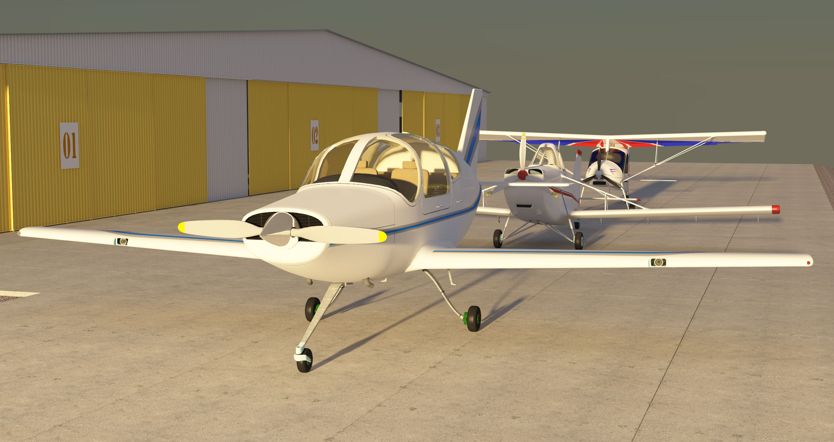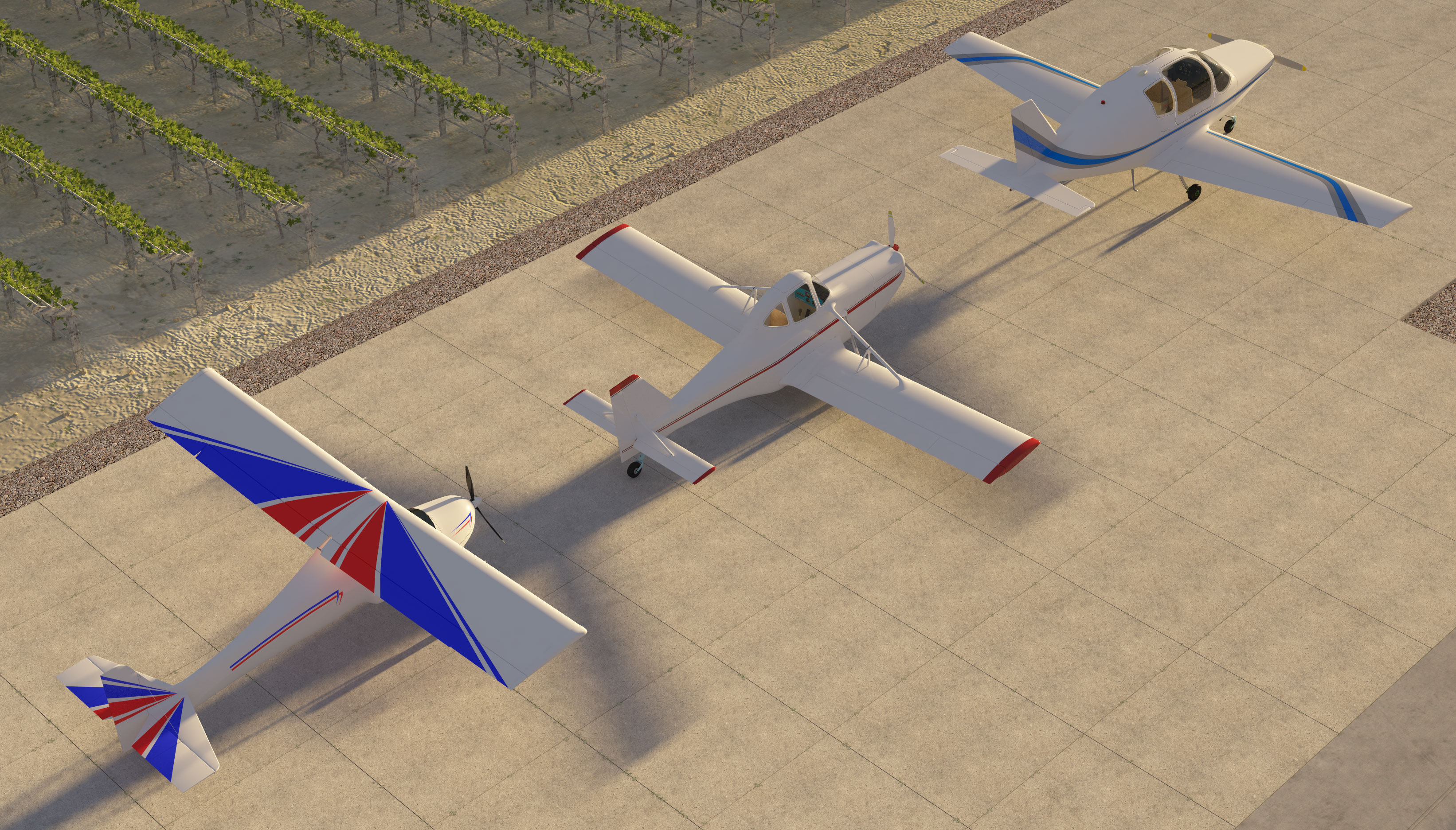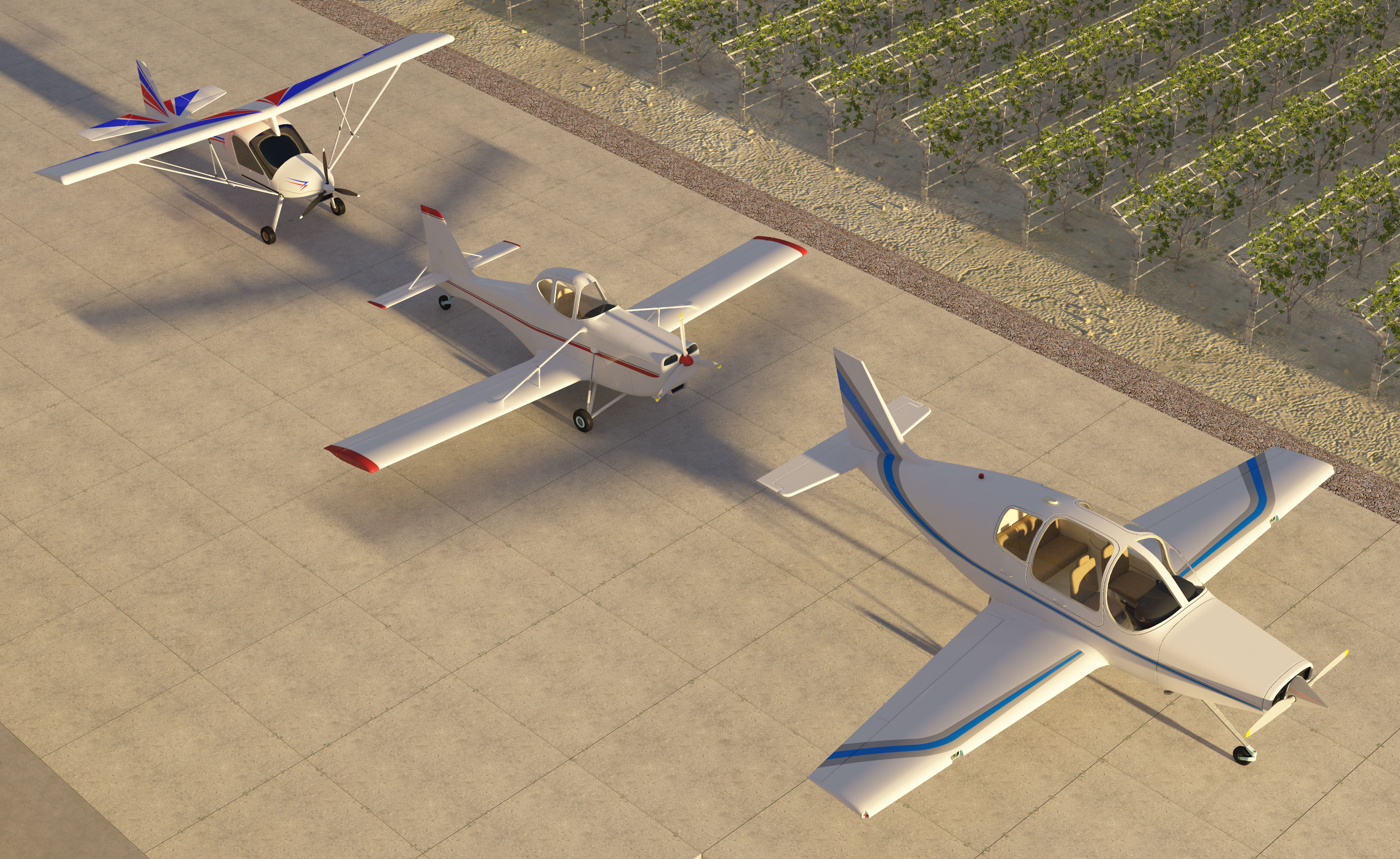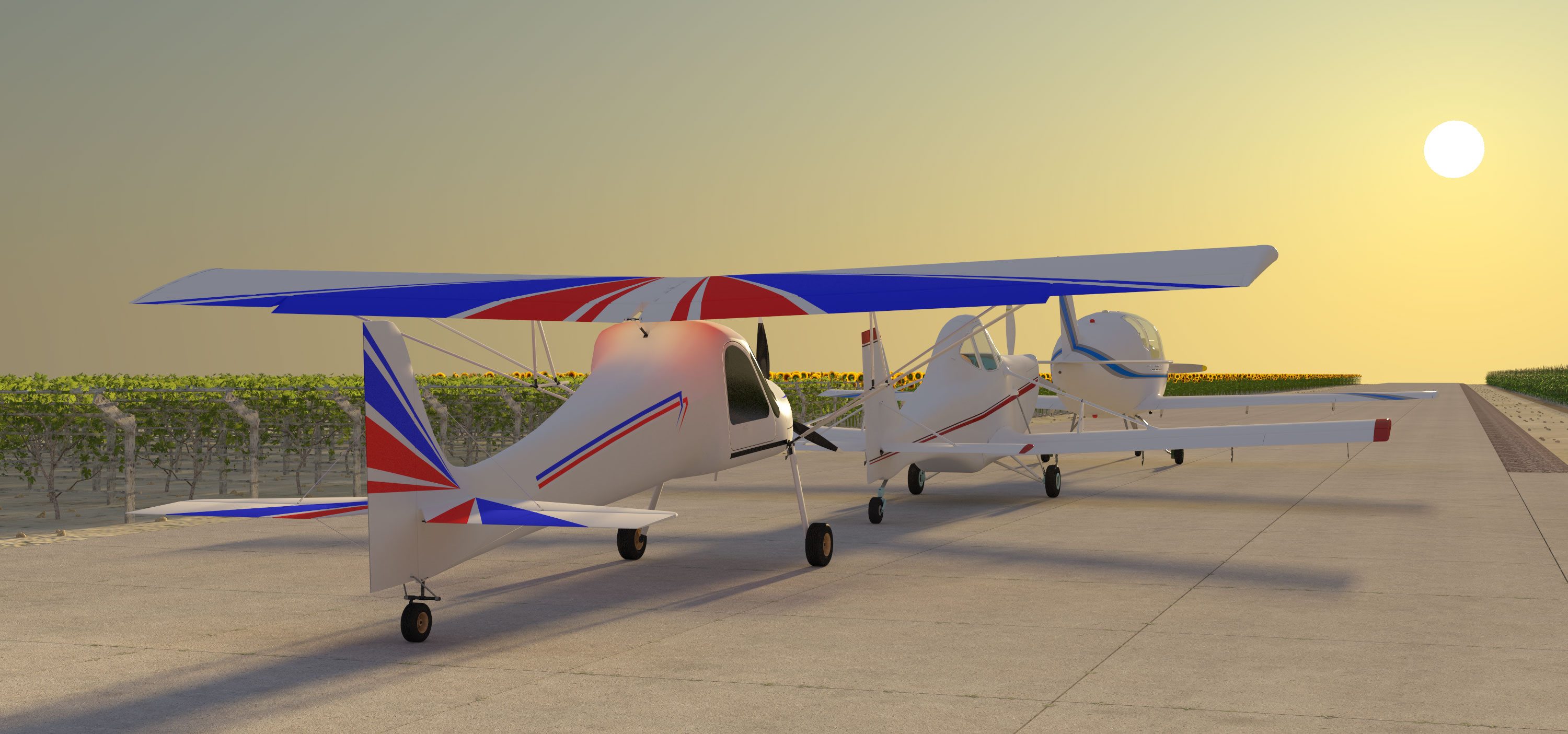 . Получилась диорама из трех самолетов с небольшим кусочком окружения. На рендерах присутствуют впп, ангар, водонапорная башня,кукурузное и подсолнечные поля, виноградник, и, конечно, самолеты. Прототипами самолетов послужили российские самолеты ИЛ-103, МАИ-223 и Фермер-2.