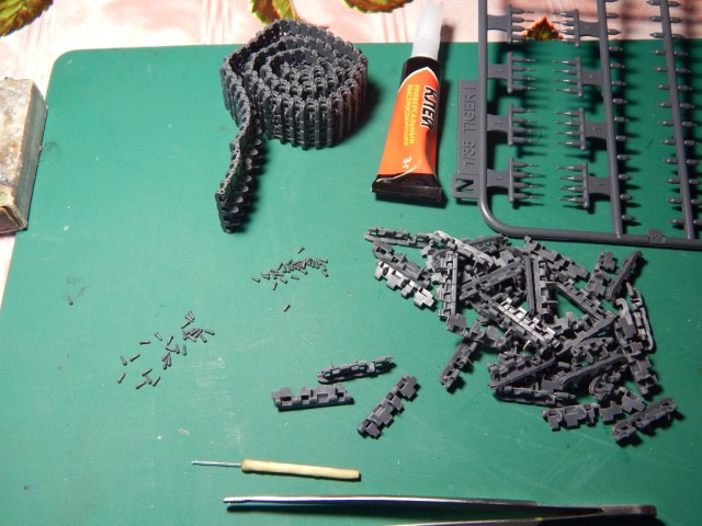 аккуратно нанося клей на полупальцы , собираем сегменты по 20-30 траков,