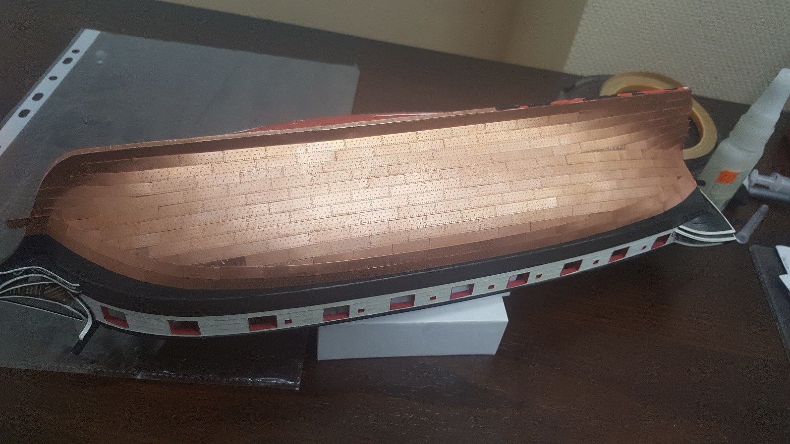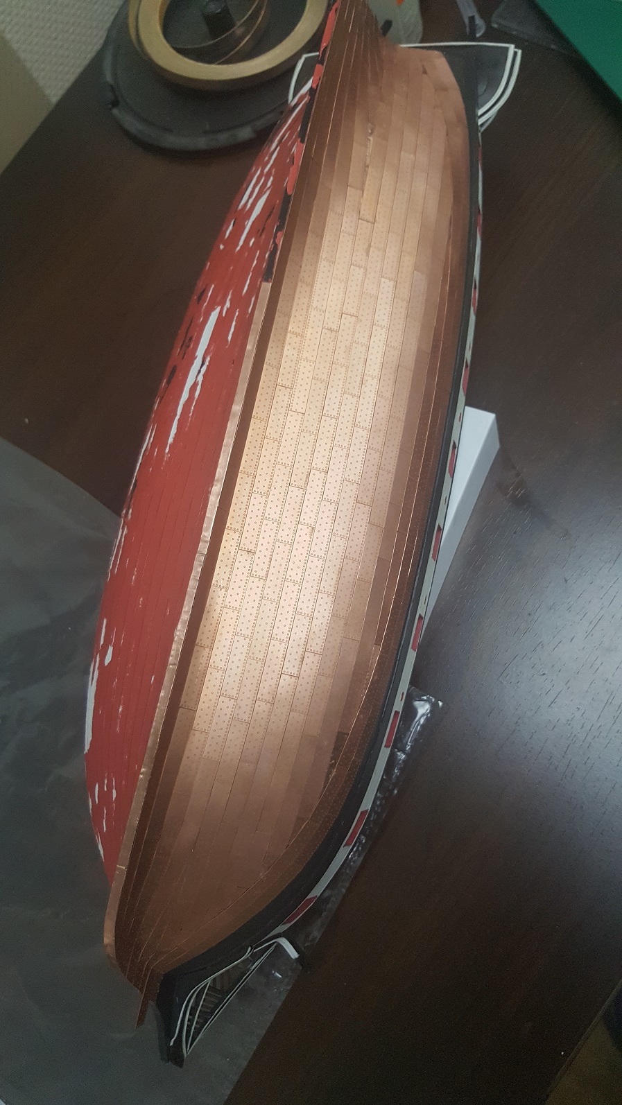 Вспученная обшивка решительно содрана до мяса. Есть у меня теория о большой разности коэффициентов температурных расширений меди, бумаги и полиуретанового лака, а толщина фольги, а соответственно и ее прочность, неприлично малы. От того и расколбасило болезного. Либо надо было лак наносить толстым слоем, либо вообще не покрывать. Короче ф топку эту самоклейку. Пришла посылка с Верфи - 5х17мм медные пластины от Амати. Толщина 0.1 мм, достаточно прочные, так как фольгу их уже точно не раскорячит. Сильно боялся, что не хватит, поэтому, обшивая правую половинку, часть полускрытых листов заменял полосками обычной листовой меди, купленной в магазине радиодеталей, торец киля обклеиваю той самой самоклейкой, но на суперклей. Однако боялся зря, с правого борта осталось 9 пластинок. Ничего, как раз они на руль и уйдут. В общем вот так оно все пока предварительно выглядит. Конечно ни в какое сравнение с моим предыдущим колхозом. Следы суперклея будут убраны, "неродные" пластинки разглажу и нейтрализую их блеск матовым нитро лаком.