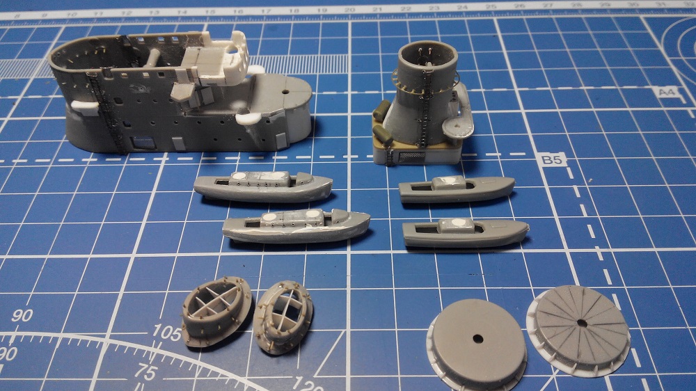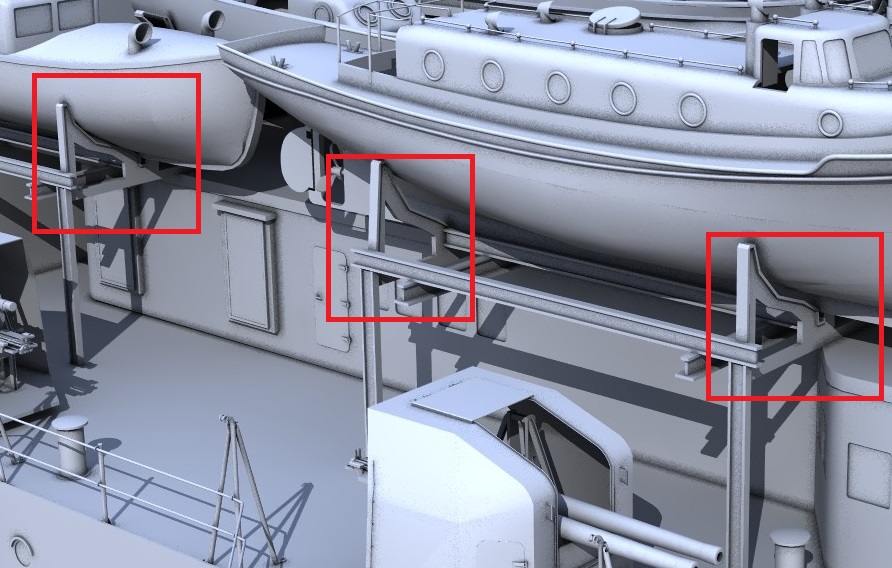 На данный момент запилил опоры под шлюпки и опоры навесных площадок, Сами шлюпки тоже попали под замес и будут малость доработаны. Козырьки на выхлопные трубы так же подверглись доработки.