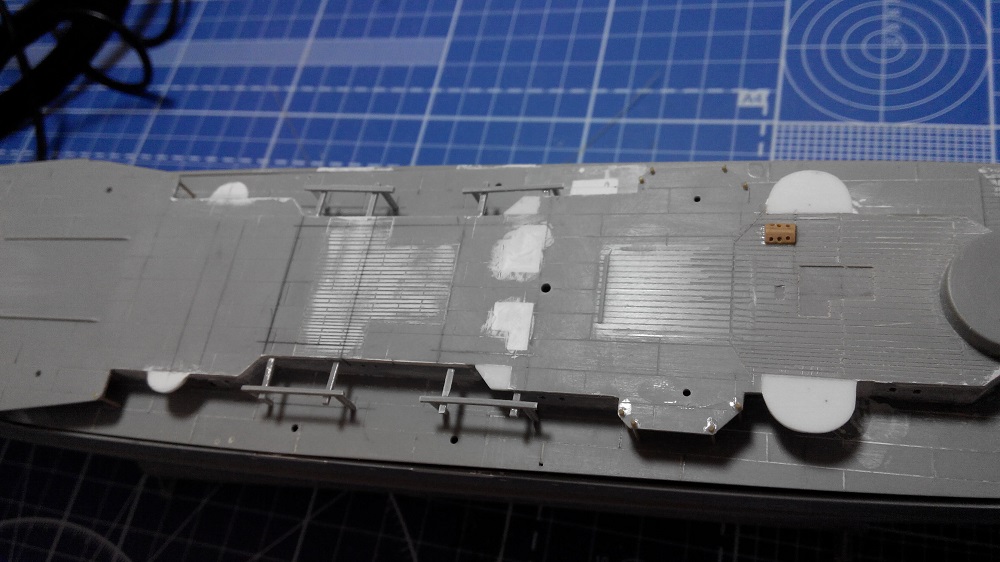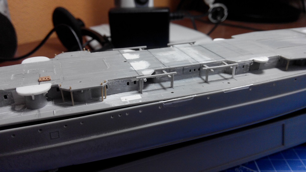 Просто там всё так хитро выглядит+ еще и мелко. Вот я и думаю, а может упростить этот момент. Деталь можно будет просто обозначить треугольничками  и все? Опоры под шлюпки предположительно должны  быть из двутавра, но масштабно его сделать не получилось, Пришлось нерезать тонкие полосы пластика и  клеить из них.