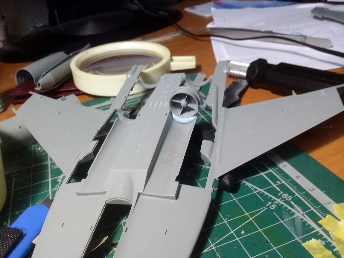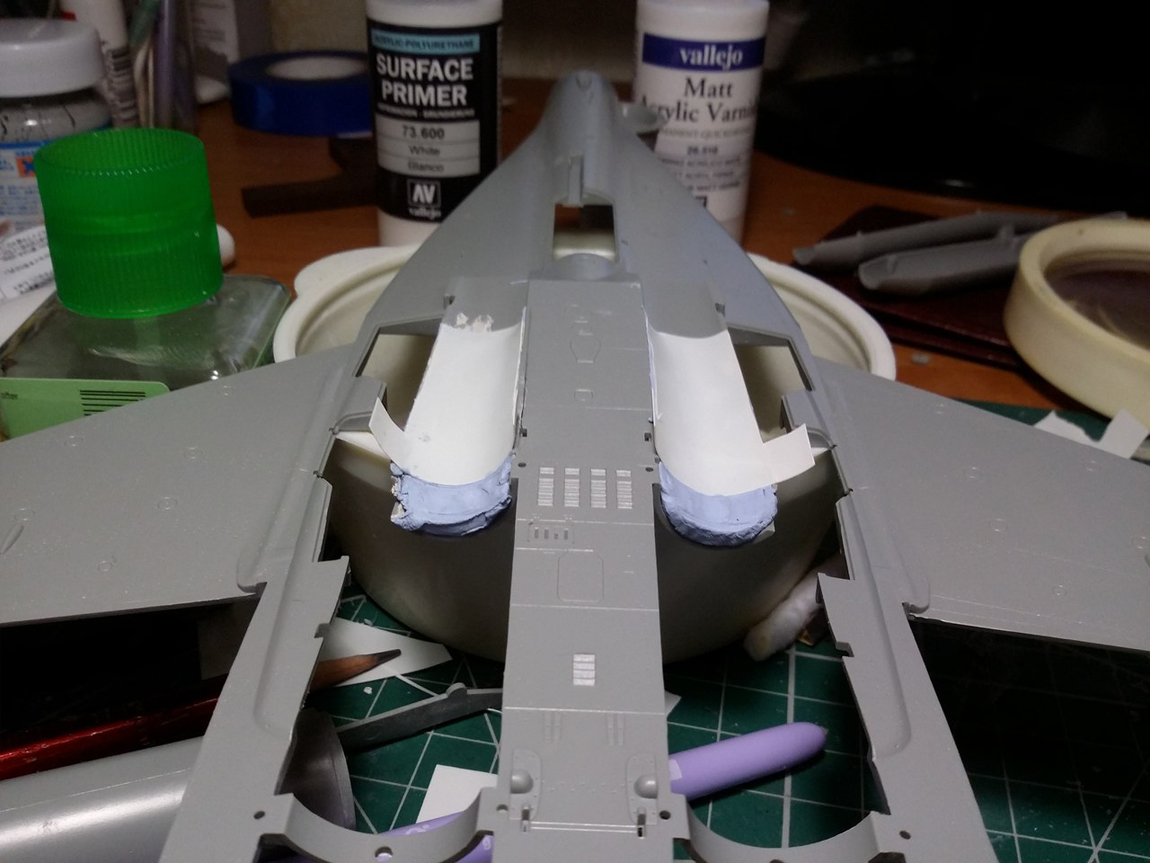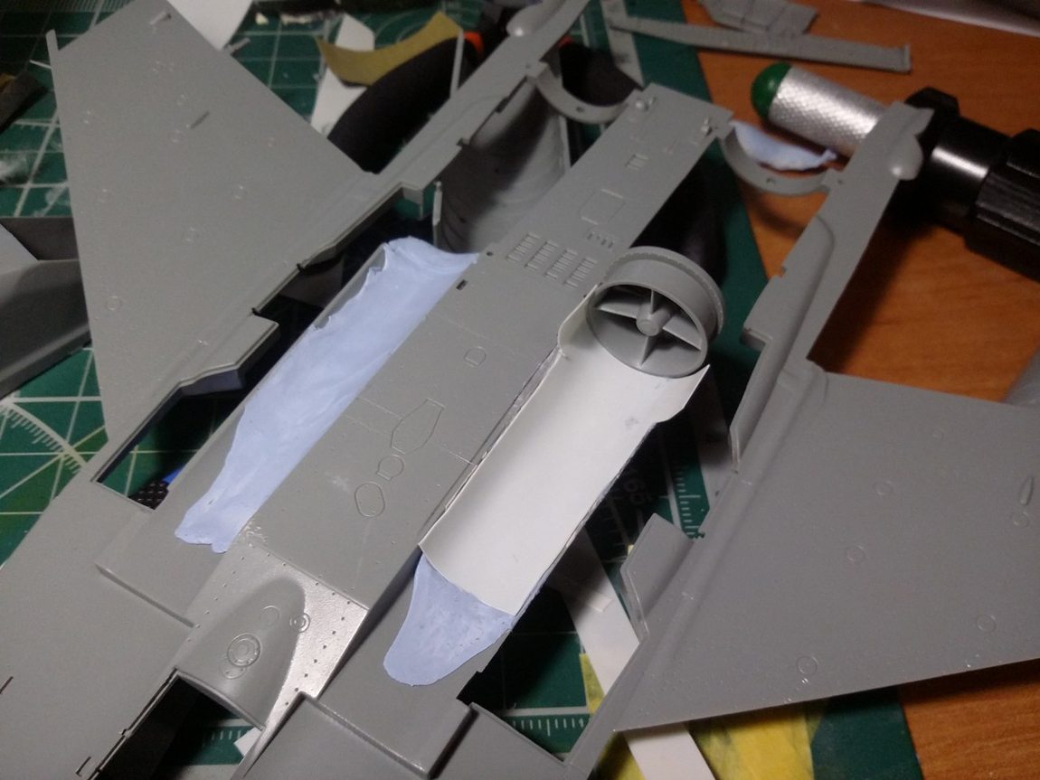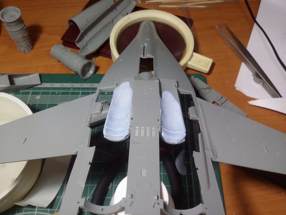 Стройку начал с ВЗ, а именно с попытки исправить канал ВЗ. Если этого не сделать, то между ВЗ и двигателем образуется огромная ступенька. Многие скажут: "зачем заморачиваться, закрой створку осевого входа и не парься".( так многие и делают кстати) Но мы не ищем легких путей, да и створка закрывается только при запуске двигателя и остается закрытой пока двигатель работает на земле и до определенной скорости на разбеге. Поэтому сделаем ее по фэншую открытой.