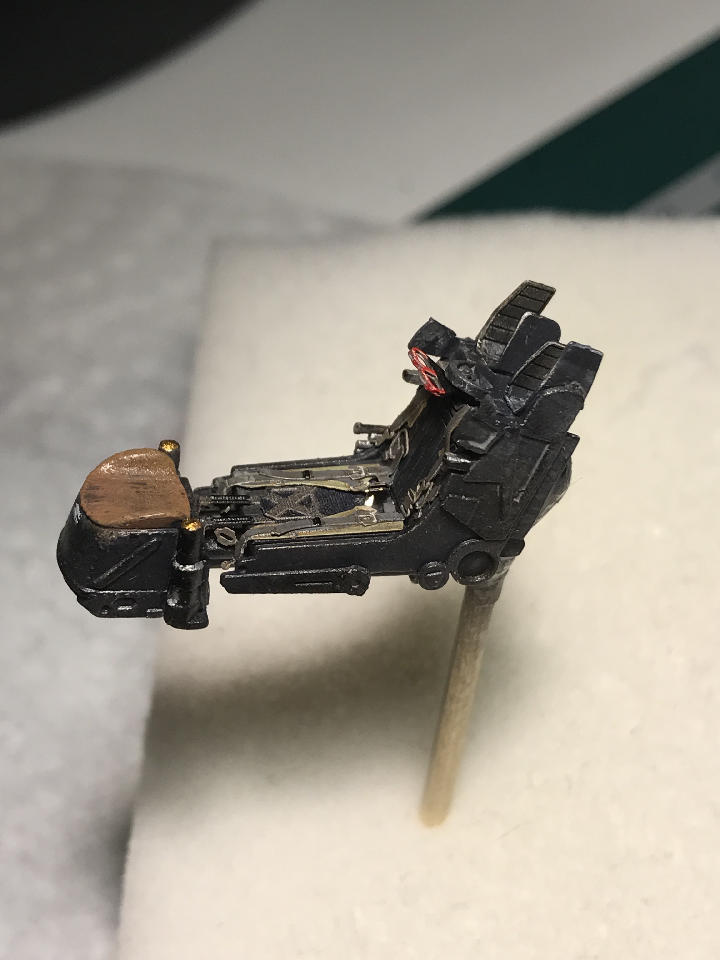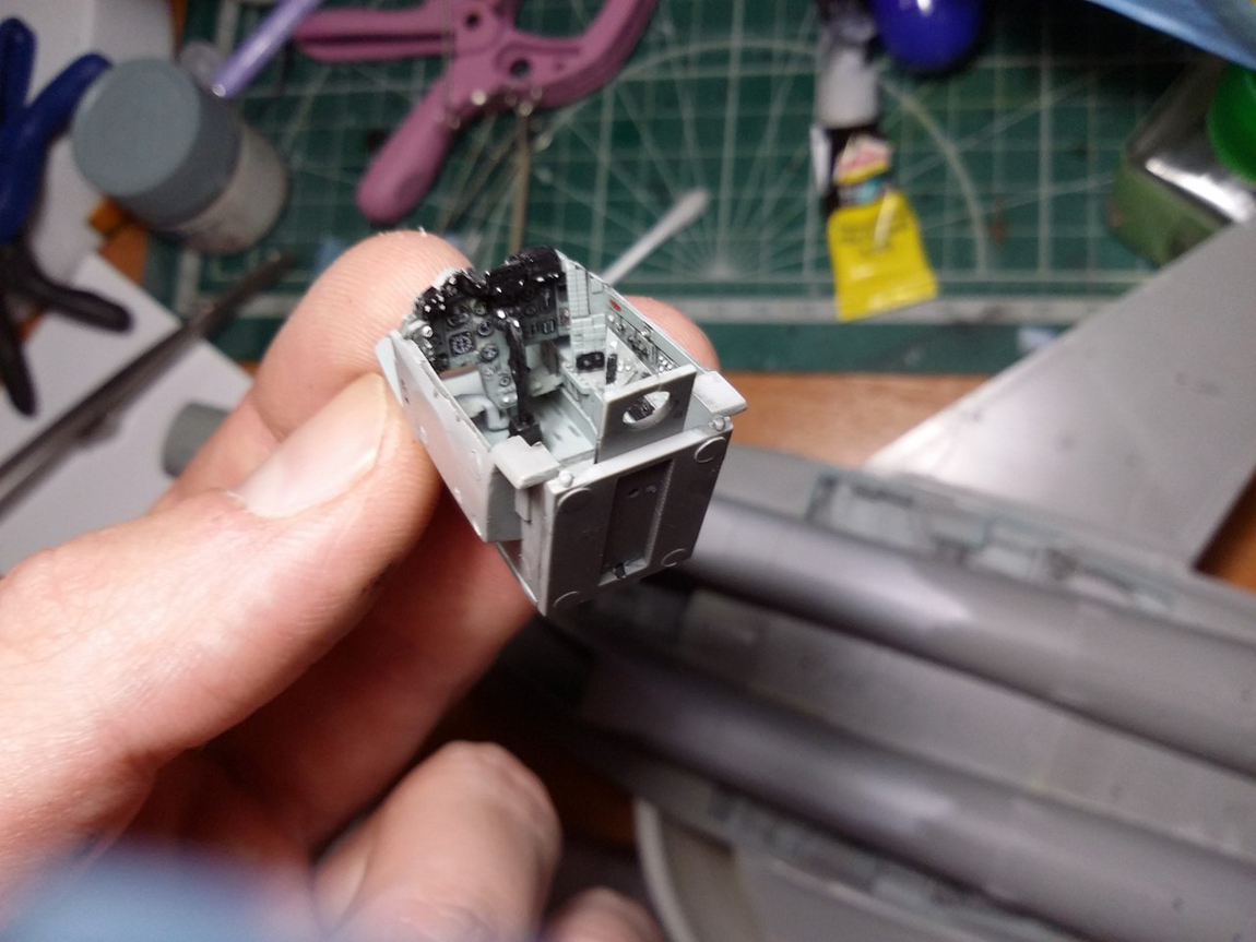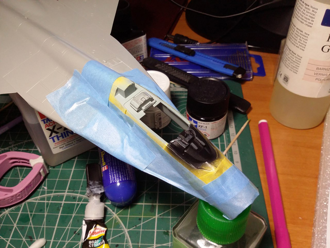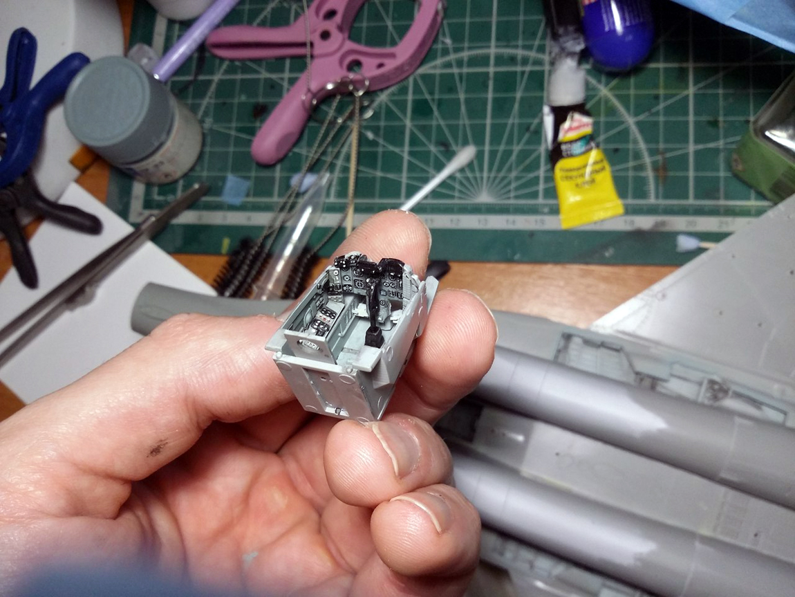 после этого я покрасил мелочевку (части кабины, ниш шасси, колеса и т д), собрал все до кучи. Ниши вклеил на свои места. Собрал кабину, каждый прибор дан декалью кстати. Сделал смывку. Вклеил кабину в фюзеляж. Верхние входы как и положено сделал закрытыми. Кстати вот теперь так выглядит канал ВЗ и как мы можем заметить двигатель установлен верно.