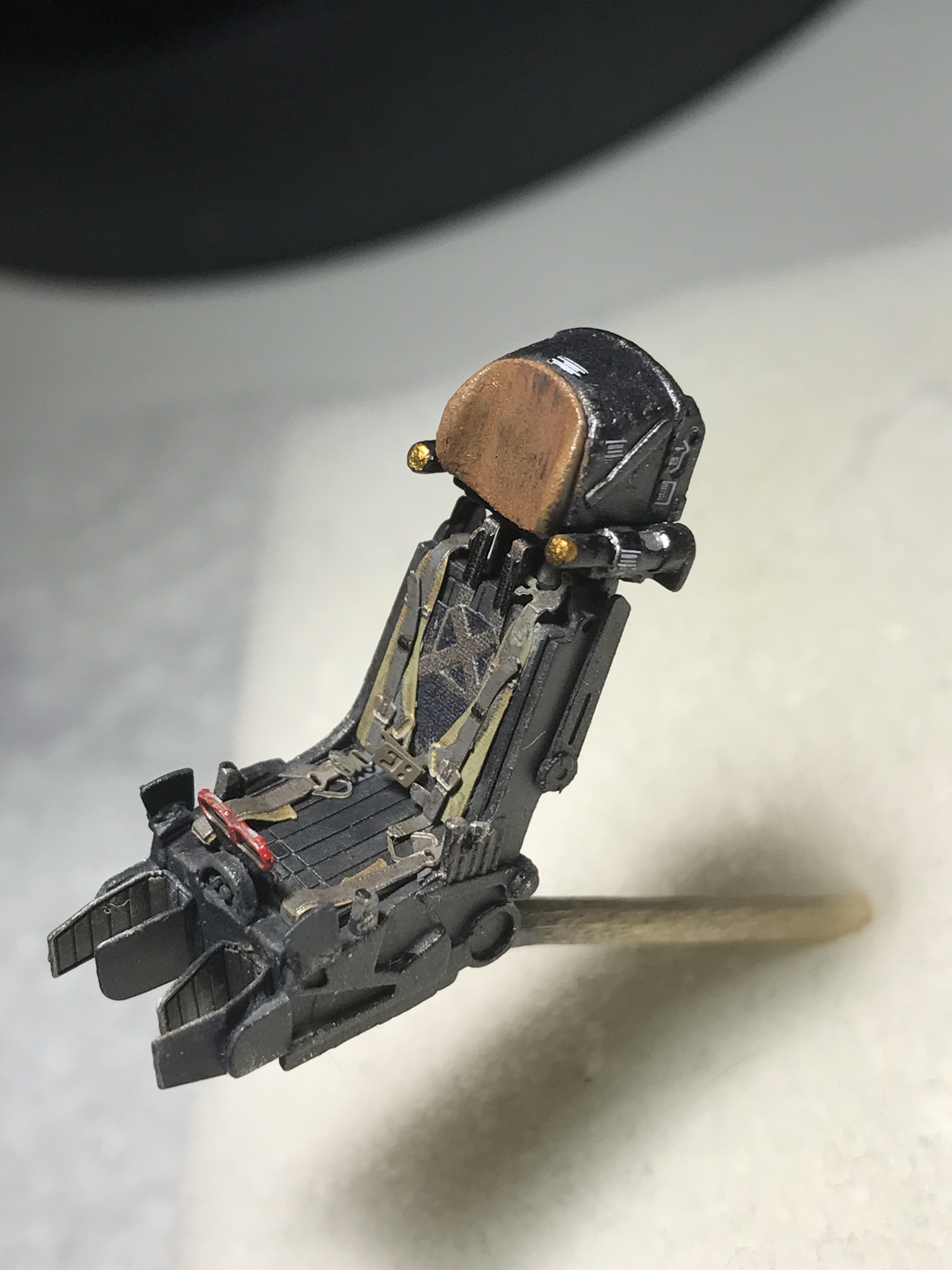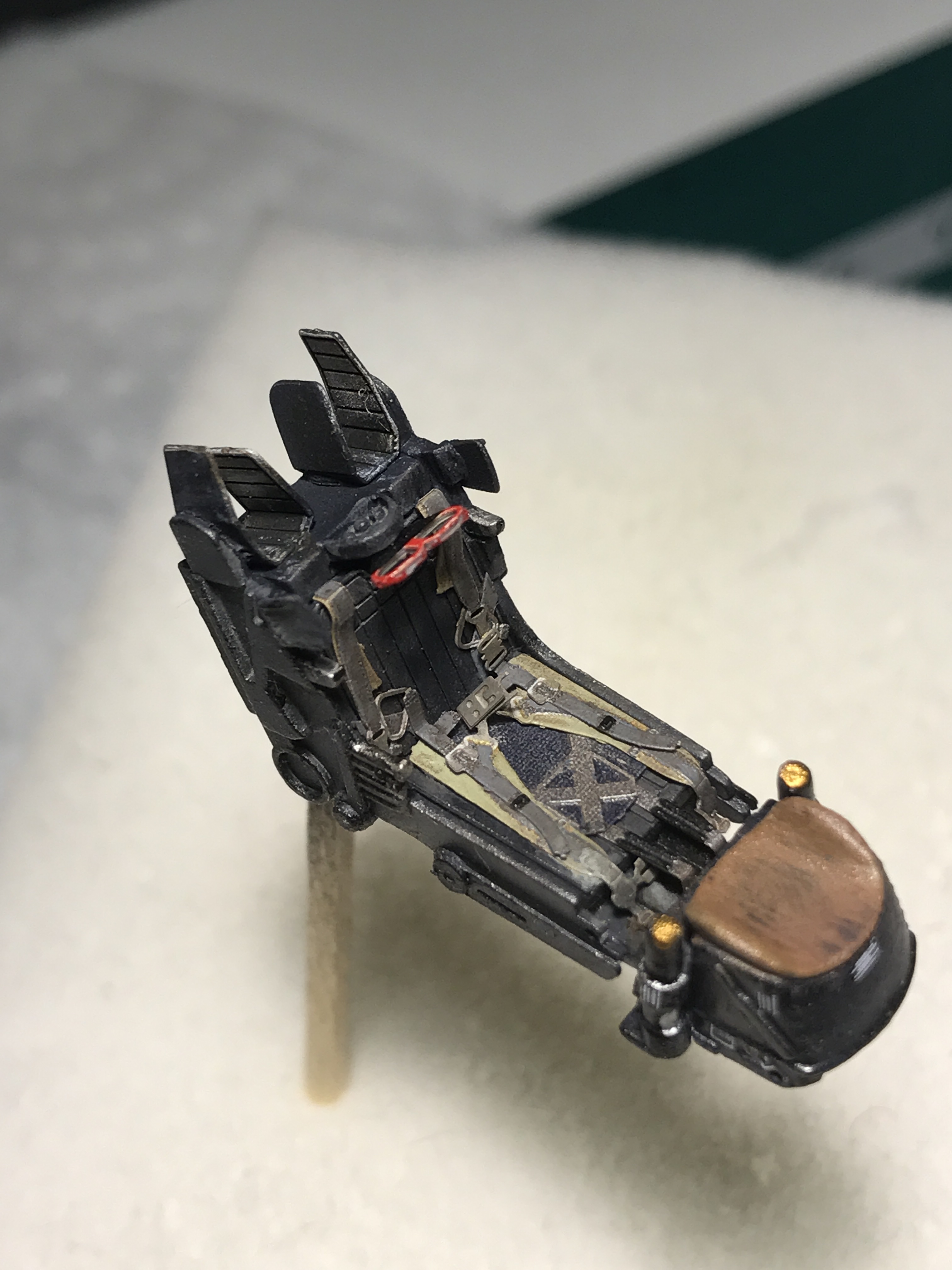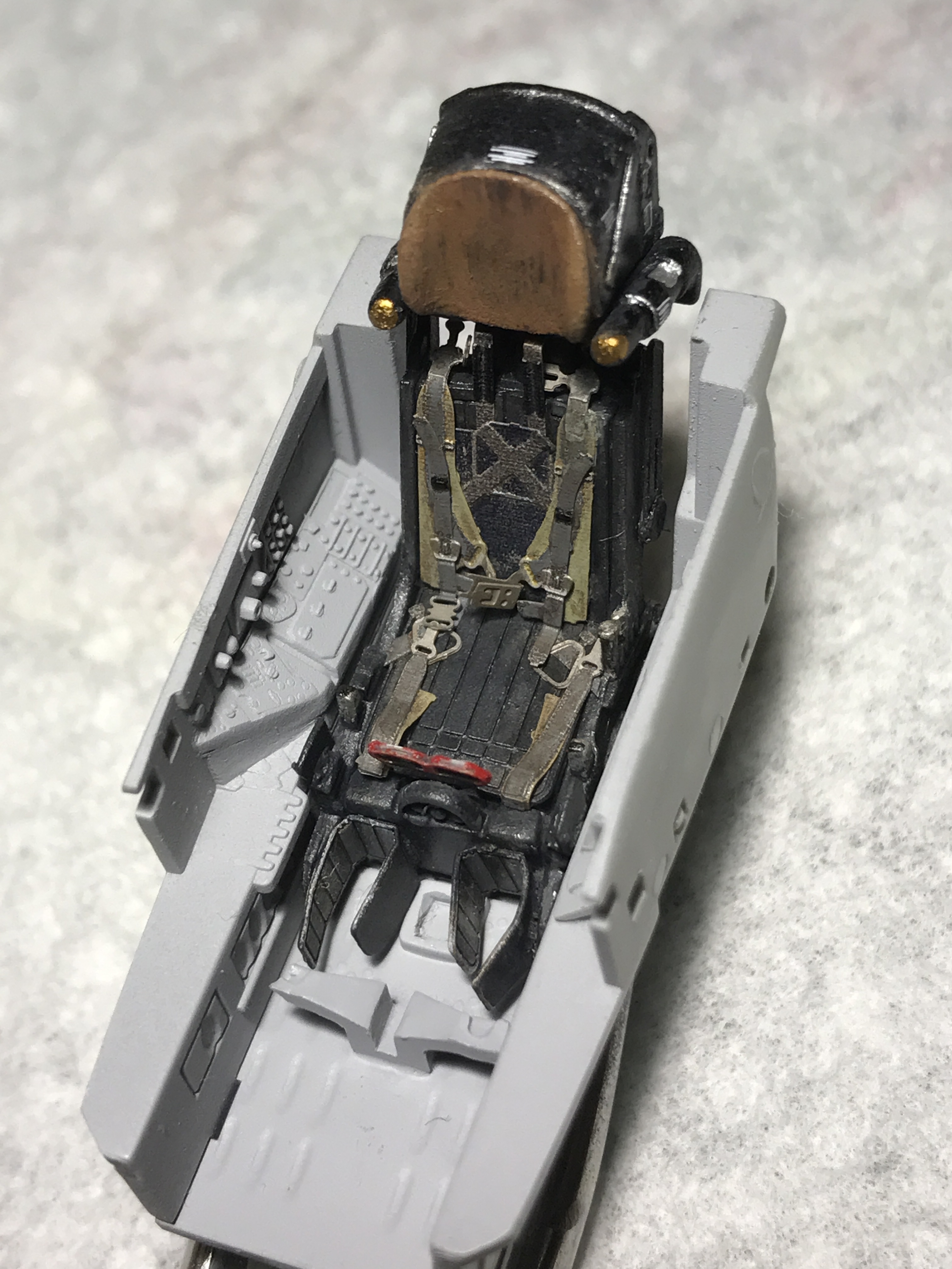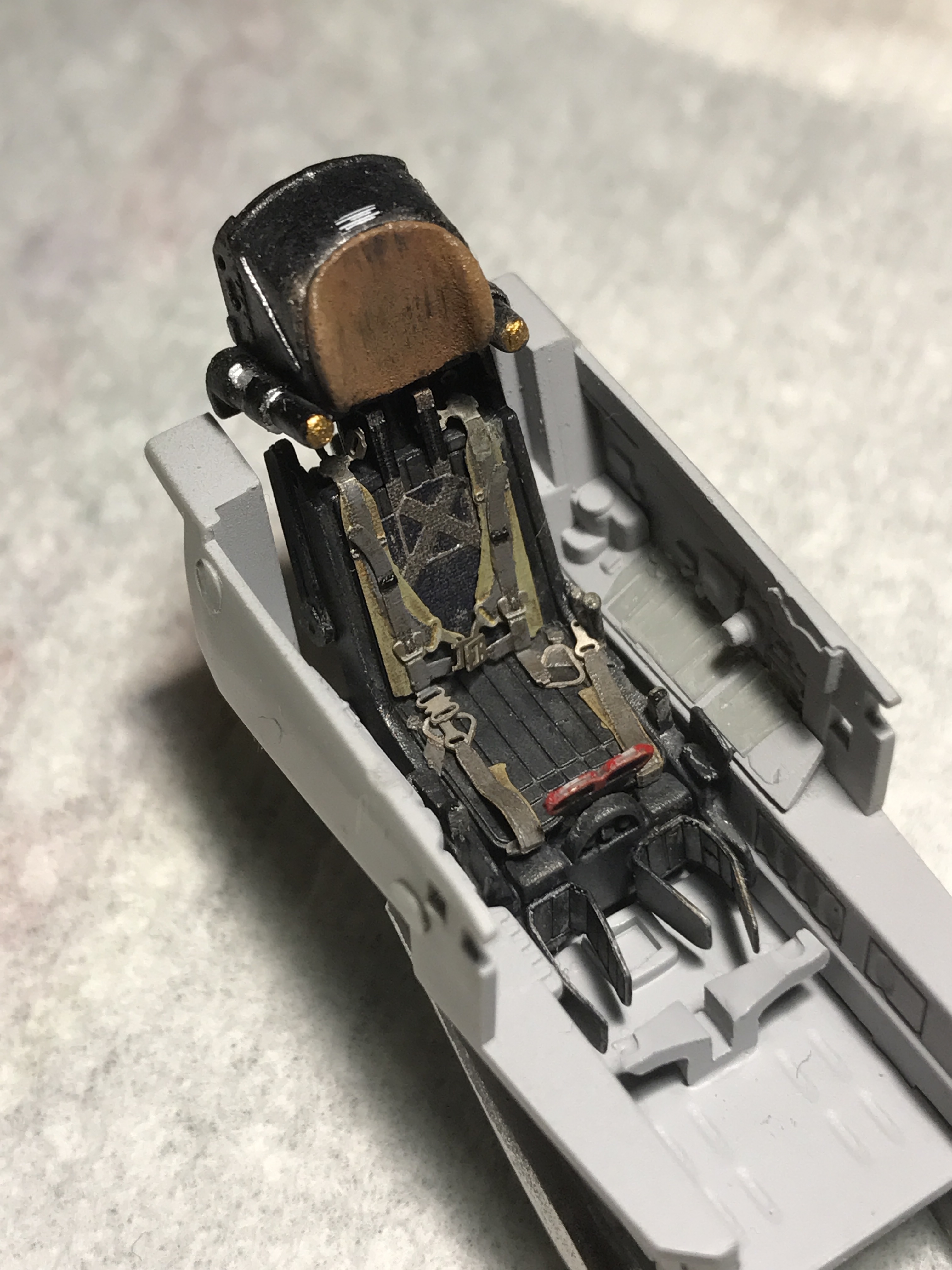 после этого я покрасил мелочевку (части кабины, ниш шасси, колеса и т д), собрал все до кучи. Ниши вклеил на свои места. Собрал кабину, каждый прибор дан декалью кстати. Сделал смывку. Вклеил кабину в фюзеляж. Верхние входы как и положено сделал закрытыми. Кстати вот теперь так выглядит канал ВЗ и как мы можем заметить двигатель установлен верно.