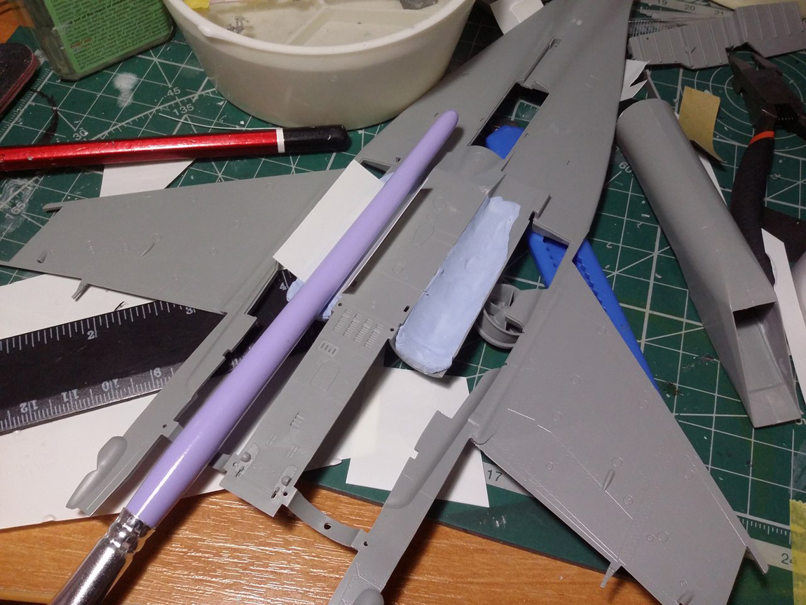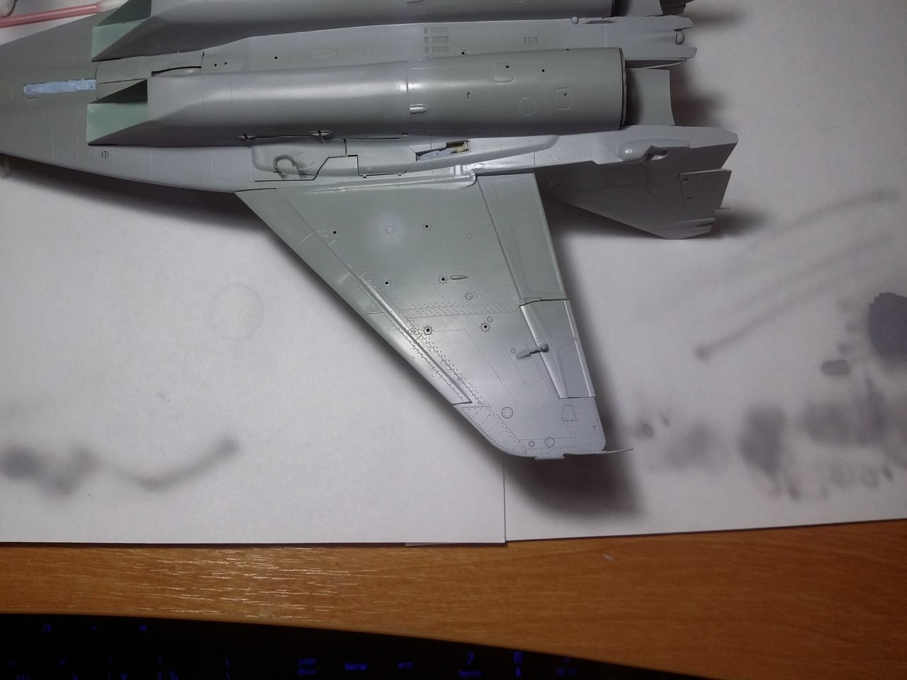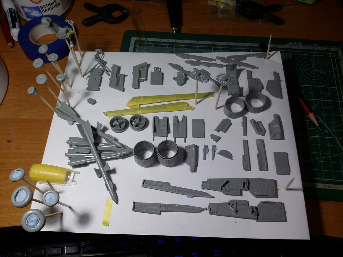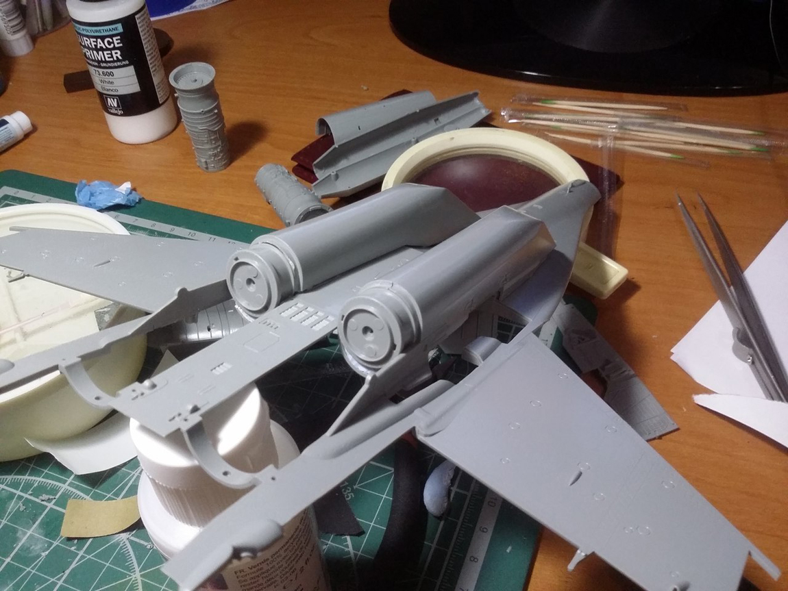Привет всем, продолжаю стройку. Грунтовать модель не буду полностью, потому что на консолях крыла и килях довольно мелкая не глубокая клепка, очень не хочется ее потерять. Поэтому прошелся грунтом по менее болезненным для расшивки местам, а также по проблемным. Выявилось несколько косяков, будем исправлять.