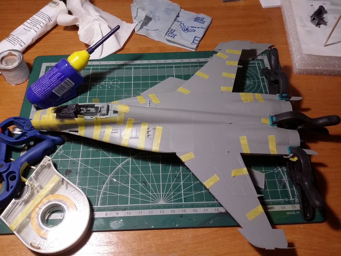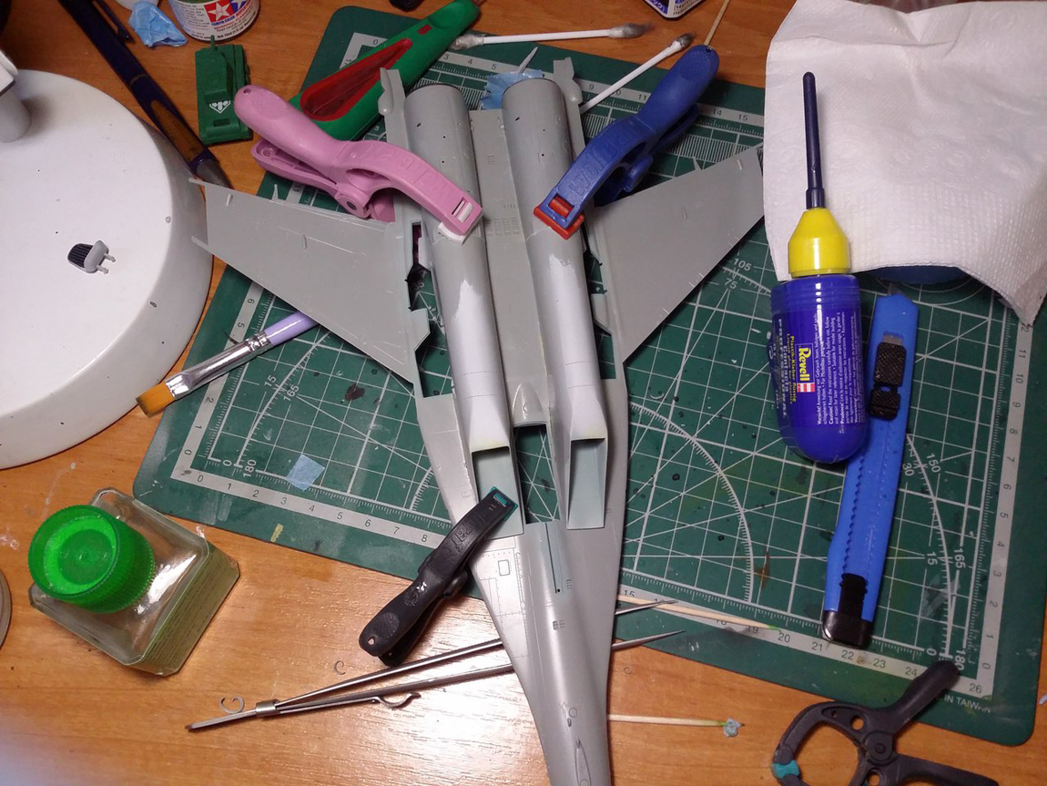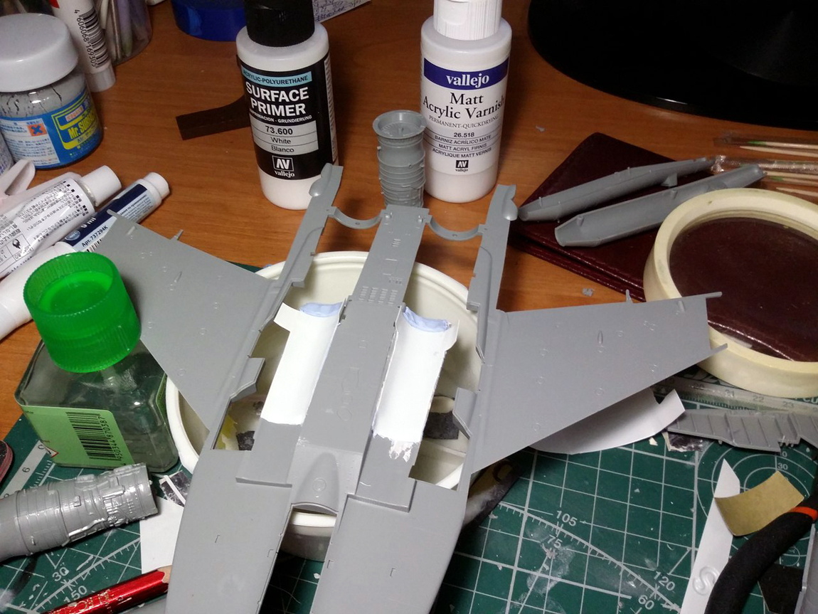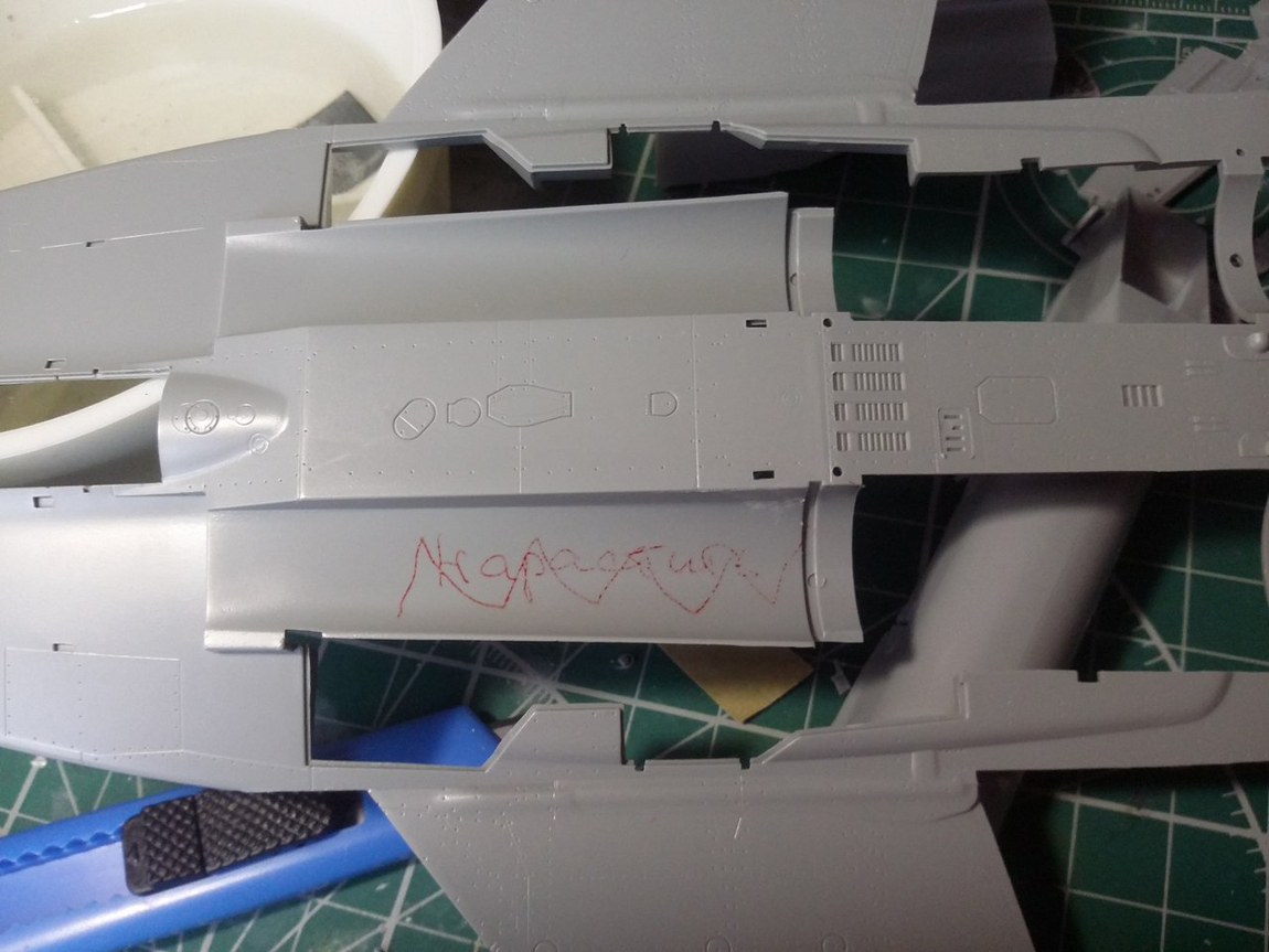 Привет всем, продолжаю стройку. Грунтовать модель не буду полностью, потому что на консолях крыла и килях довольно мелкая не глубокая клепка, очень не хочется ее потерять. Поэтому прошелся грунтом по менее болезненным для расшивки местам, а также по проблемным. Выявилось несколько косяков, будем исправлять.