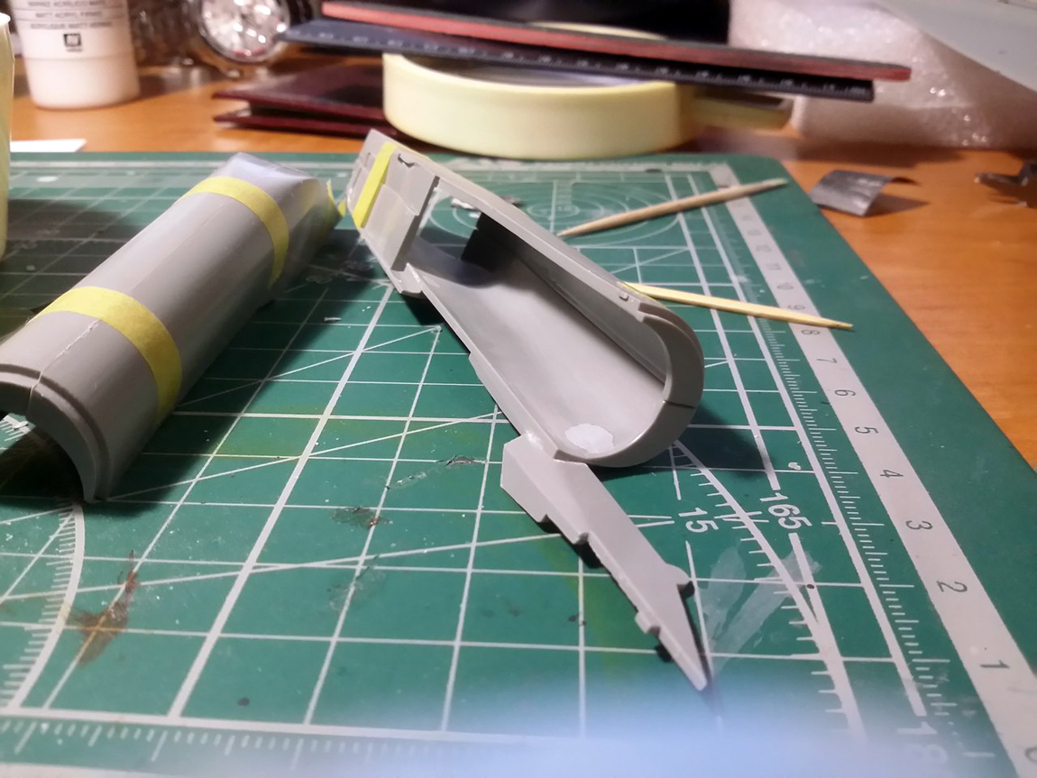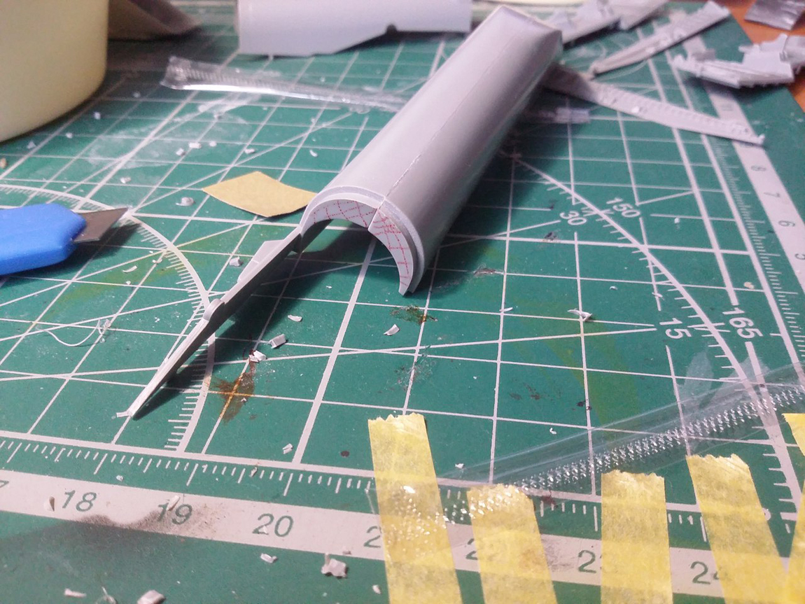 Здесь красным указал область, которую необходимо нарастить на жюзеляже, далее сточил бормашинкой ступеньку на ВЗ, приложил к фюзеляжу. Видно теперь как канал приобрел овальную форму и облать работы.