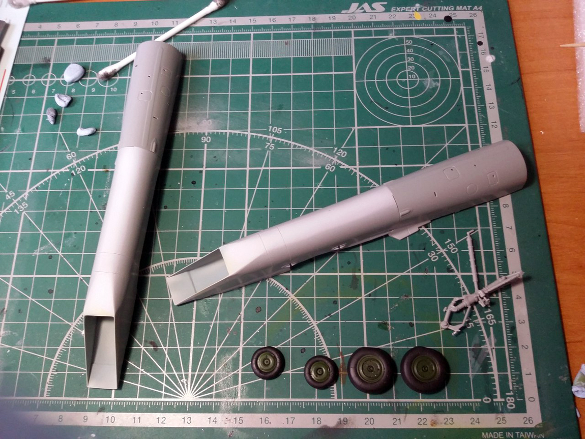 Далее состыковал две половины фюзеляжа, в конус вложил груз и тоже приклеил к конструкции. Приклеил кили. под килями нужно изрядно попотеть со стыковкой и шпаклевкой. Не забудьте про развал килей. Установил блоки ЛТЦ, тормозной щиток и контейнер ТП.