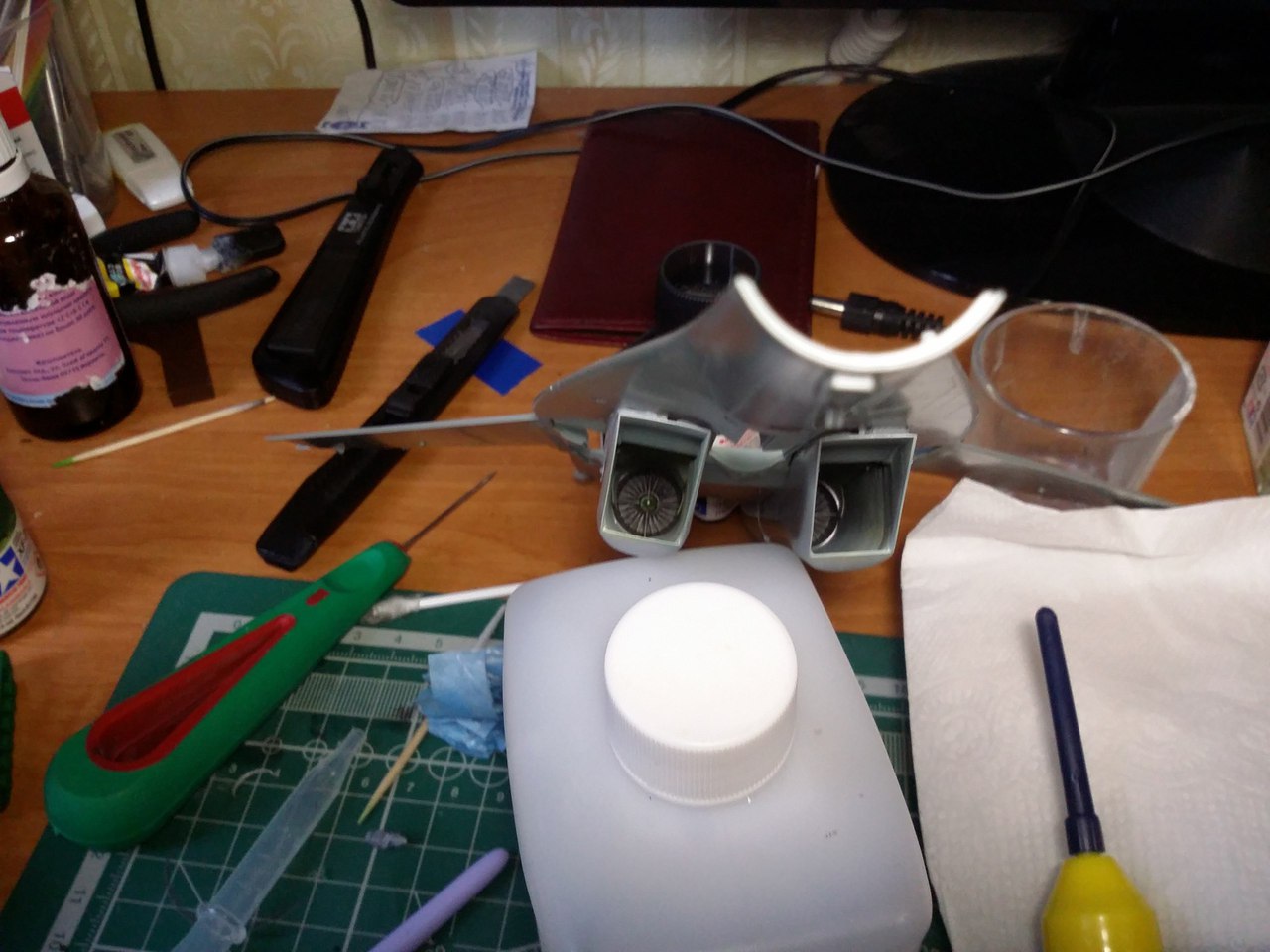 Поэтому сначала стыкуем ВЗ и капот вровень, пристыковываем эту конструкцию к нижней части фюзеляжа, оказываем любое давление, если образуется щель замазываем. Не забываем вставить двигатль.