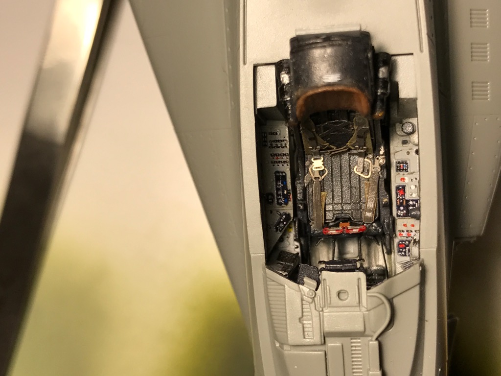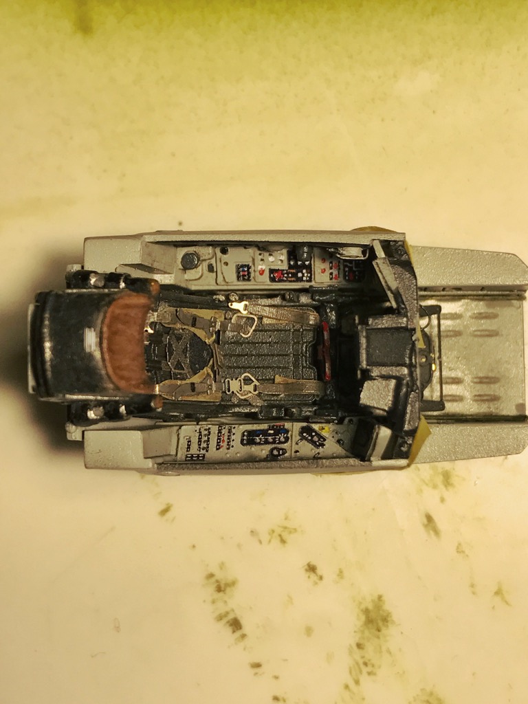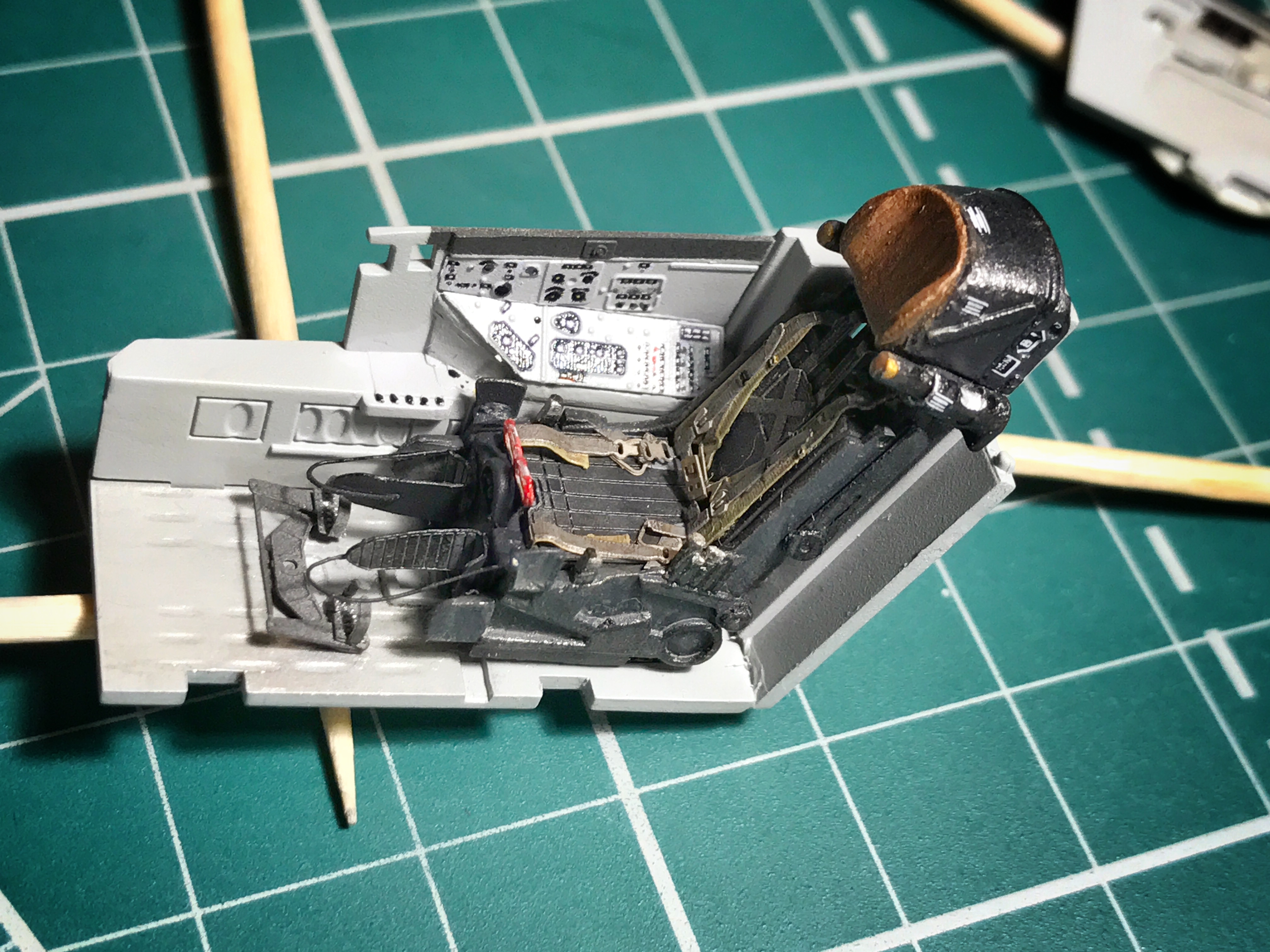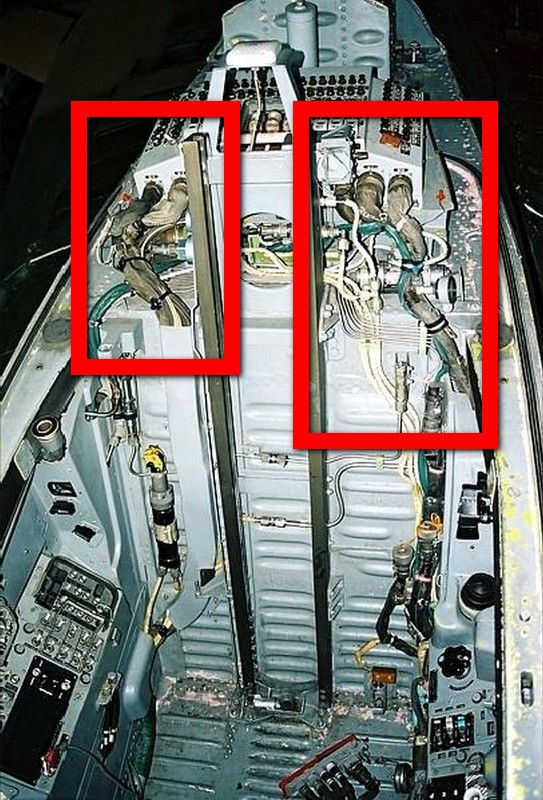 По кабине остались приборная доска, имитация кабельных трасс (сбоку-позади кресла, идущие к/от блоку автоматов... имитация по правому борту блока устройства автономного сброса фоноря, жгут кабелей по полу у стенок бортов (в районе педалей)... и все, пожалуй).