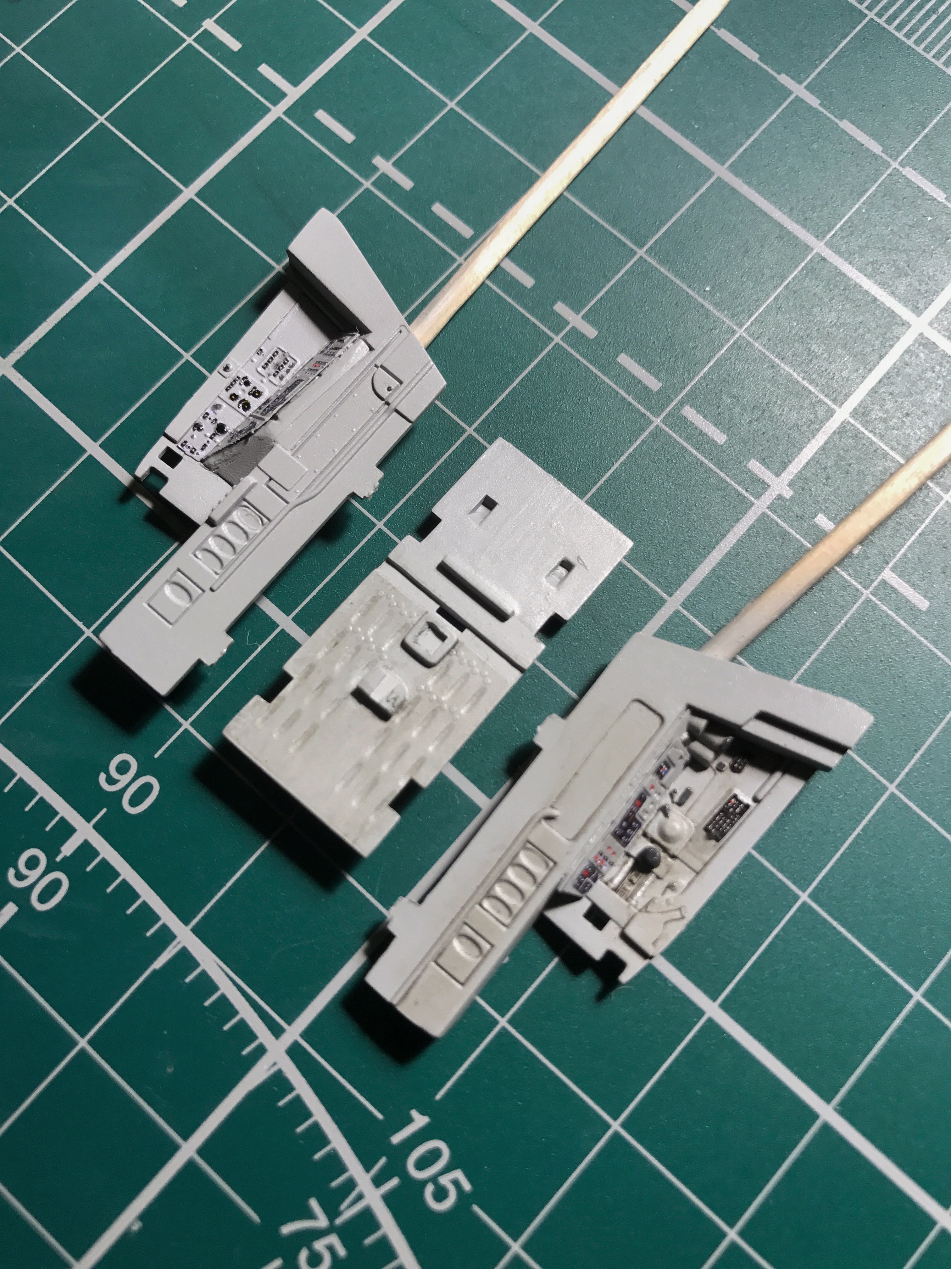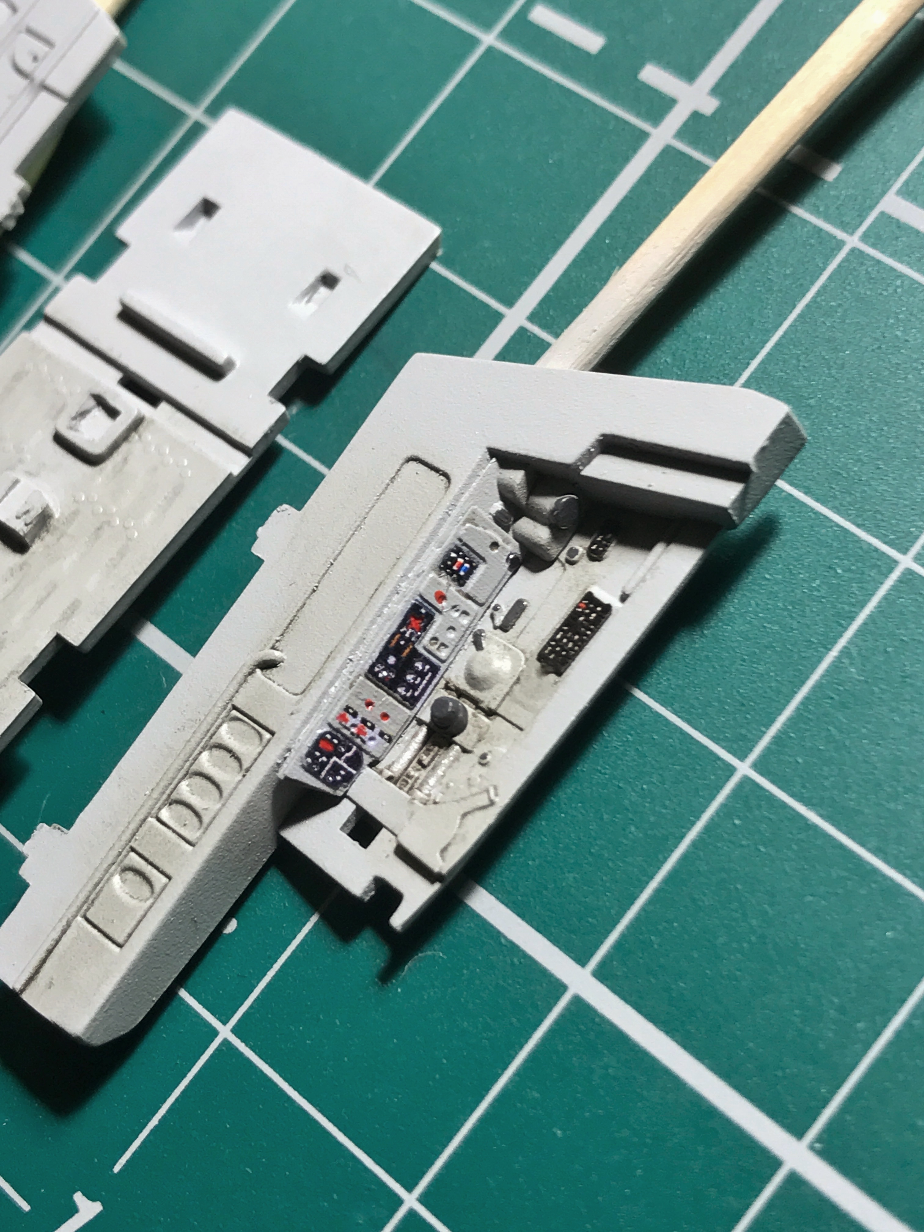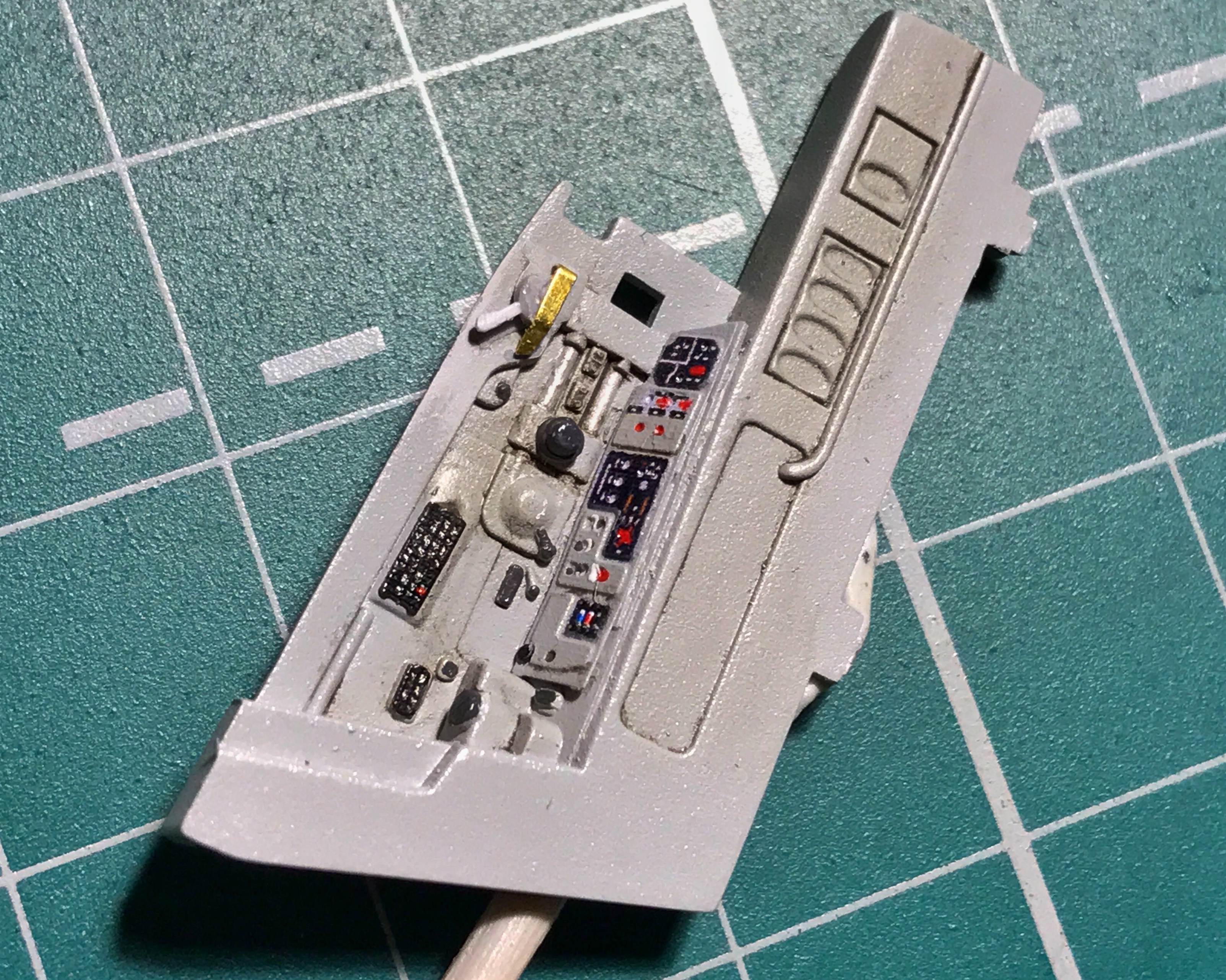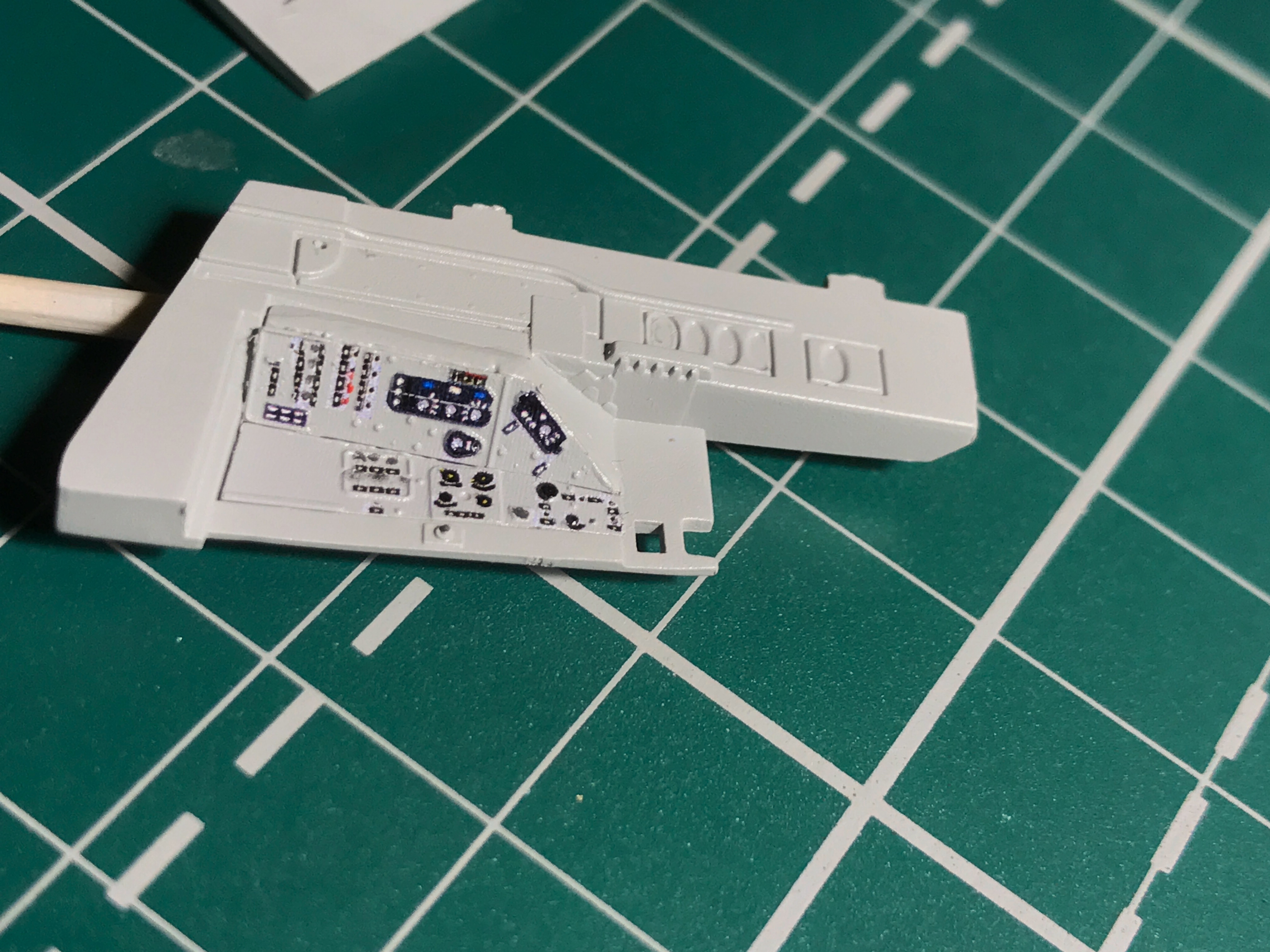 Не знаю, насколько показательны картинки (сделано на телефон, между сбором детей в школу и ужином). Но вот что получается, если заморочиться с перекраской травления (вроде, удалось сохранить и восстановить предусмотренные приборы). На правой панели и на полу немного отработал смывкой (чуть-чуть).