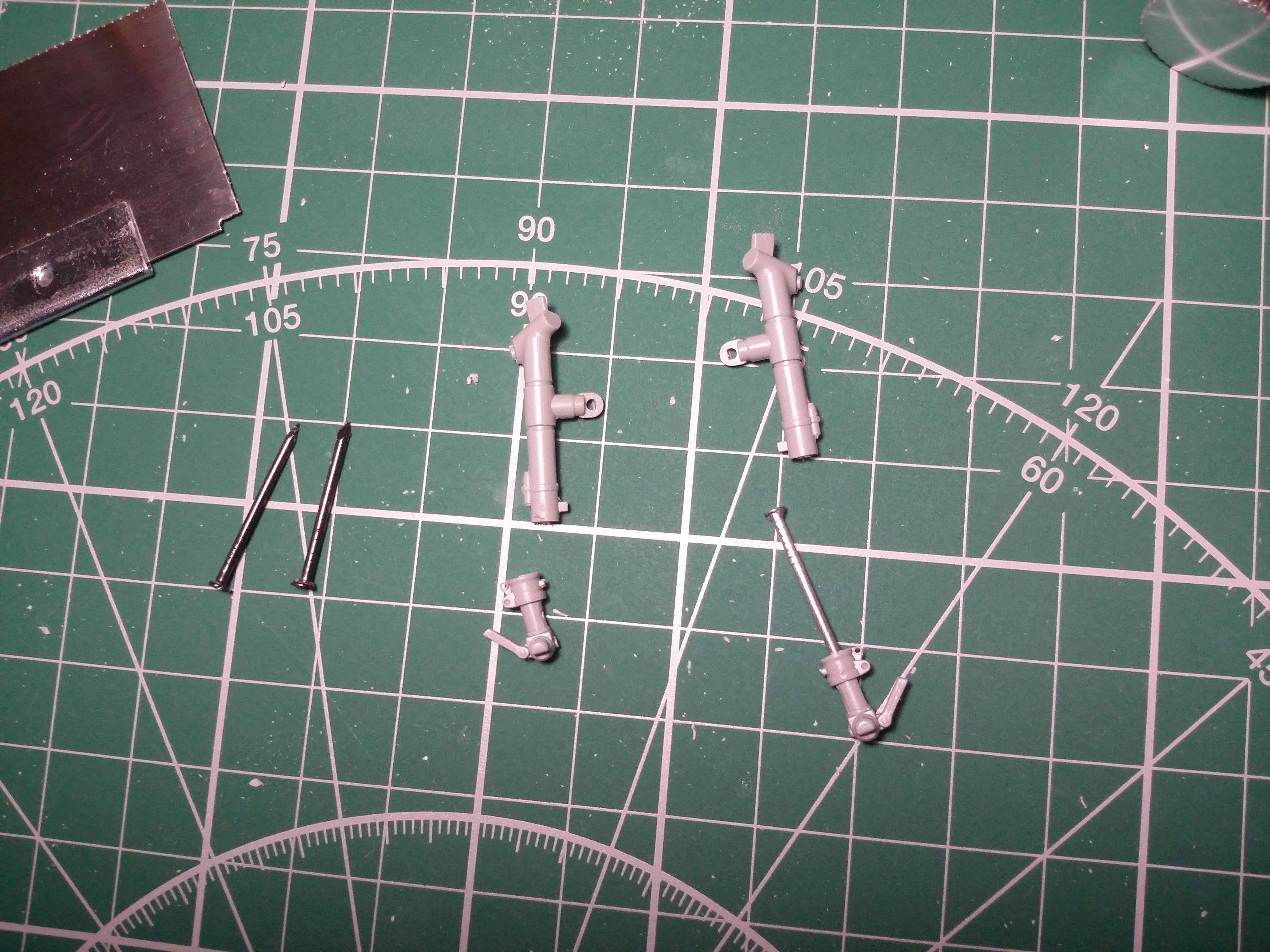 Сегодня пока занялся основными стойками шасси, решил их укоротить на 3 мм, чтобы у МиГаря был более привычный стояночный угол. Распилил пополам, просверлил отверстия, сращивать их буду предворительно вставив штифты из обрезанных сапожных гвоздиков. Аналогичные штифты вживил и в стабилизаторы.