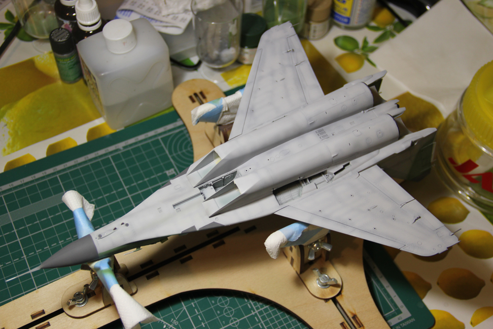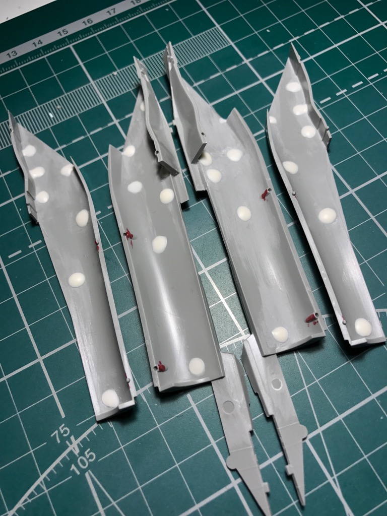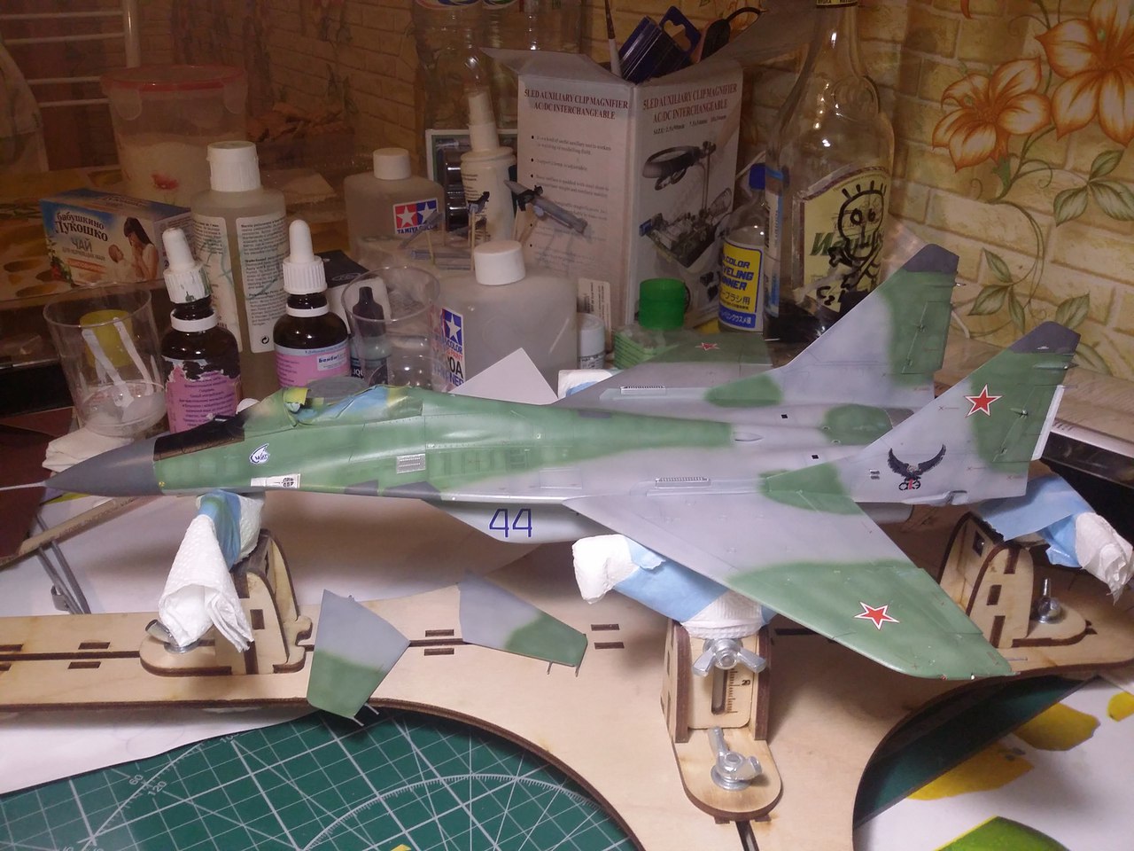 согласен с вами, наборные стекатели хотел поменять, а потом не стал, они хоть на них похожи, повторяют их форму, хотя попробую на следующем МиГ-29 9-13 их изготовить из игл, а концы развальцевать. Деки пока только приварил, возможно фильтром тон приубавлю в процессе, хотя порядочный техник всегда освежал звезды, номера бортовые и эмблему..