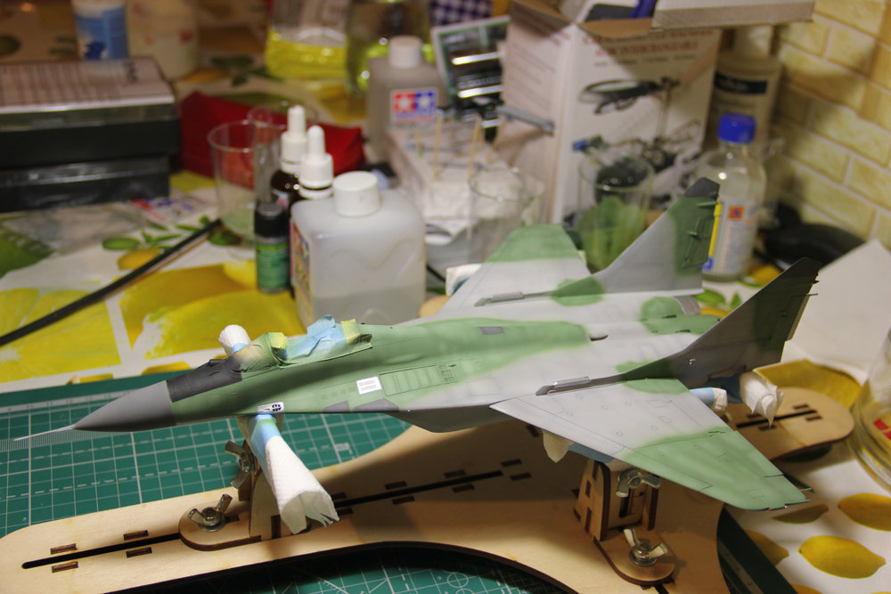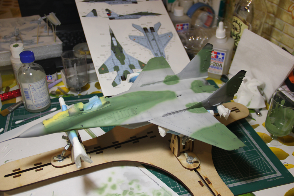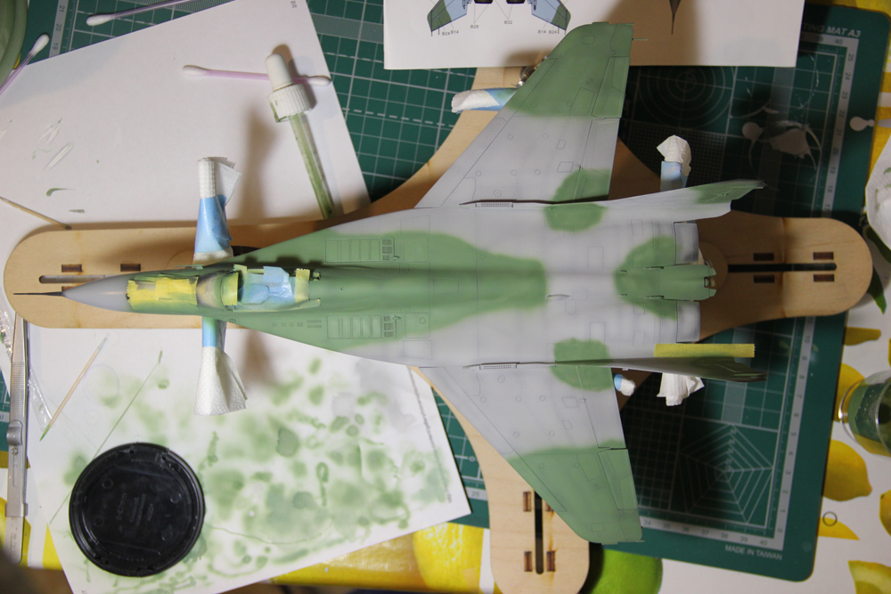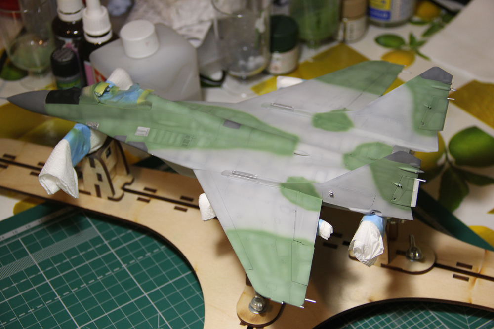 Привет всем. Продолжил сегодня стройку МиГарика, покрасил антибликовую полосу, конус, антенны и тд. ,высветлил немного зеленый, на кромке рулей направления нанес белые полосы как и на прототипе, единственное рули отличаются, на прототипе они были доработаны в полку пластинами , увеличивающие их площадь , а на модели уже заводские рули, учитывающие эту доработку, поэтому они отличаются немного, ну ничего. Осталось убрать некоторые косячки и можно задувать глянцевым лаком. Сегодня только заметил, что утерял один датчик температуры, ну ничего изготовим новый, плюс отвалились стекатели электричества на законцовках крыла, которые всю сборку мешали, будем исправлять. Пришли краски АКАН для покраски сопел, на днях буду экспериментировать, аканом еще не пользовался.