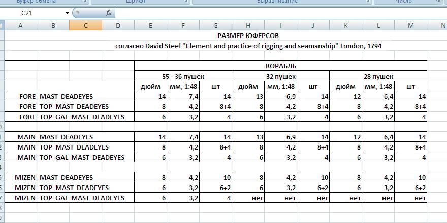 - наткнулся на следующую табличку Размеры юферсов, разделив данные в таблице на 2 и допустив, что юферсы должны быть меньше 2,5 мм тоже можно получить и наверное надо делать все такими. Тогда есть следующий вопрос, для бизань-мачты надо делать 1.75мм? На всех известных мне изображениям и моделях Баунти юферсы одинаковые...