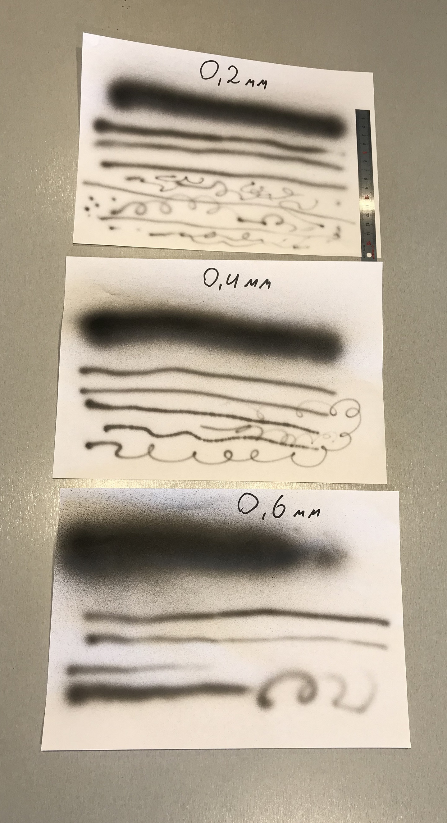 На 0.2 мм , в начале проблем не возникало никаких , всё прекрасно проходило . Однако после 2 мл продутого материала , начиная с сопла 0.4. в конце , начались проблемы с подачей краски.